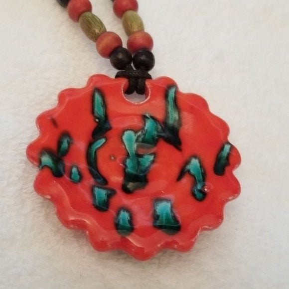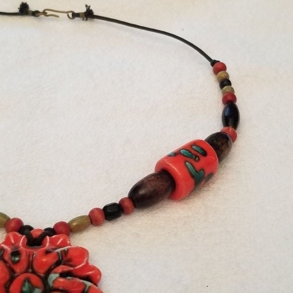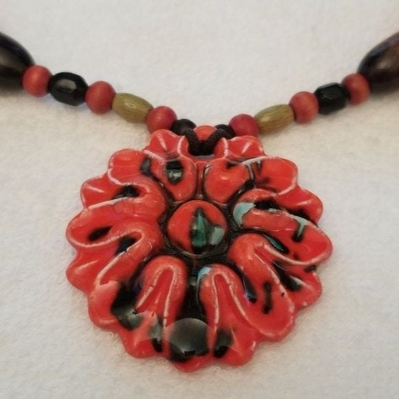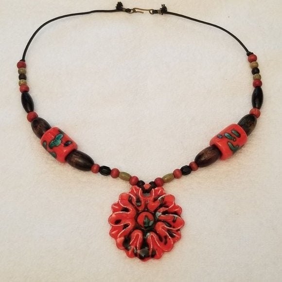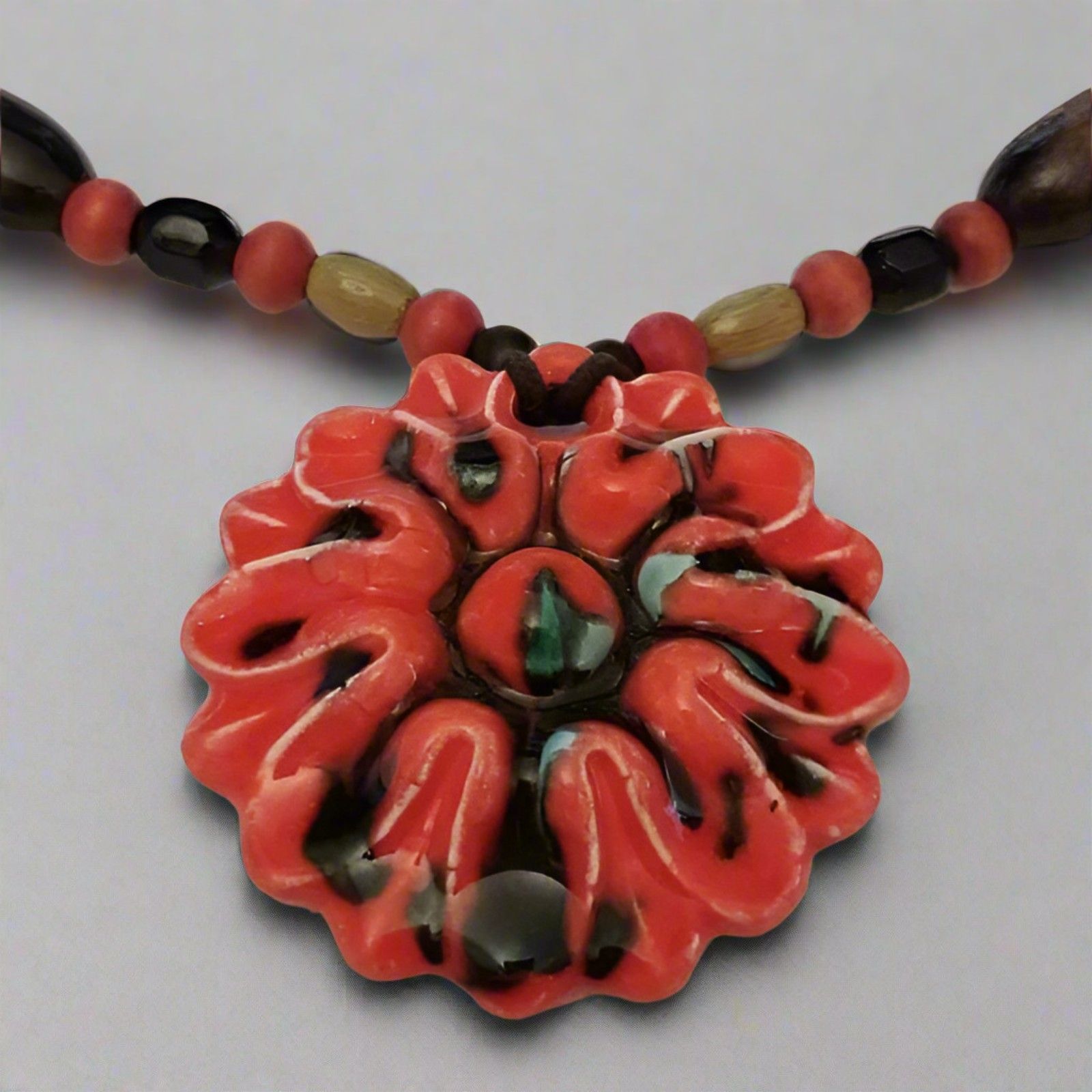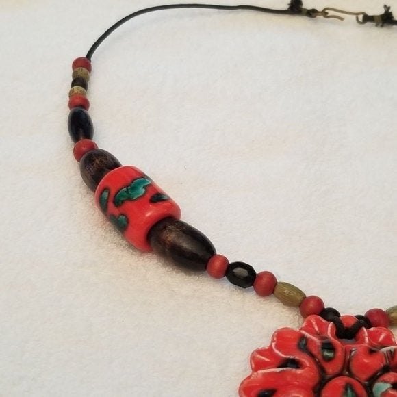 The red pieces look to be made from glass or ceramic, has wooden beads