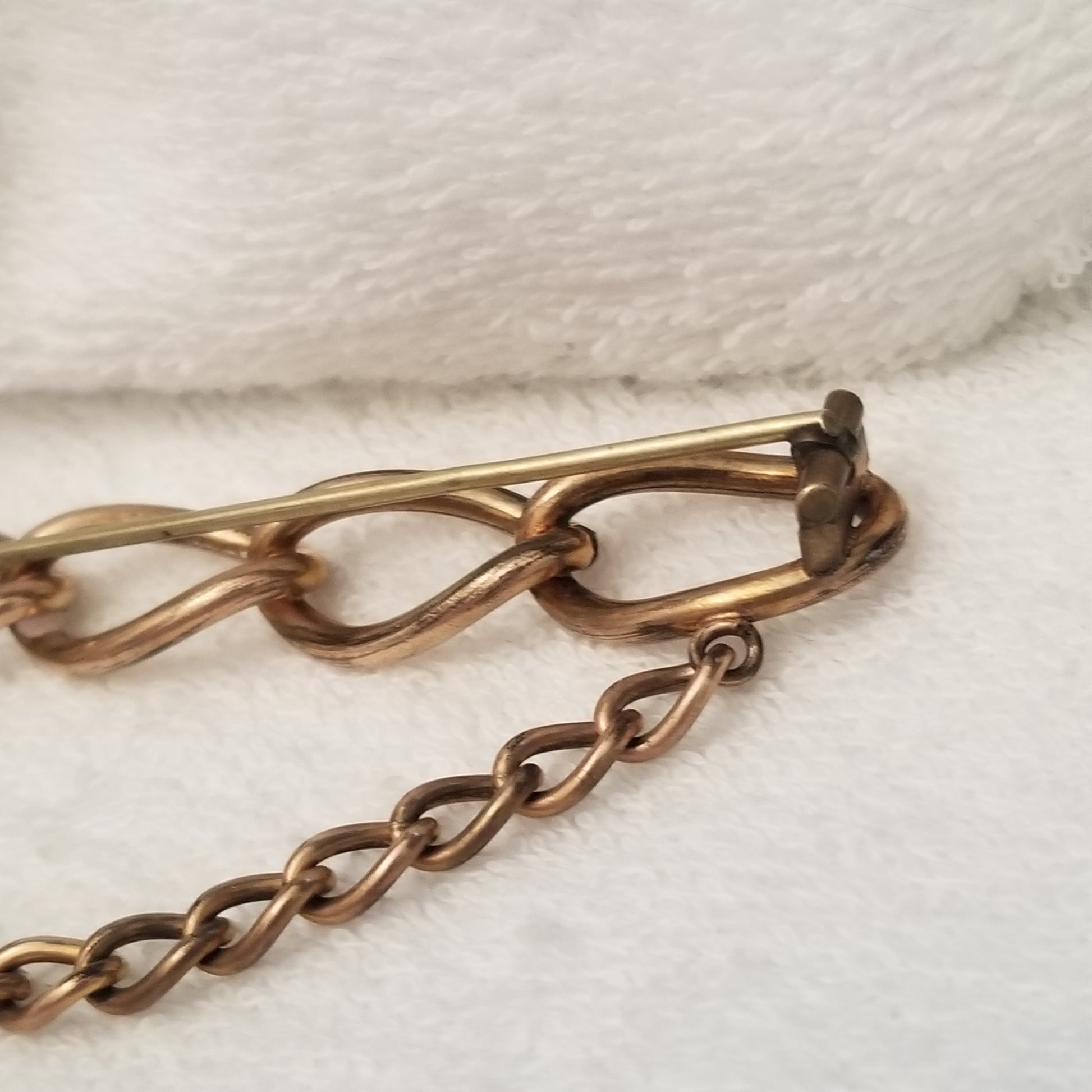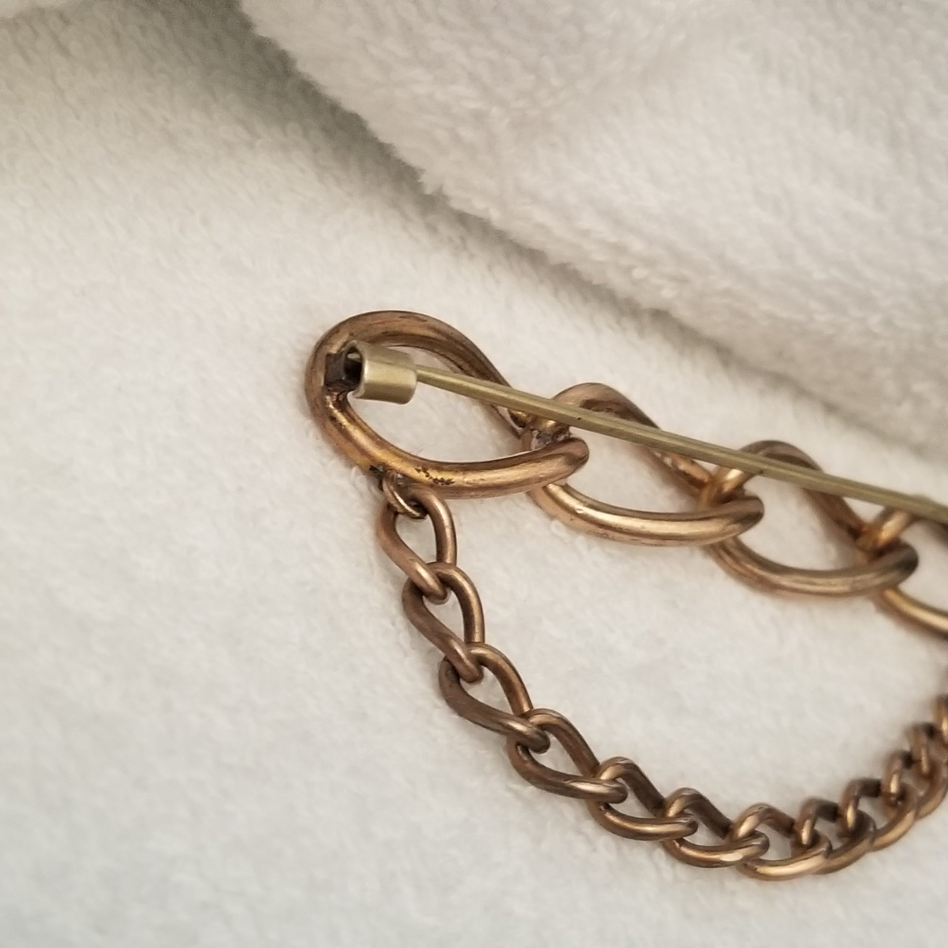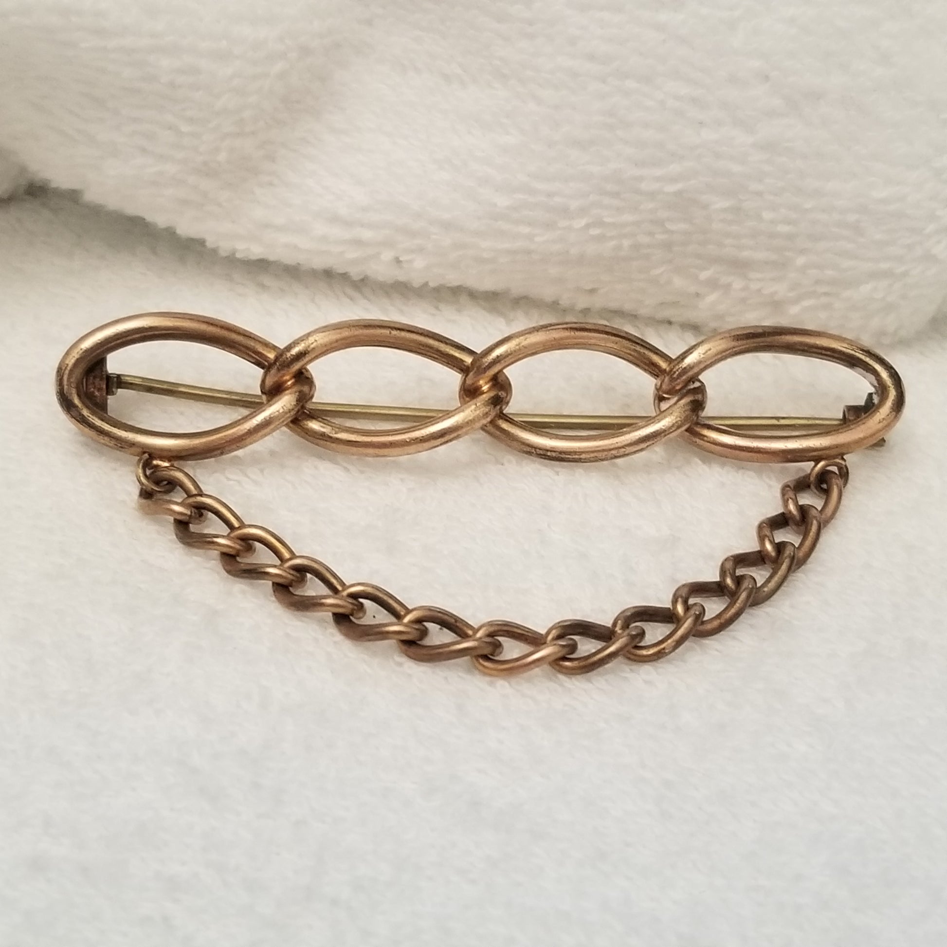 These chain style brooches were popular during the 1900s, the interlocking chains had a "United We Stand" during the suffrage movement. Brooch has the hinged C clasp, which places this brooch