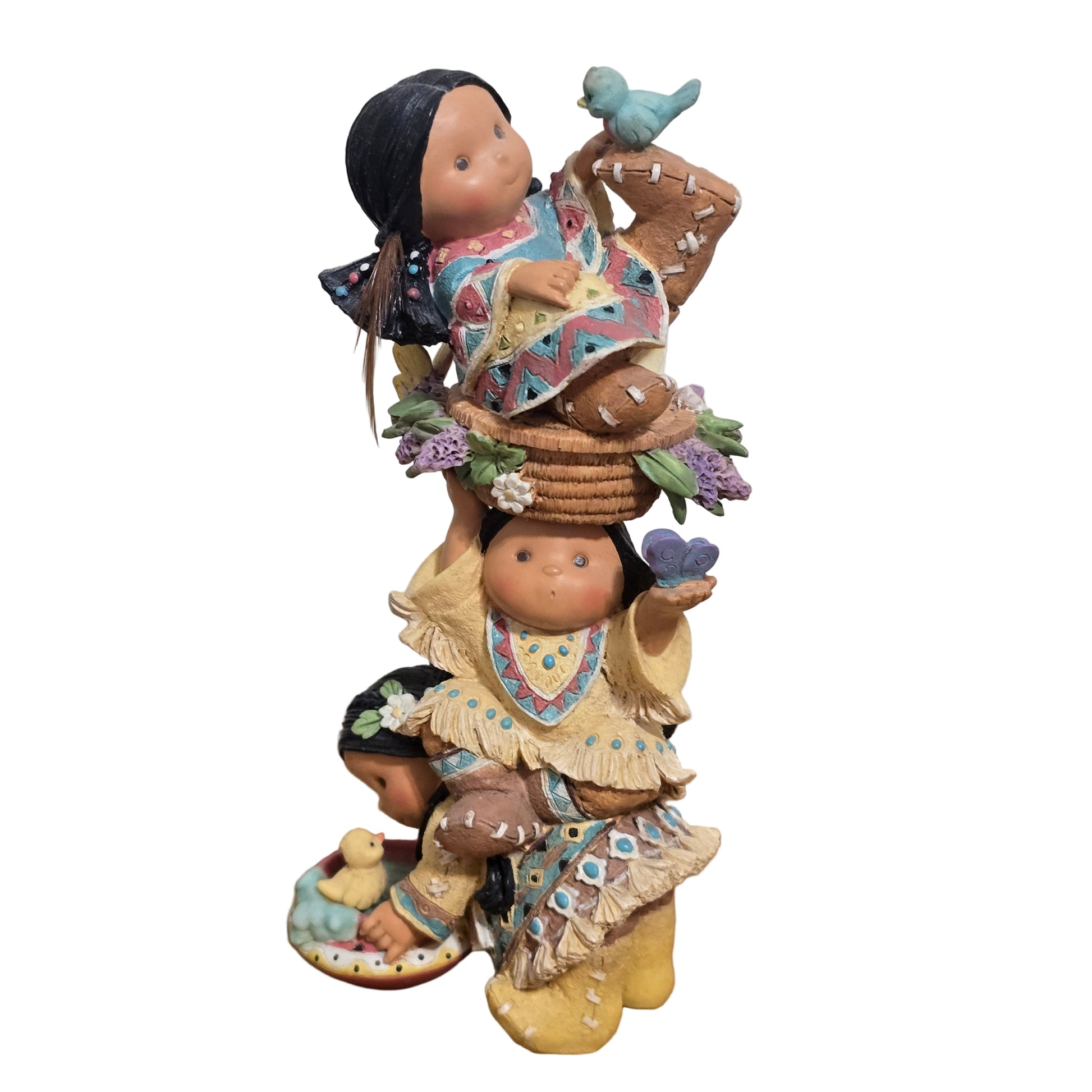 Bring home a charming piece of Friends of the Feather history with this 1995 Enesco figurine, featuring three girls stacked playfully as they reach for a bird, a butterfly, and a duckling. Designed in the classic Karen Hahn style, this piece is filled with personality, textured detail, and vibrant Southwestern colors.