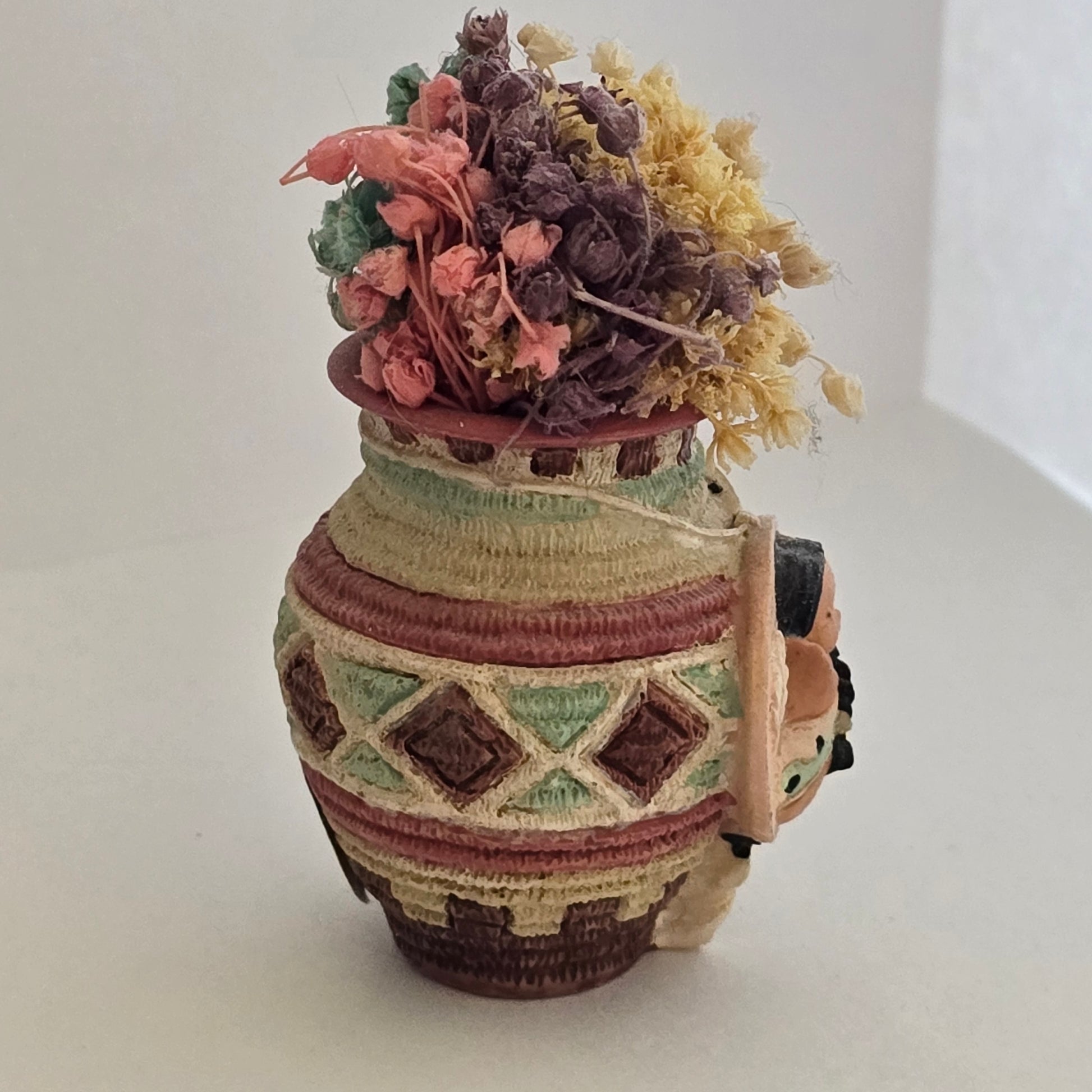 This beautiful 1997 Enesco Friends of the Feather vase figurine, designed by Karen Hahn, features a hand-painted Southwestern-style vase adorned with a small girl’s portrait medallion and filled with dried florals. The detailed weaving texture and pastel color palette make it a charming addition to any collection.