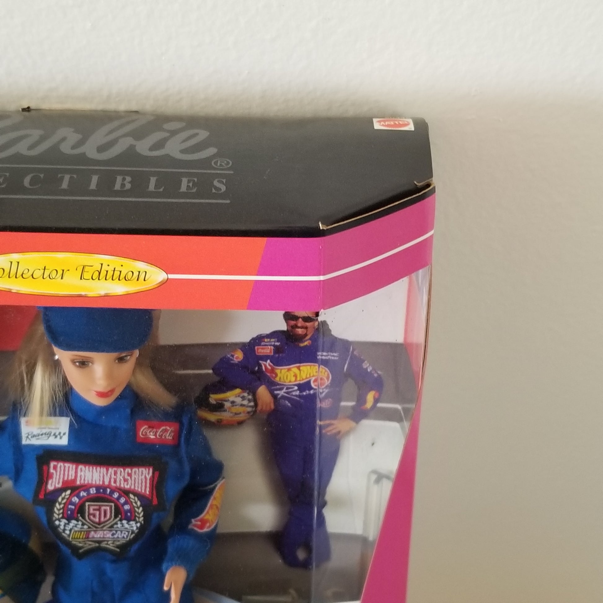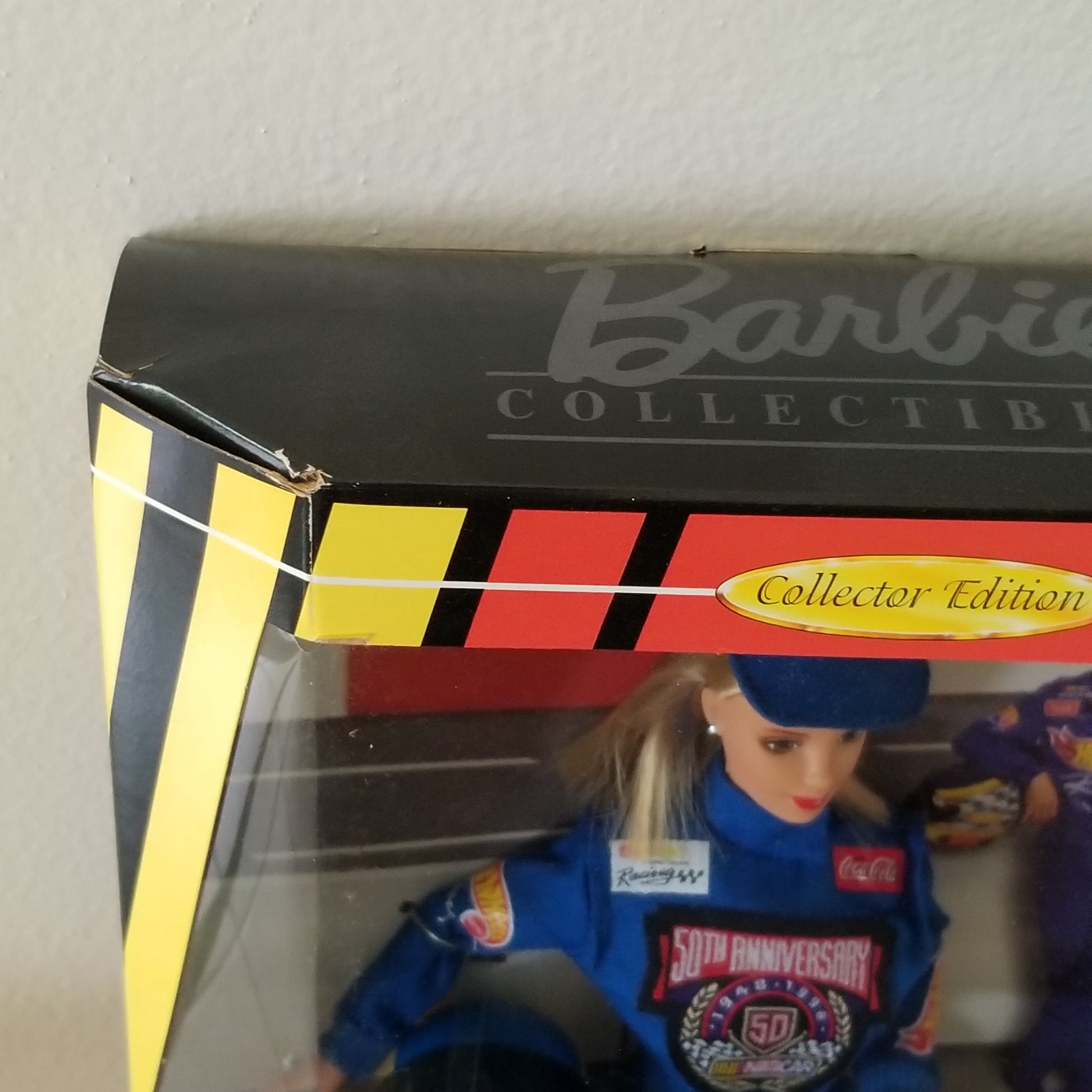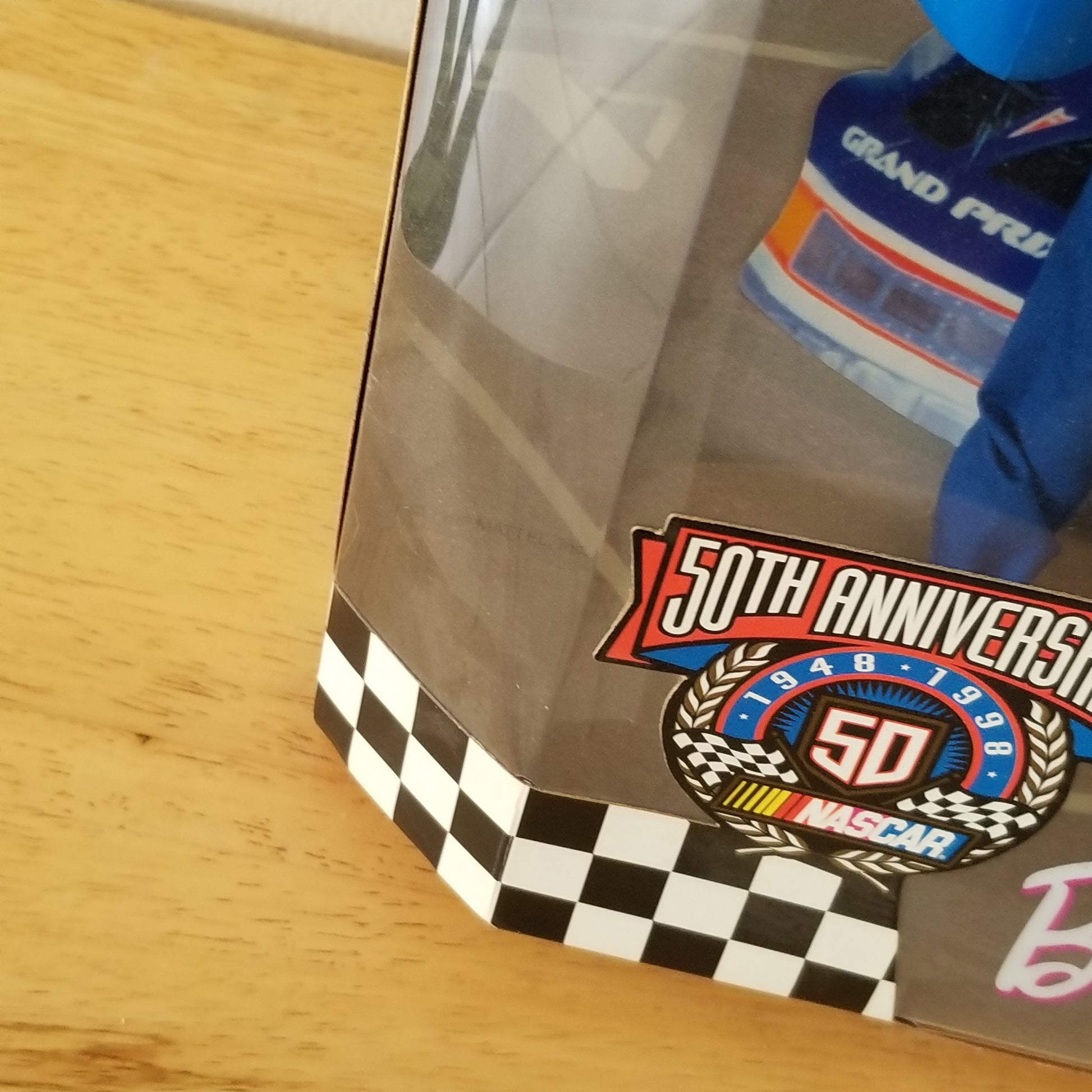 1998 Nascar 50th Anniversary Barbie Box is not in perfect condition. Has some rips and the clear plastic has some denting. cardboard part has some creasing, rips and is warped on top and bottom. Doll has not been removed from the box. perfect Christmas gift