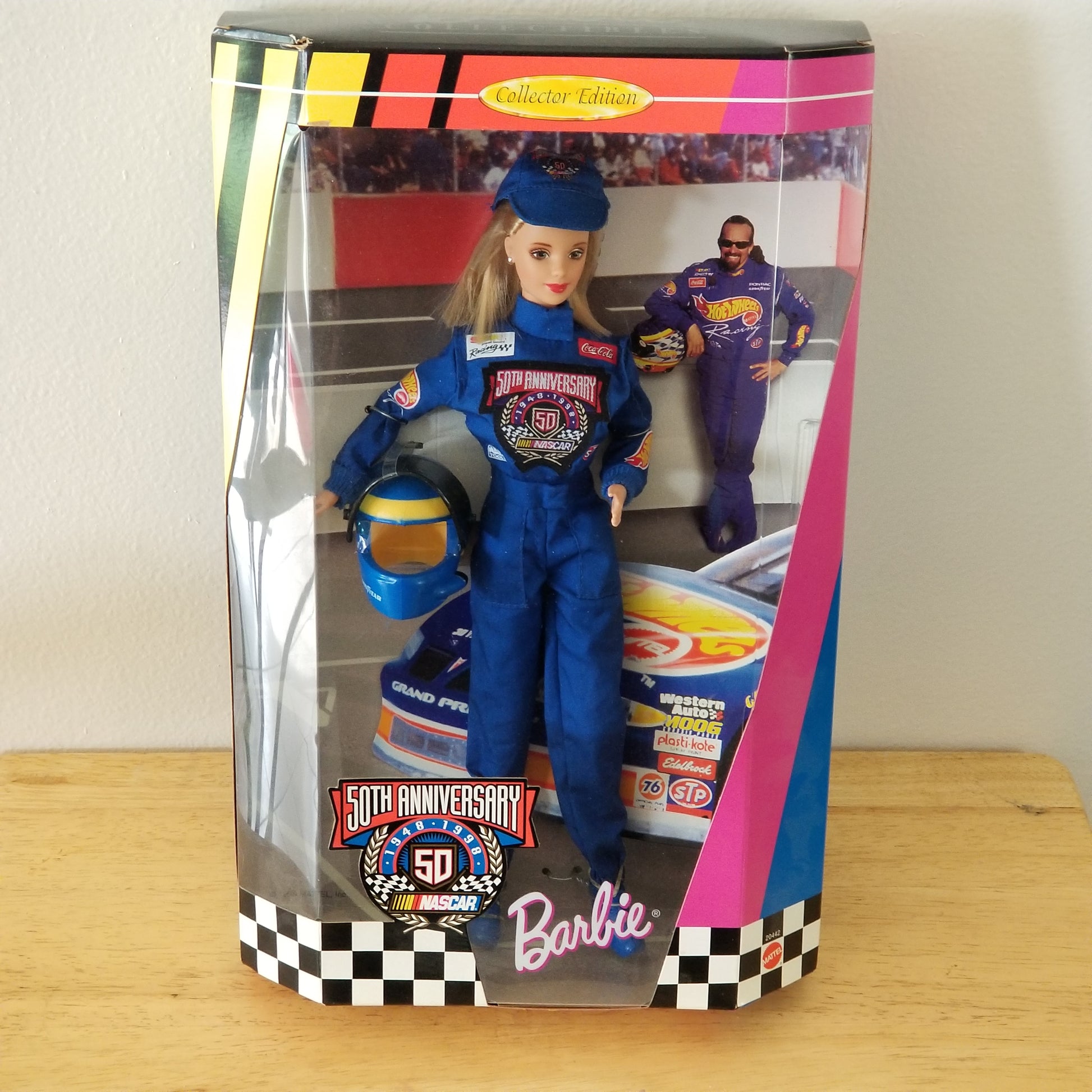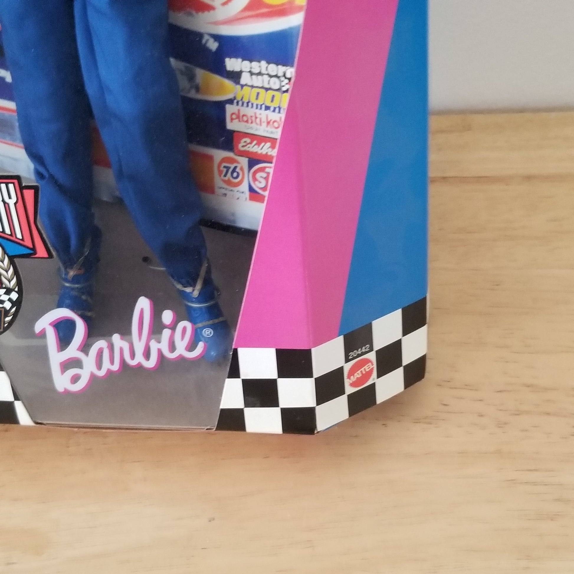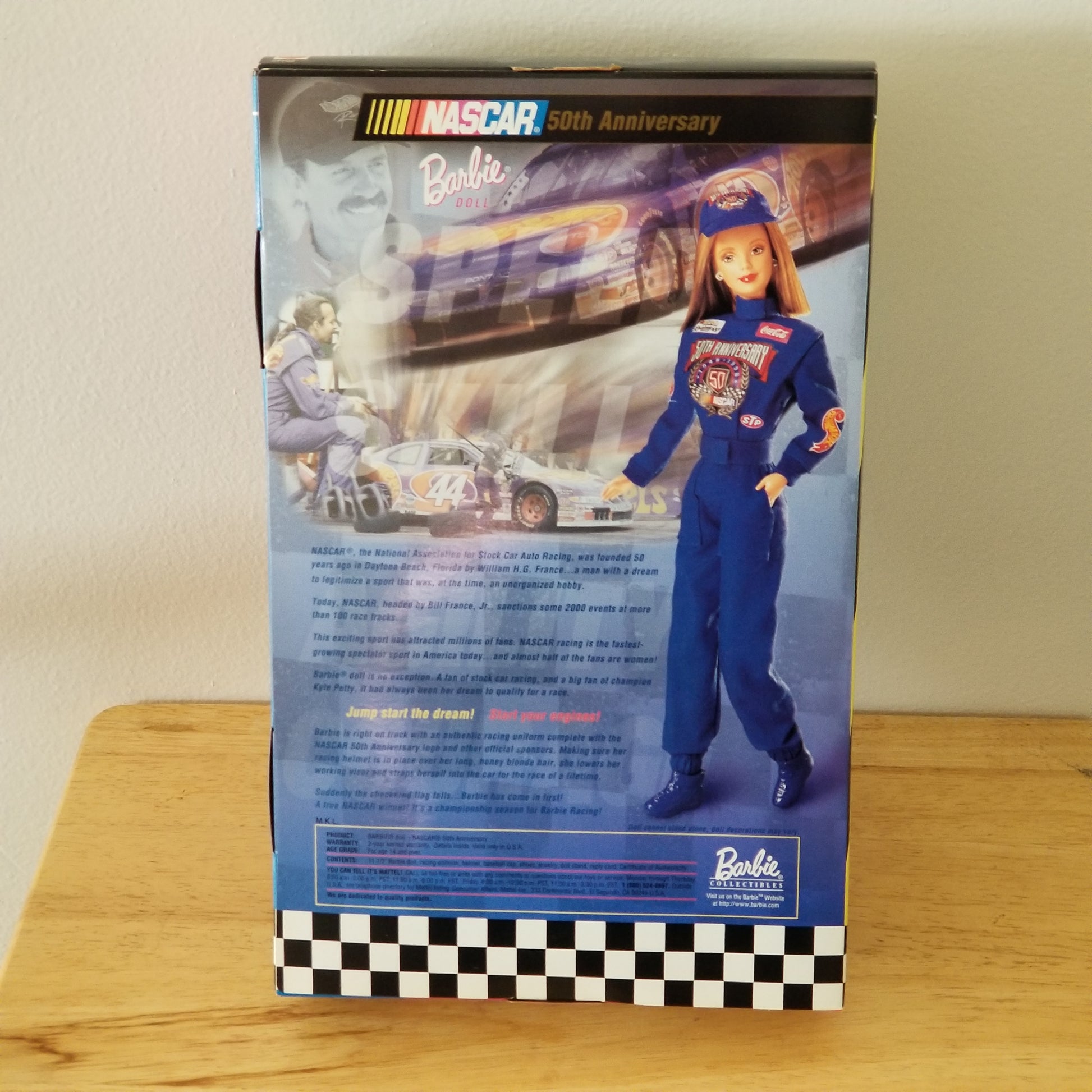 1998 Nascar 50th Anniversary Barbie Box is not in perfect condition. Has some rips and the clear plastic has some denting. cardboard part has some creasing, rips and is warped on top and bottom. Doll has not been removed from the box. perfect Christmas gift