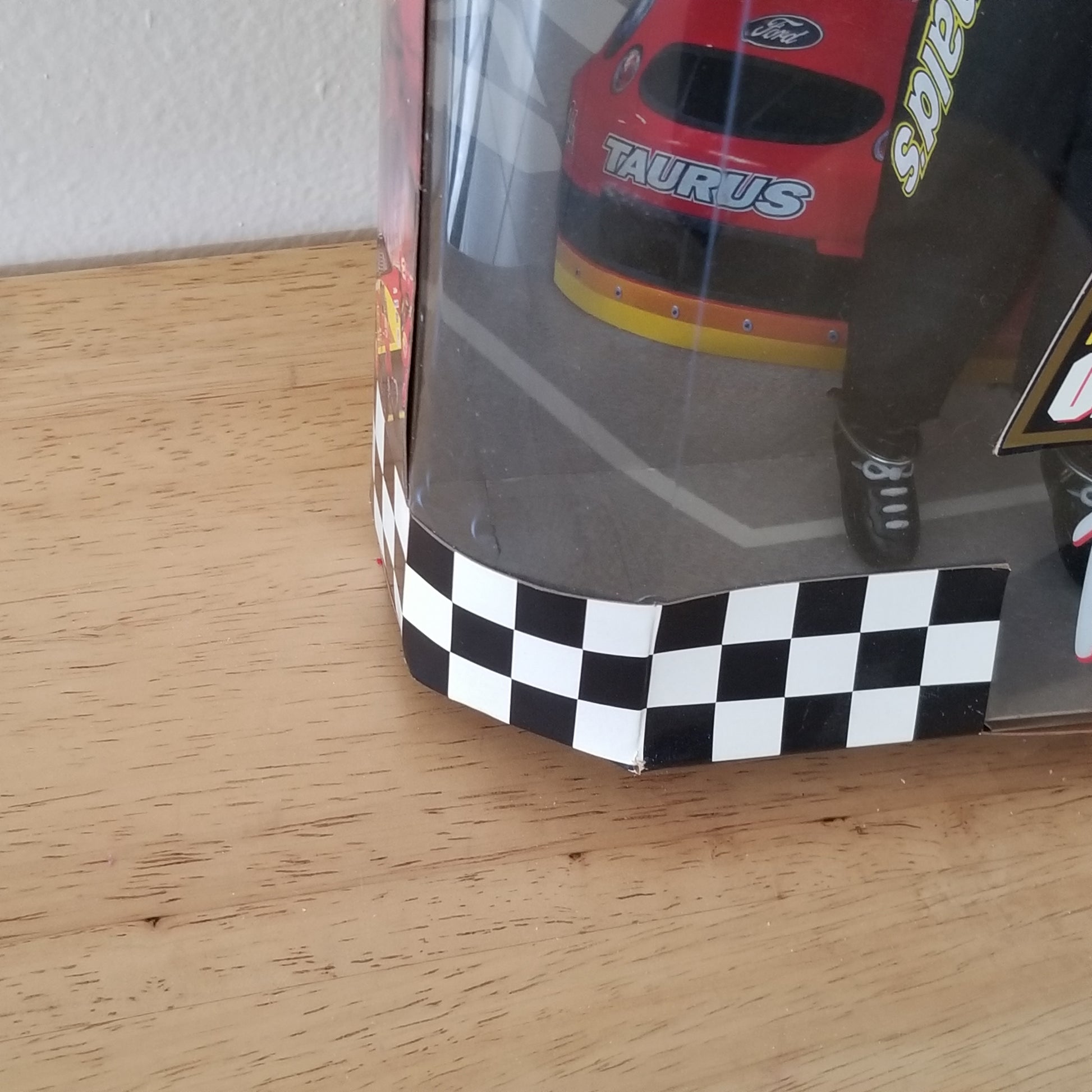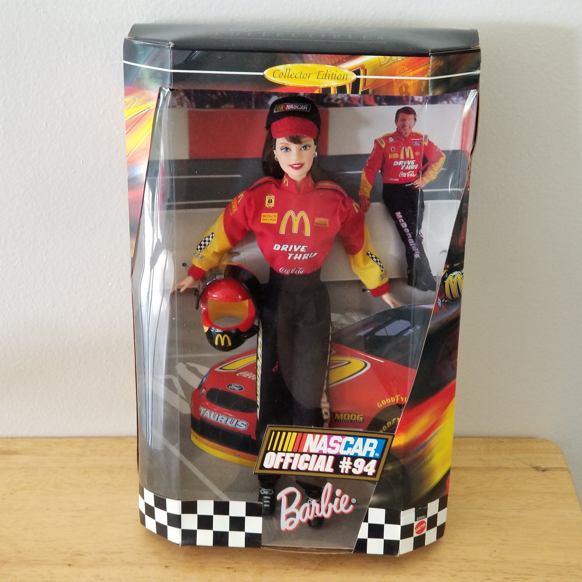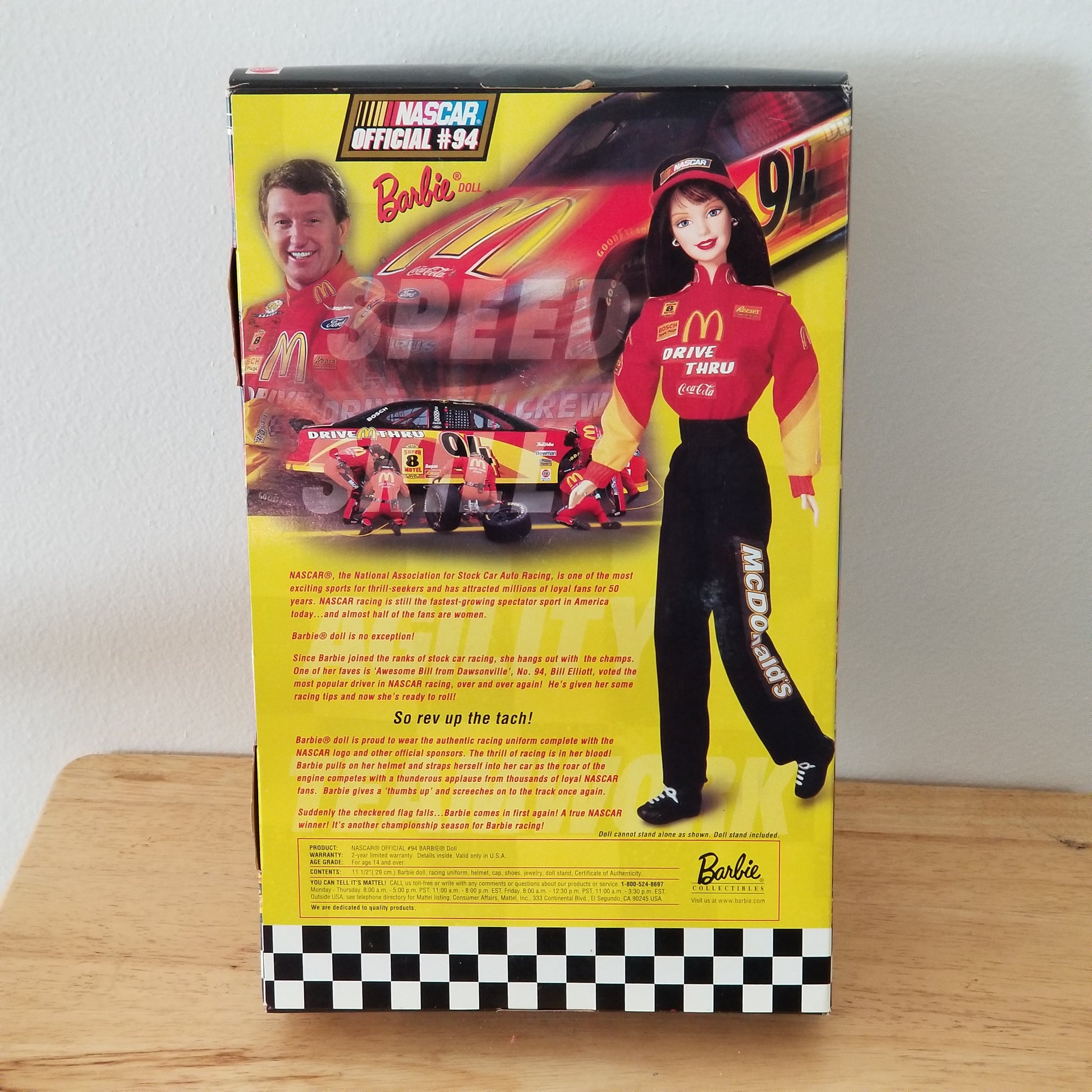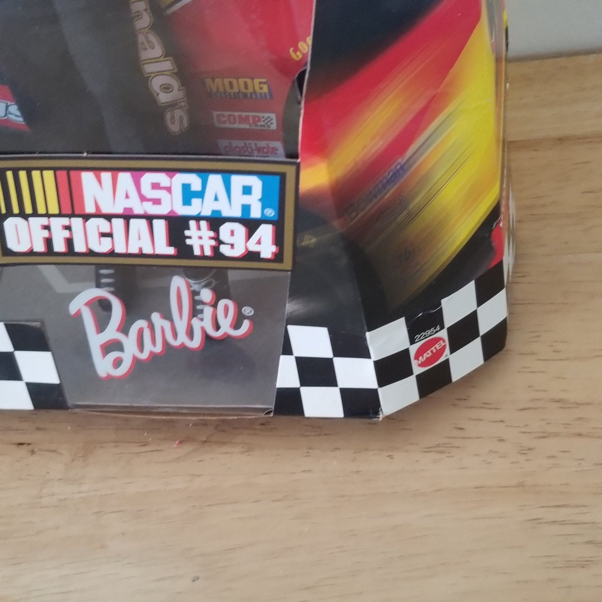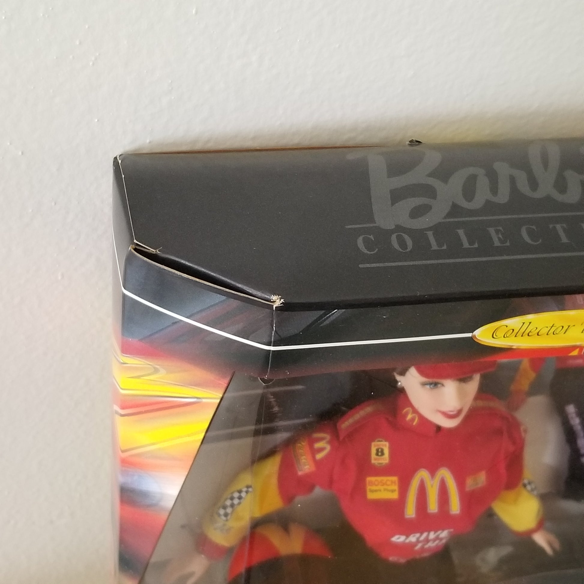 1999 Nascar Barbie NRFB Box is not in perfect condition. Has some rips and the clear plastic has some denting. cardboard part has some creasing, rips and is warped on top and bottom. Doll has not been removed from the box. perfect Christmas gift