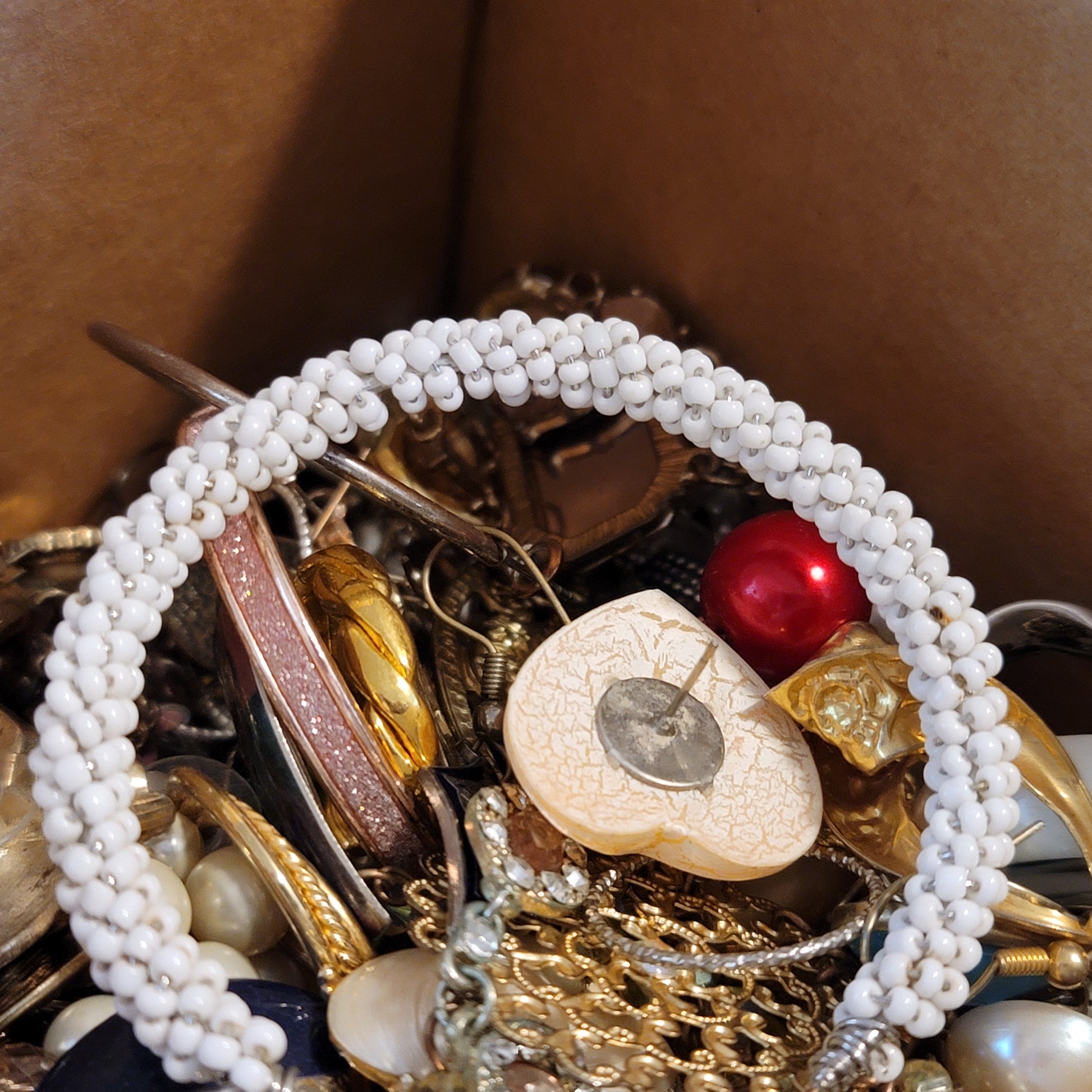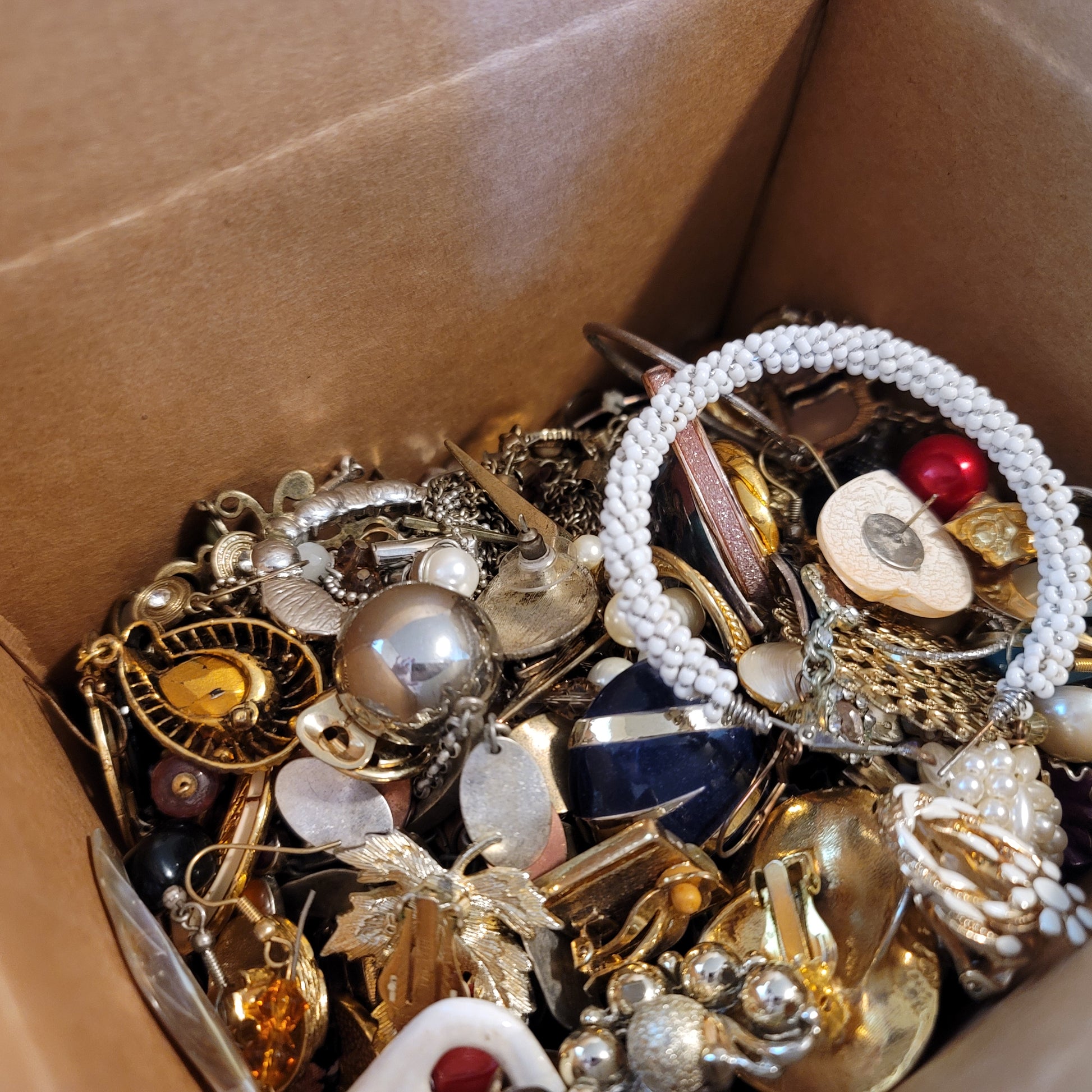Box contains earrings that are single, pairs, broken, pieces missing. This lot is good for crafters.