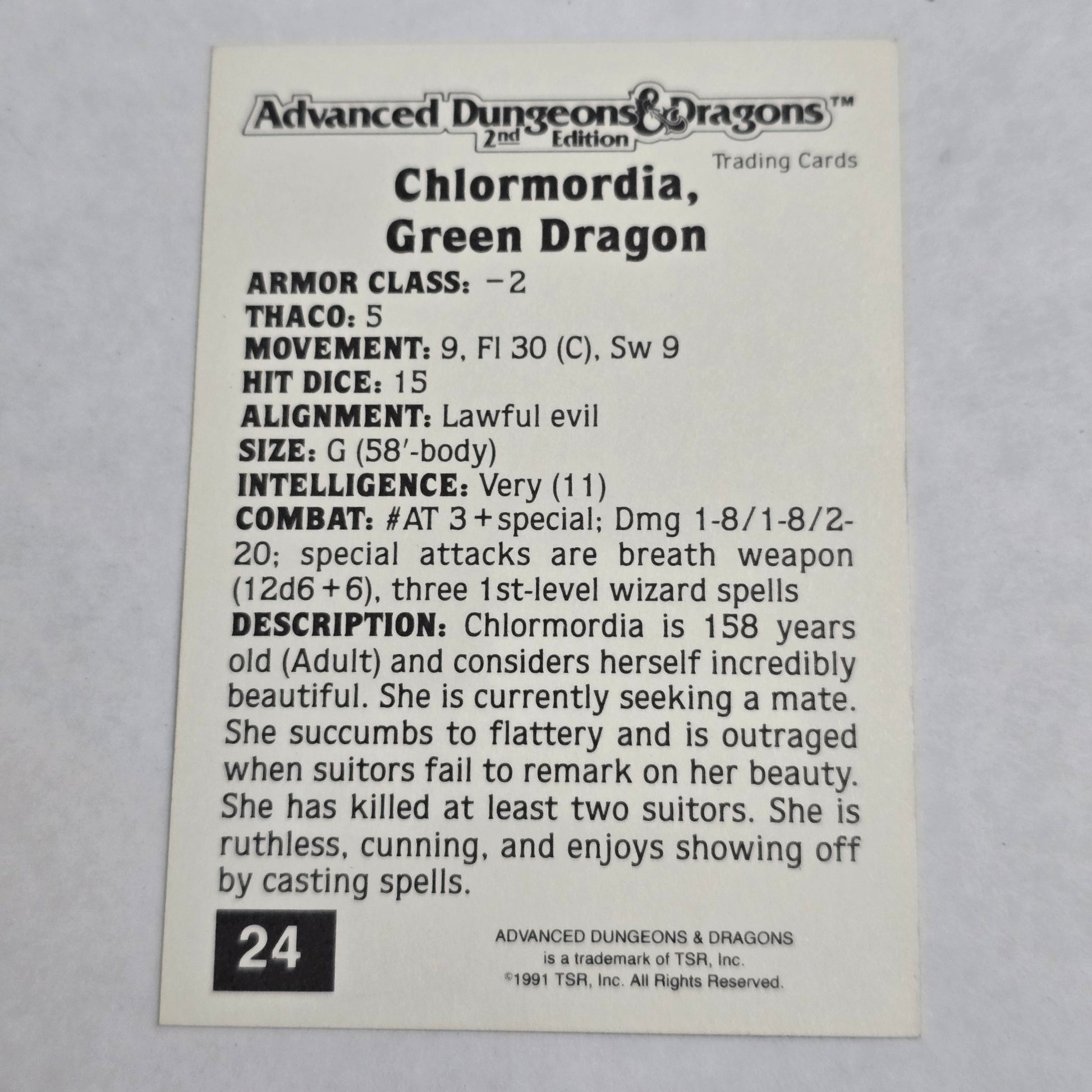 Official Advanced Dungeons & Dragons 2nd Edition trading card featuring Chlormordia, Green Dragon, card #24.