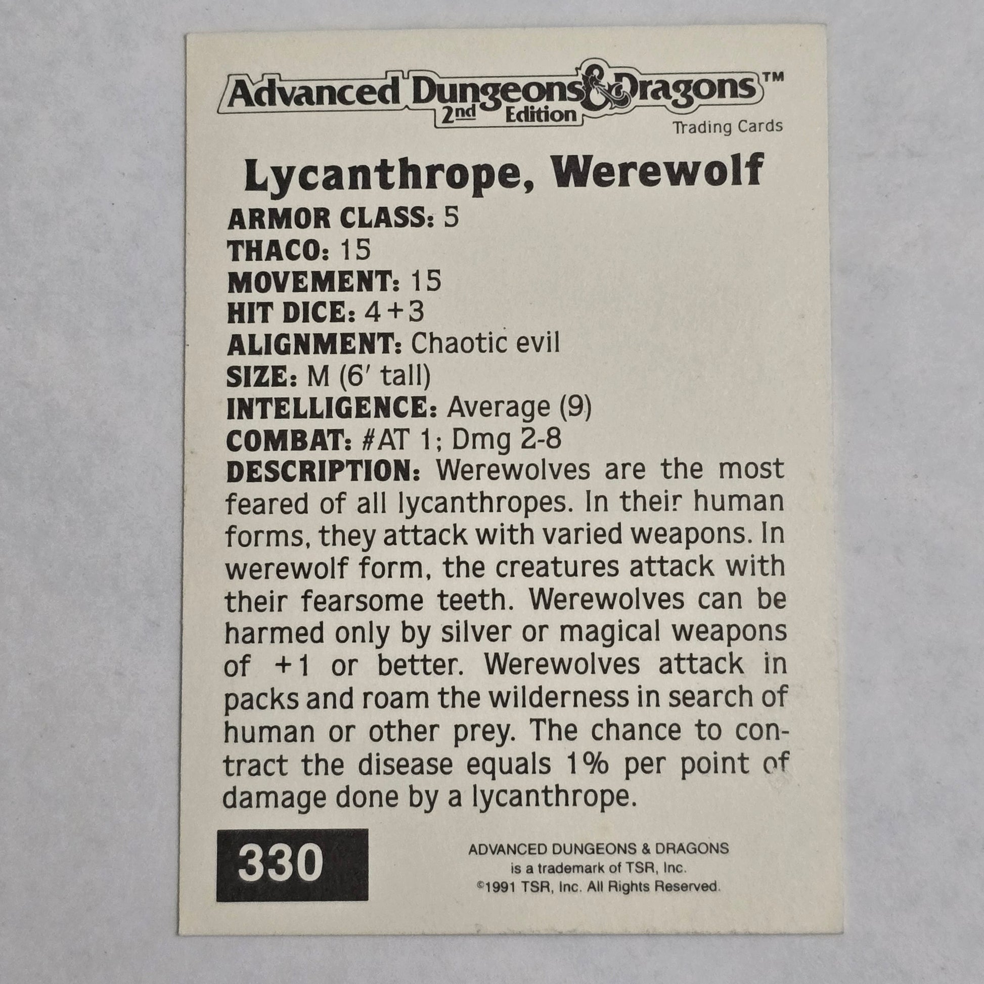 Official Advanced Dungeons & Dragons 2nd Edition trading card featuring the lycanthrope Werewolf, card #330.