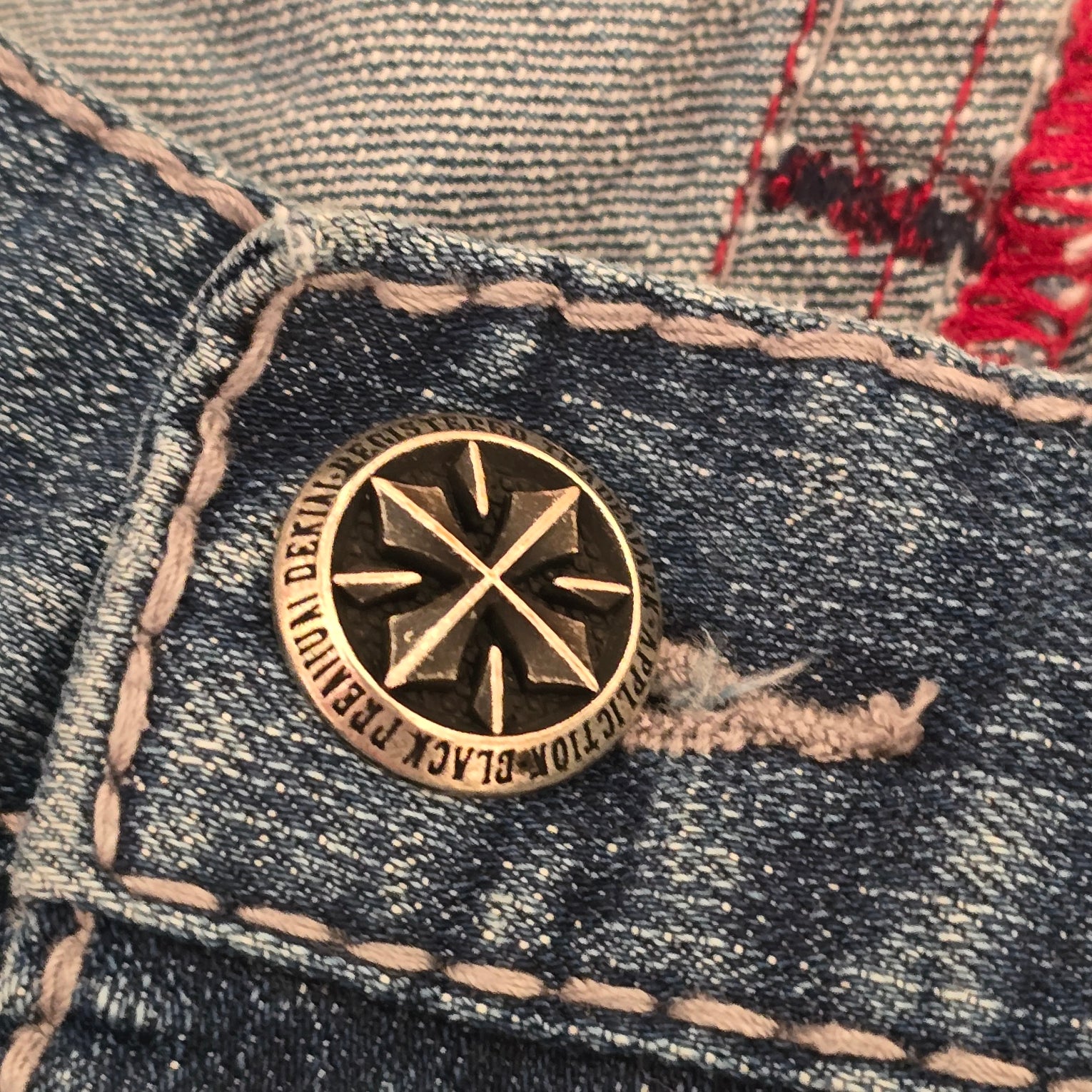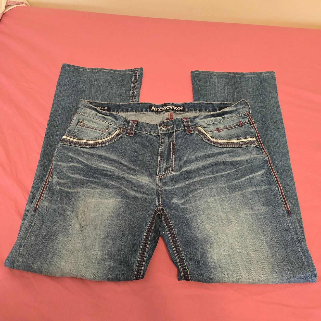 Dark blue bootcut jeans with stylish stitching. Classic Affliction design. Perfect for casual wear.