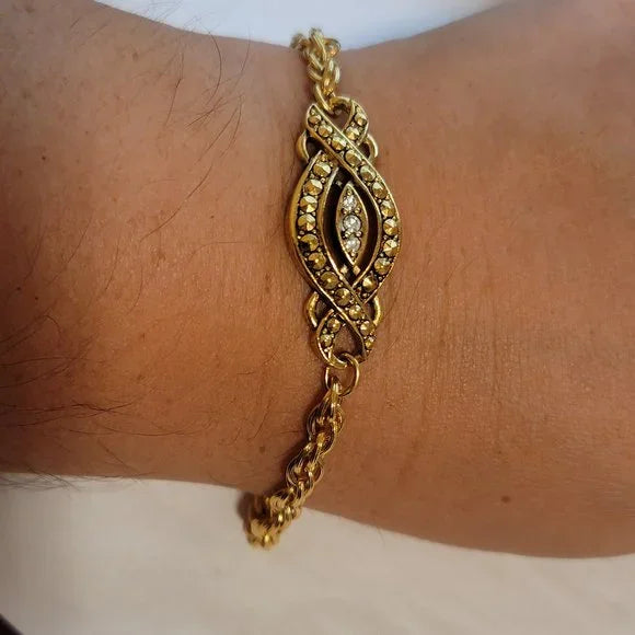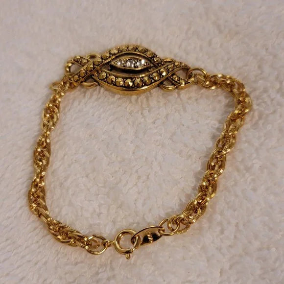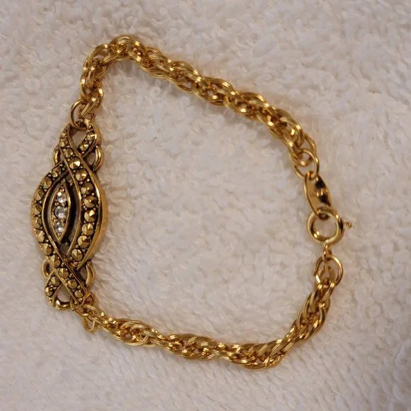 Color: Gold tone Has faux Marcasites and clear rhinestones.