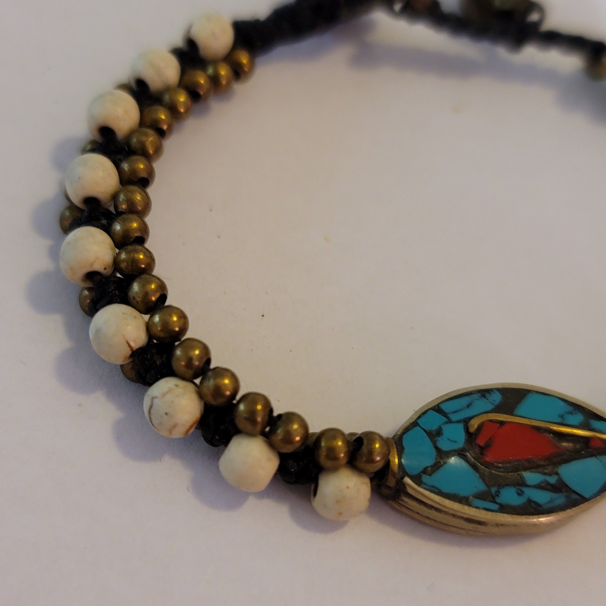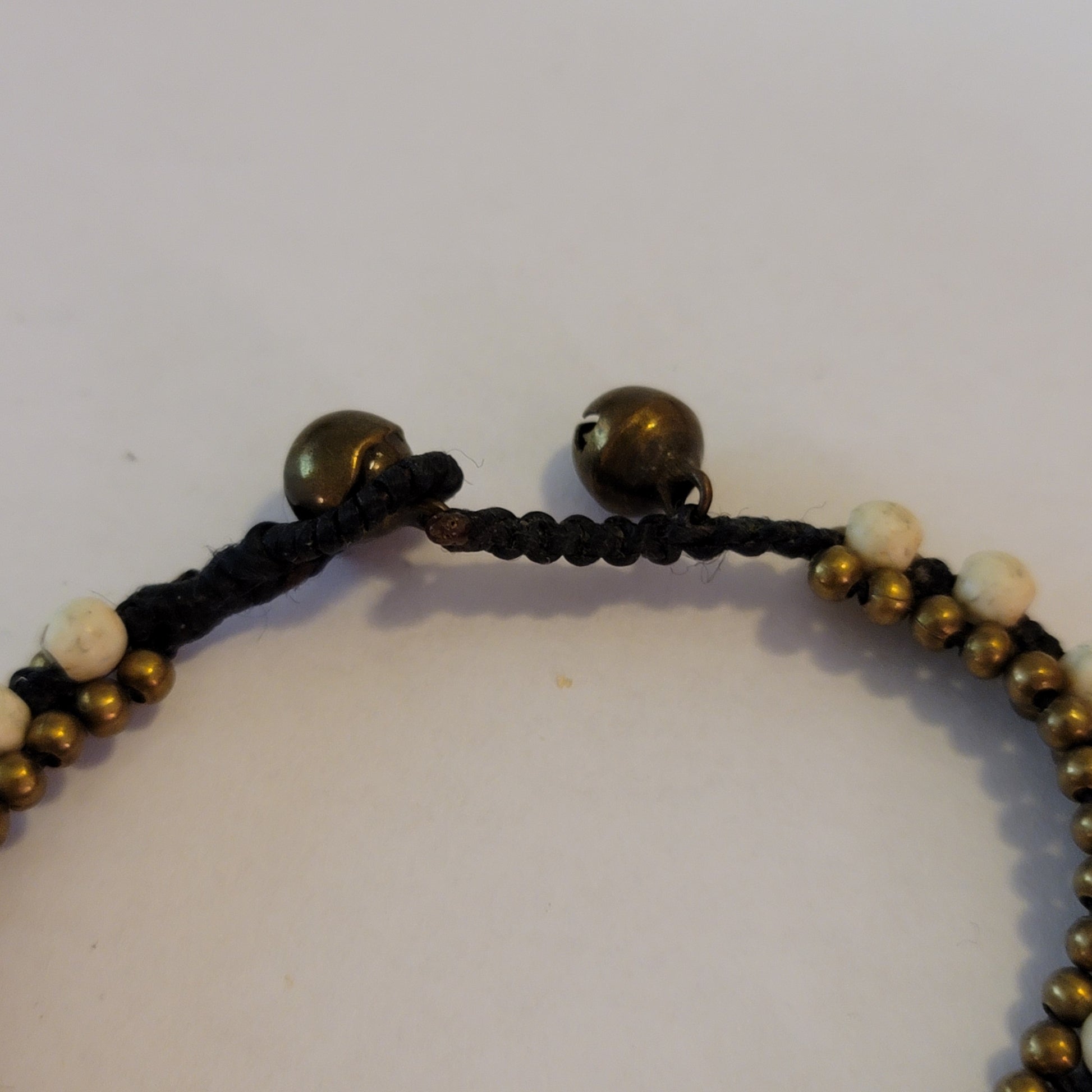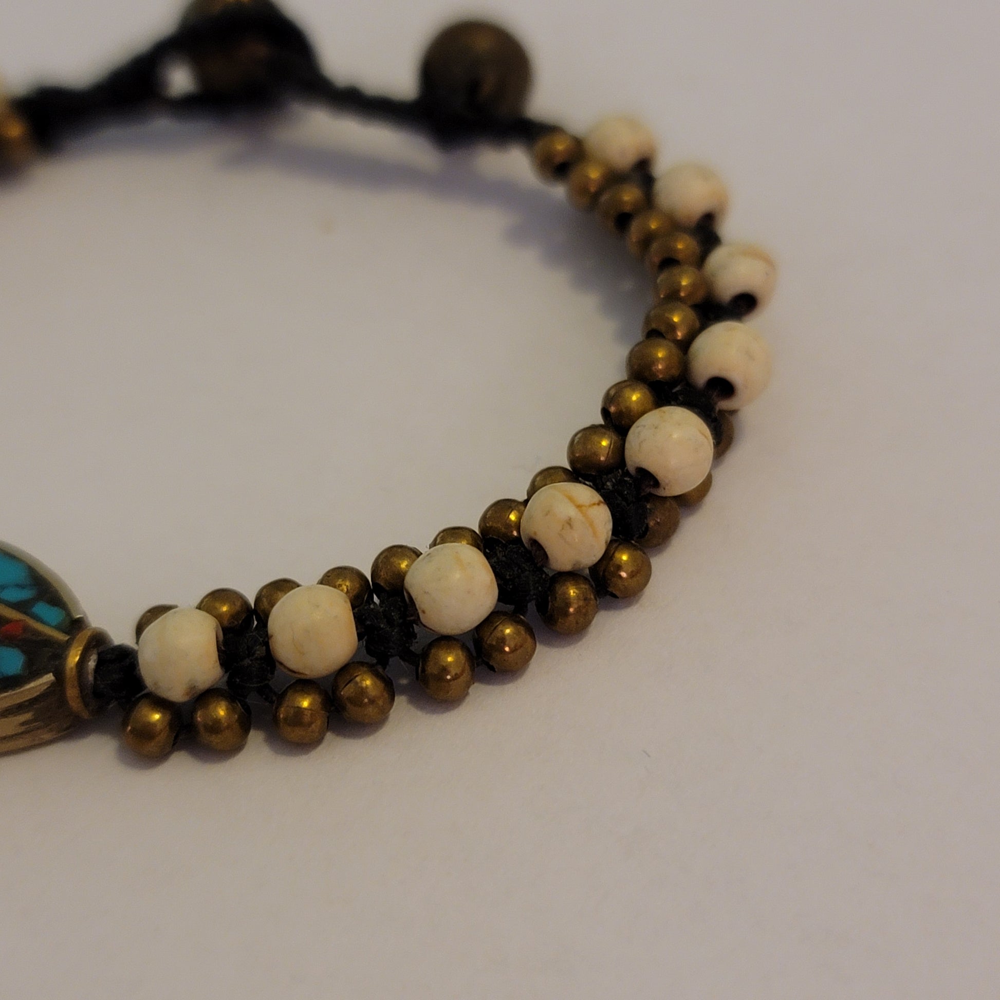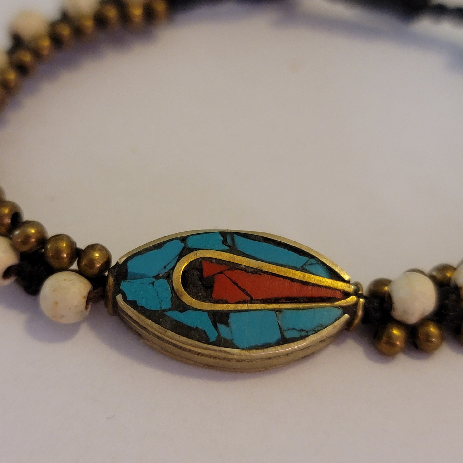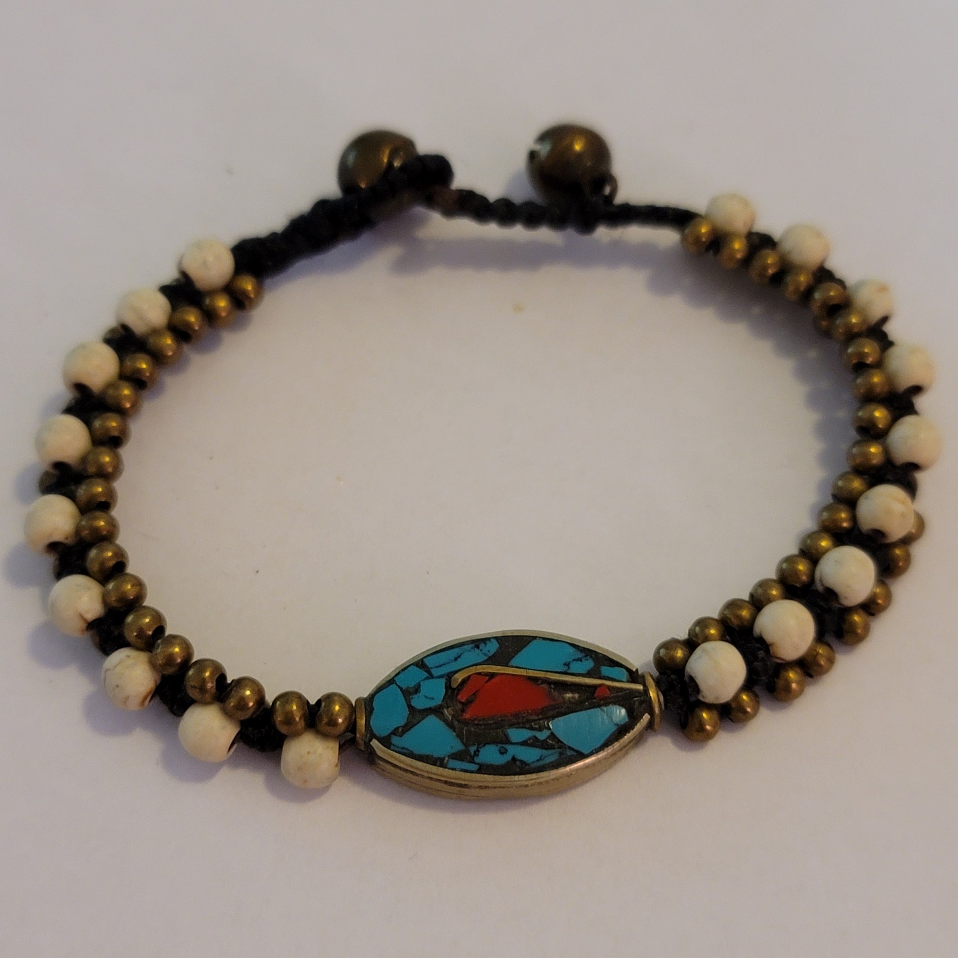 In good pre-owned condition. 7.5" Has 2 bells. Looks like turquoise, coral, but not sure.
