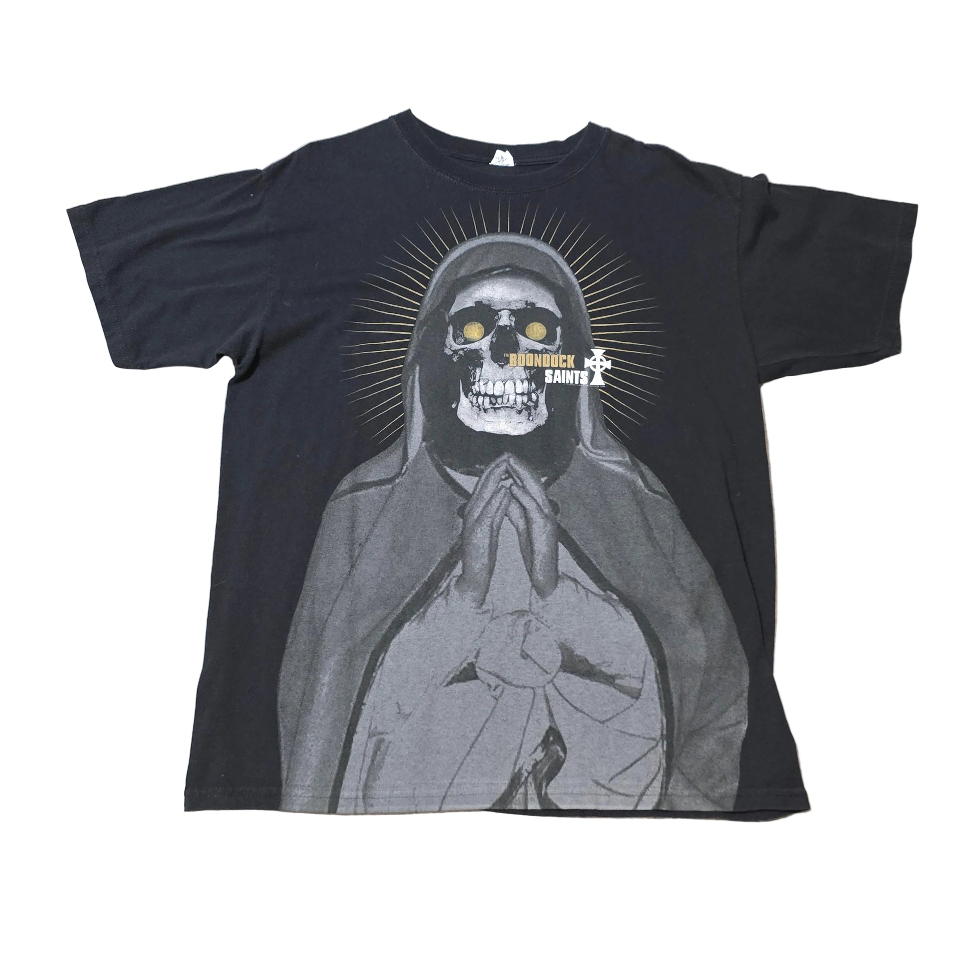 Striking Boondock Saints graphic T-shirt featuring a skull in prayer with halo rays and gold-tone eyes. Bold, cinematic artwork inspired by the cult classic film aesthetic.