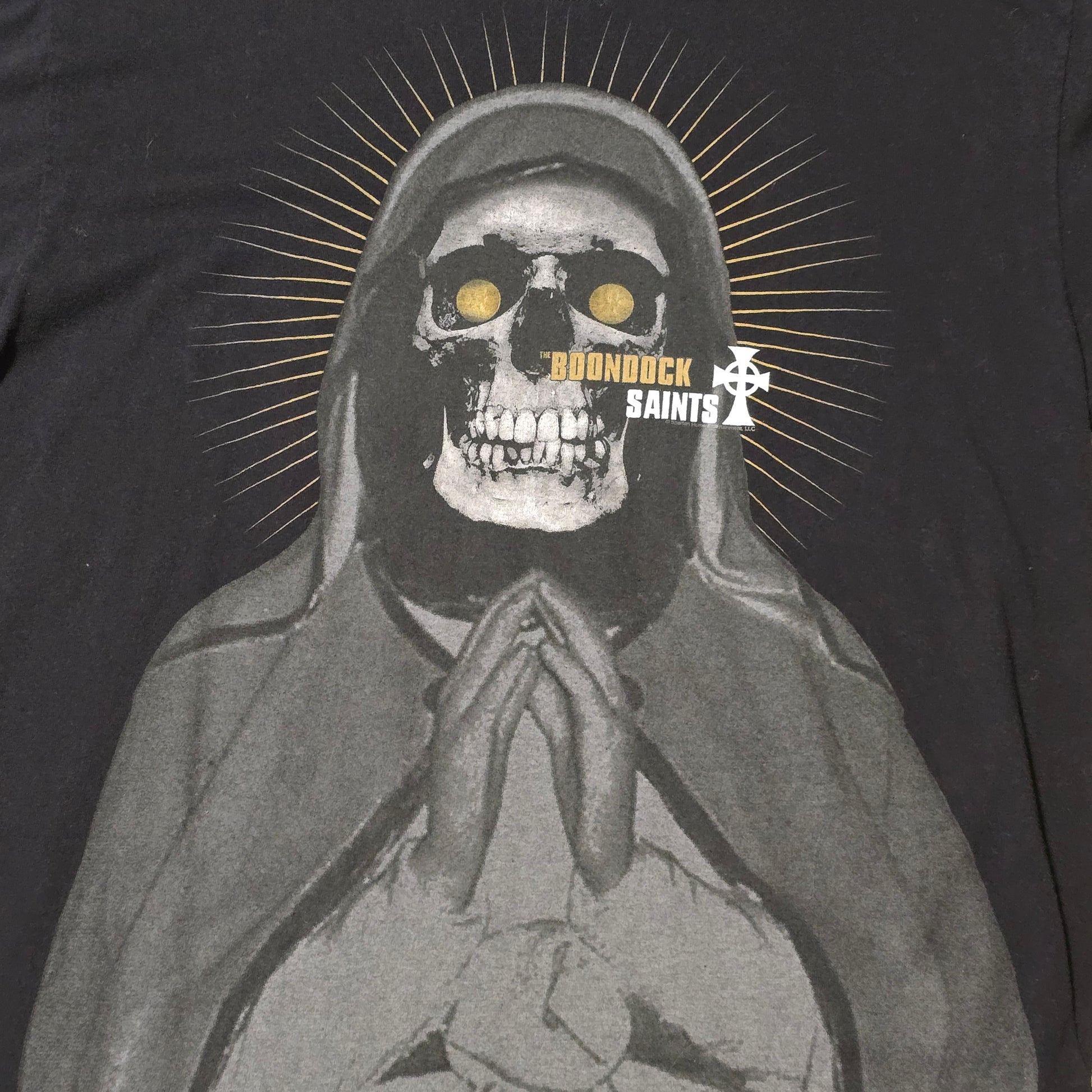 • Graphic: Skull prayer design with halo rays and “Boondock Saints” text