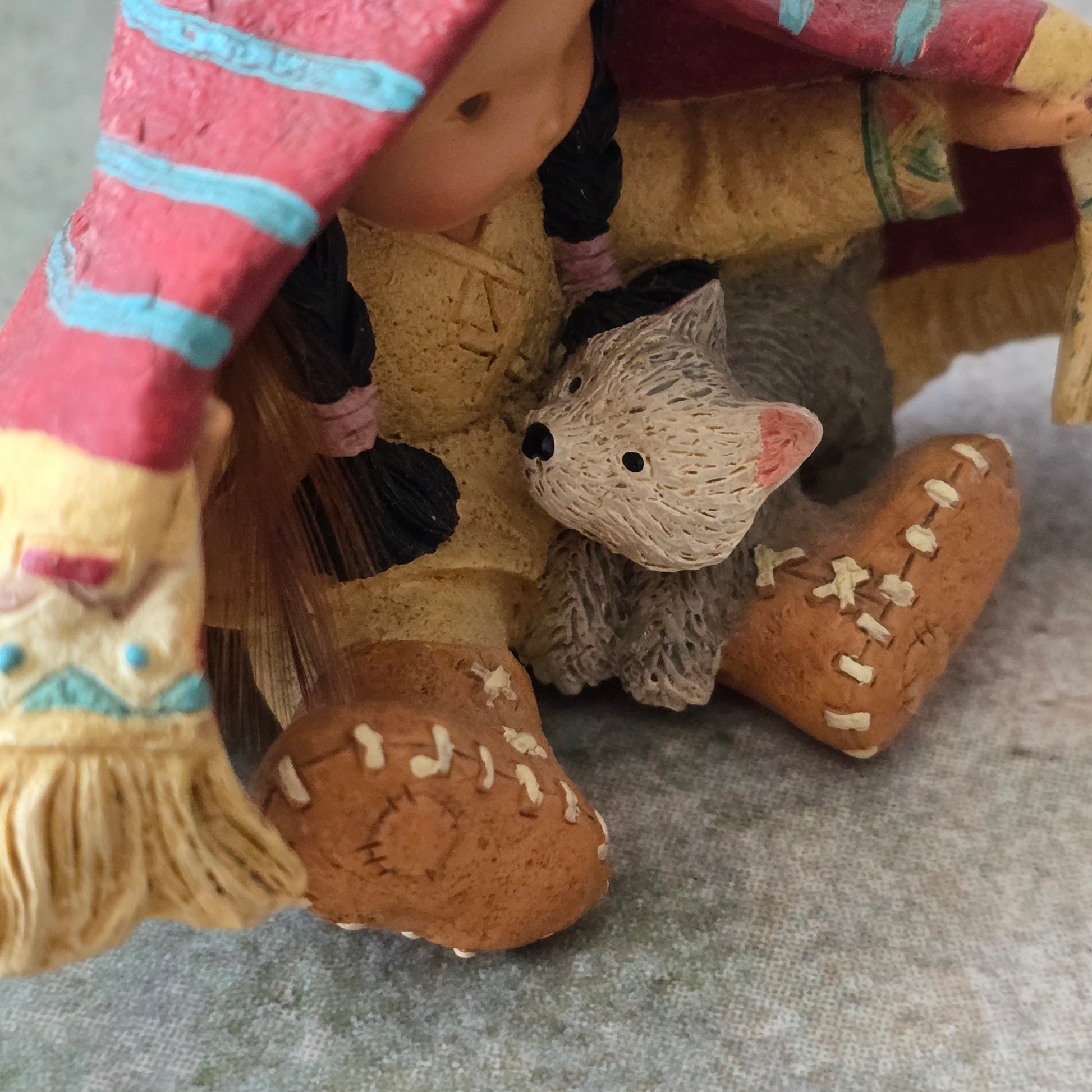 This early figurine from the Friends of the Feather collection by Karen Hahn features a child sitting with a small animal companion beneath the cover of a red and gold patterned blanket. The figure’s sweet expression and protective gesture symbolize love, care, and harmony with nature.