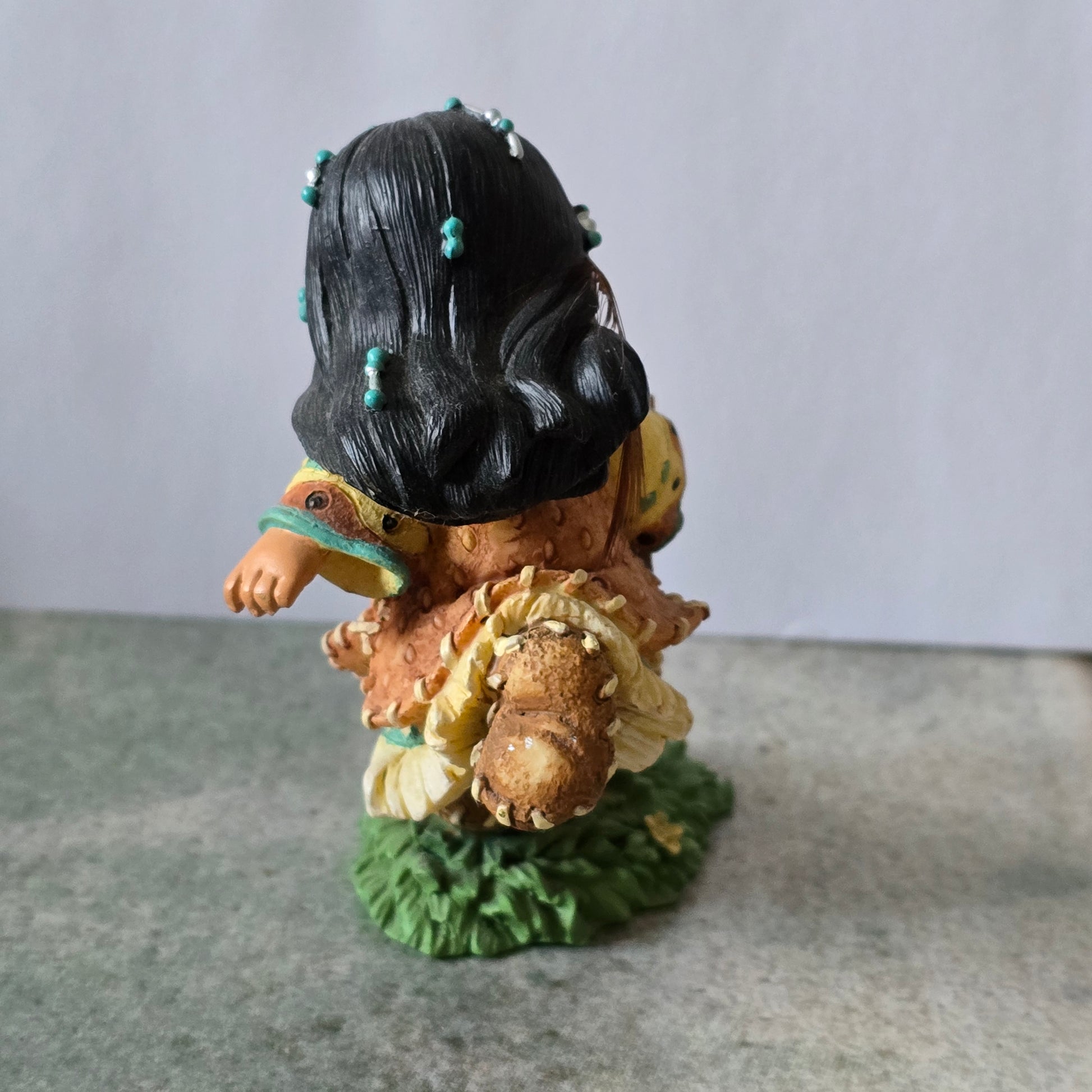 This charming figurine from the Friends of the Feather collection by Karen Hahn depicts a young girl playing with a hoop toy, symbolizing the joy and innocence of childhood. Hand-painted in warm tones with detailed beadwork accents, it also features a real feather in her hair for an authentic touch.