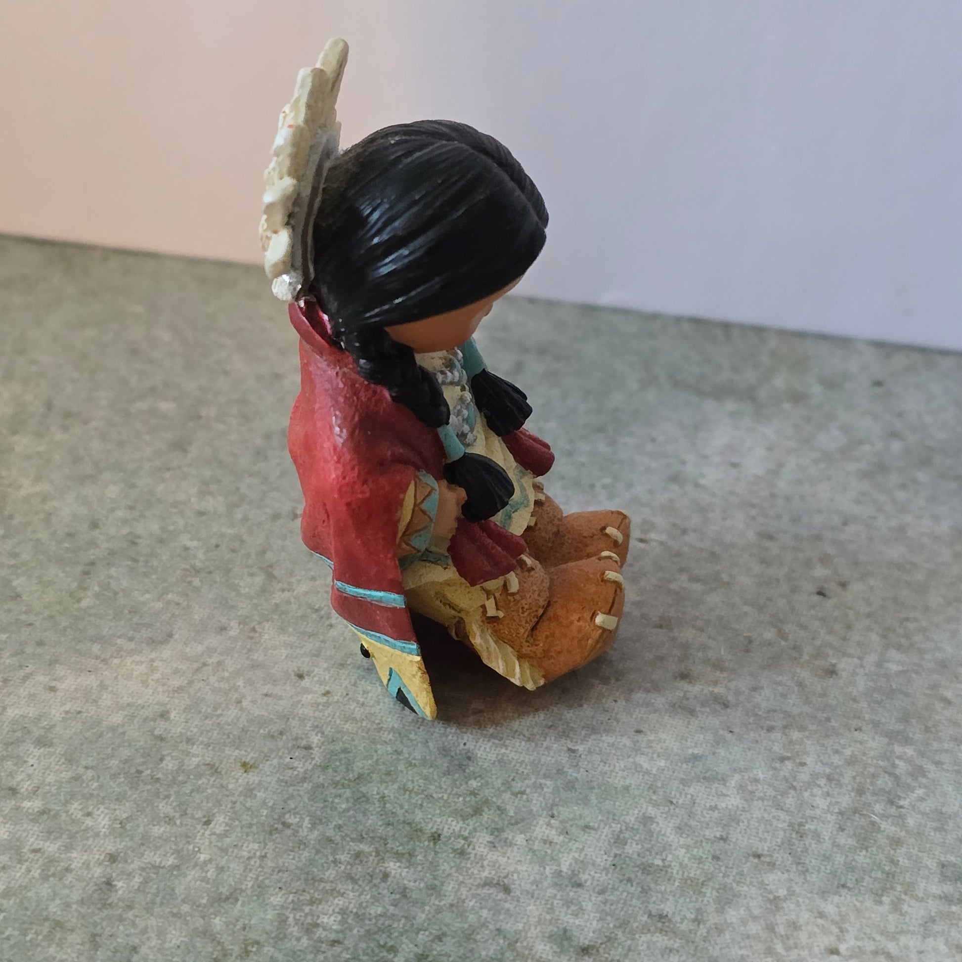 This sweet figurine from the Friends of the Feather collection features a kneeling girl in a red cloak, adorned with turquoise jewelry and feathered headdress, bowing her head in prayer. Her detailed outfit and hand-painted design reflect the classic artistry of Karen Hahn’s Friends of the Feather series.