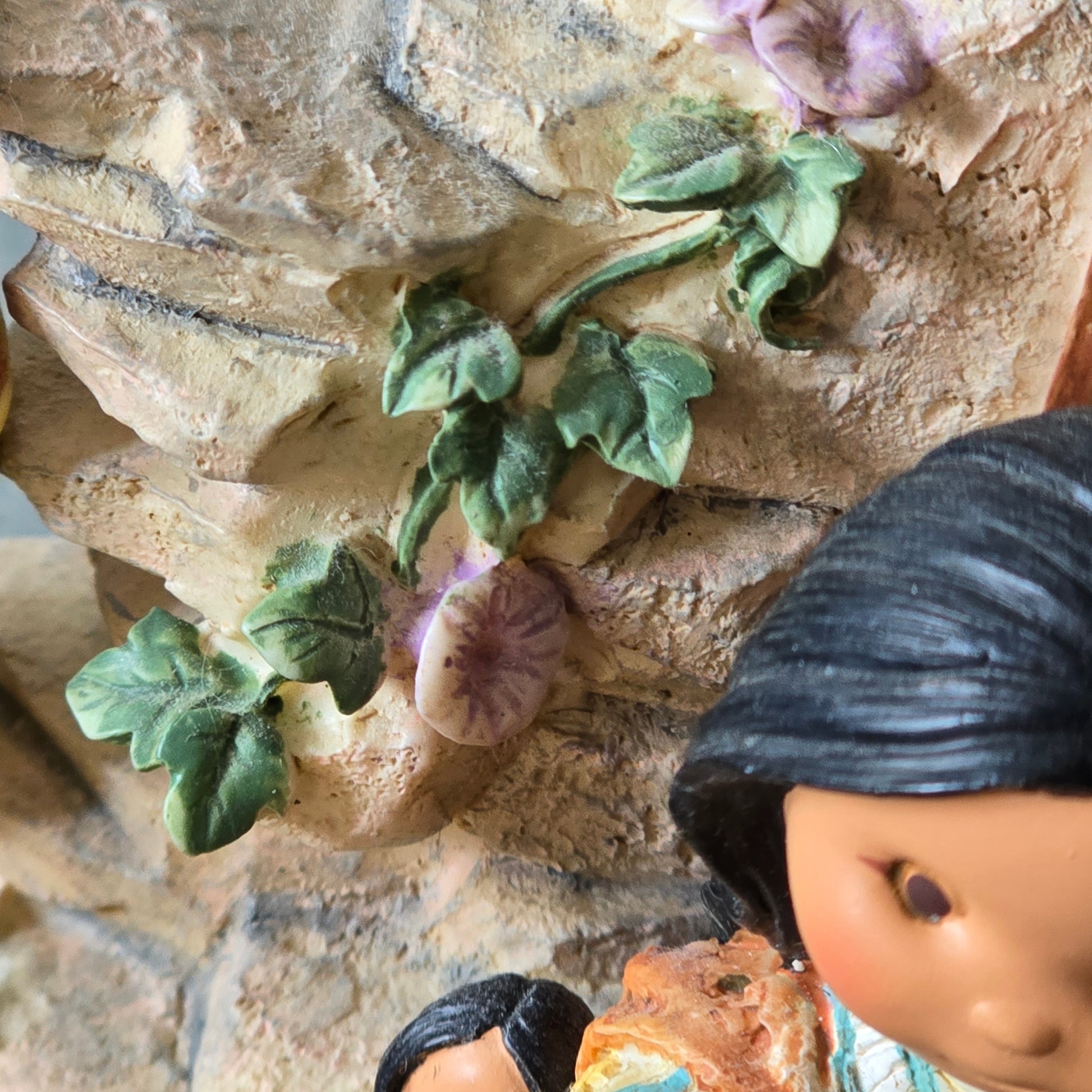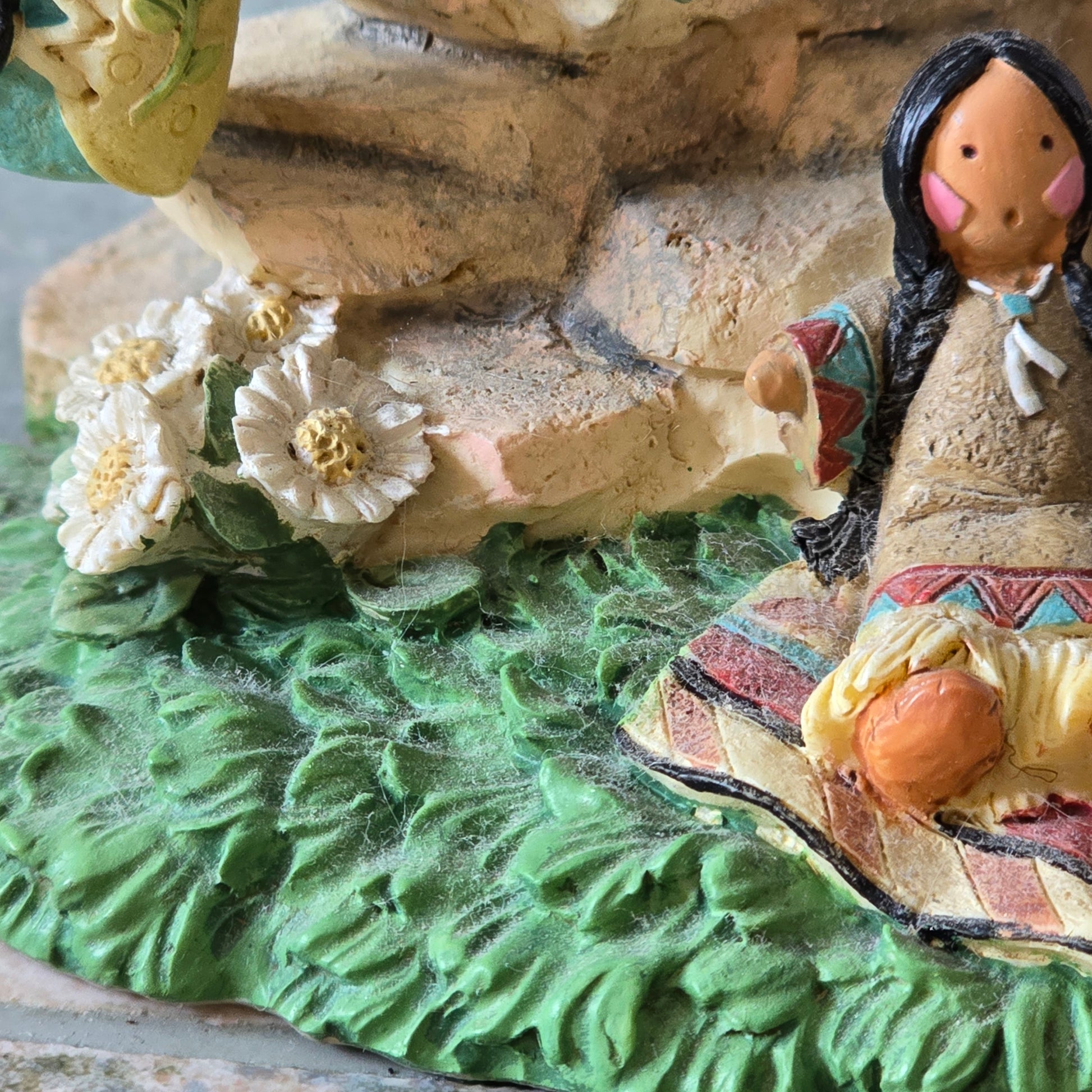 This collectible figurine from the Friends of the Feather series by Karen Hahn captures a heartwarming scene of a young girl weaving a blanket while surrounded by children and family. The detailed sculpt features textured fabric, a cradleboard with infant, and a backdrop of rocks and flowers.