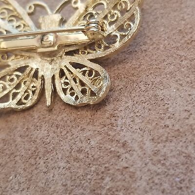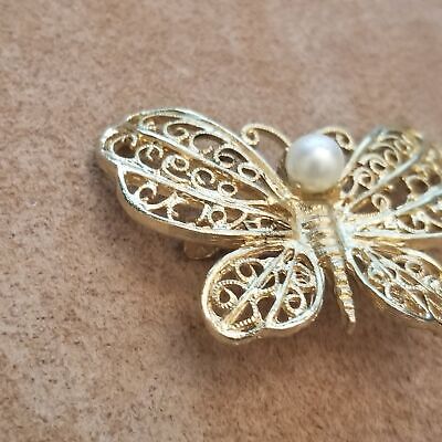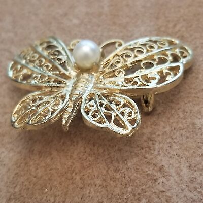 This vintage brooch features a graceful butterfly design with openwork filigree wings in shiny gold tone. A single faux pearl sits at the center, adding a touch of elegance and dimension. Perfect as a nature-inspired accessory for blouses, scarves, jackets, or to add to a vintage jewelry collection.