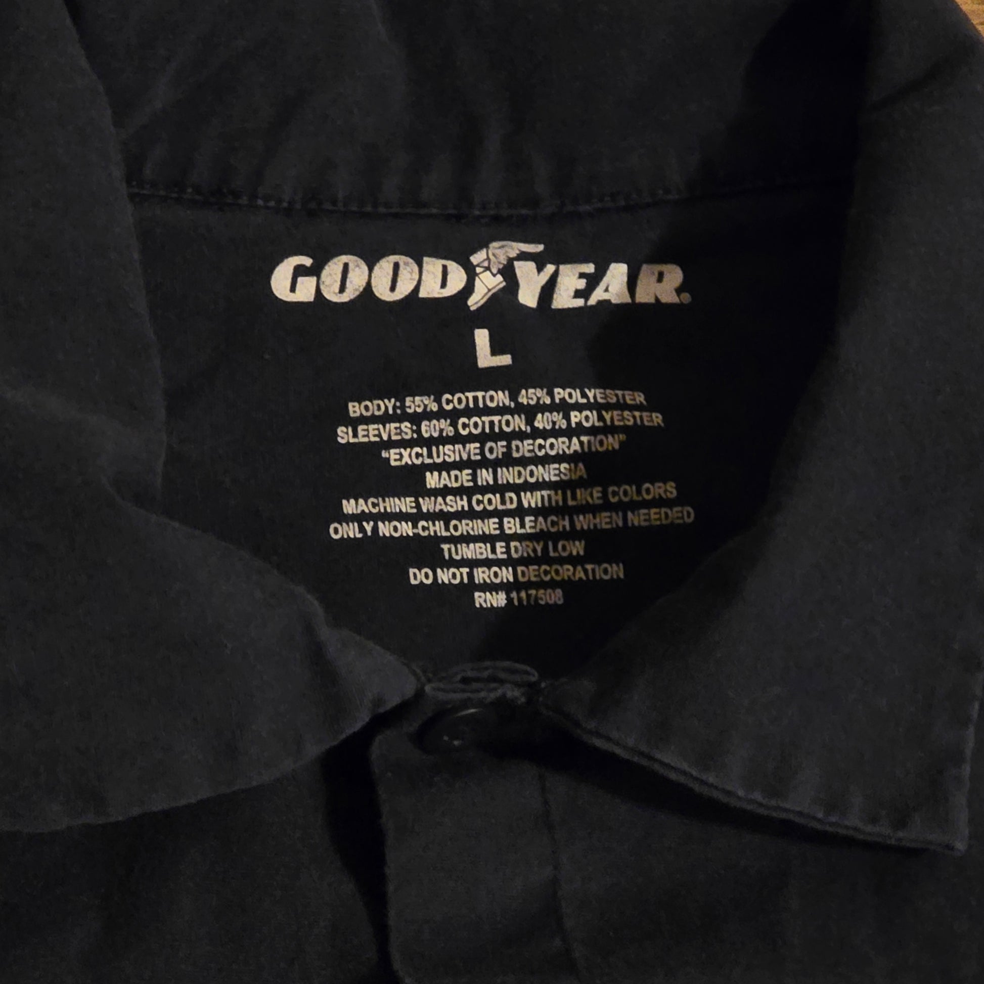 This Goodyear short-sleeve button-up shirt has a rugged mechanic-style design with white faux layered long sleeves for extra edge. The front features an embroidered Goodyear logo patch over the chest pocket, while the back showcases a large vintage-inspired graphic reading “The Greatest Name in Rubber – Goodyear – Akron, Ohio – Est. 1898.”