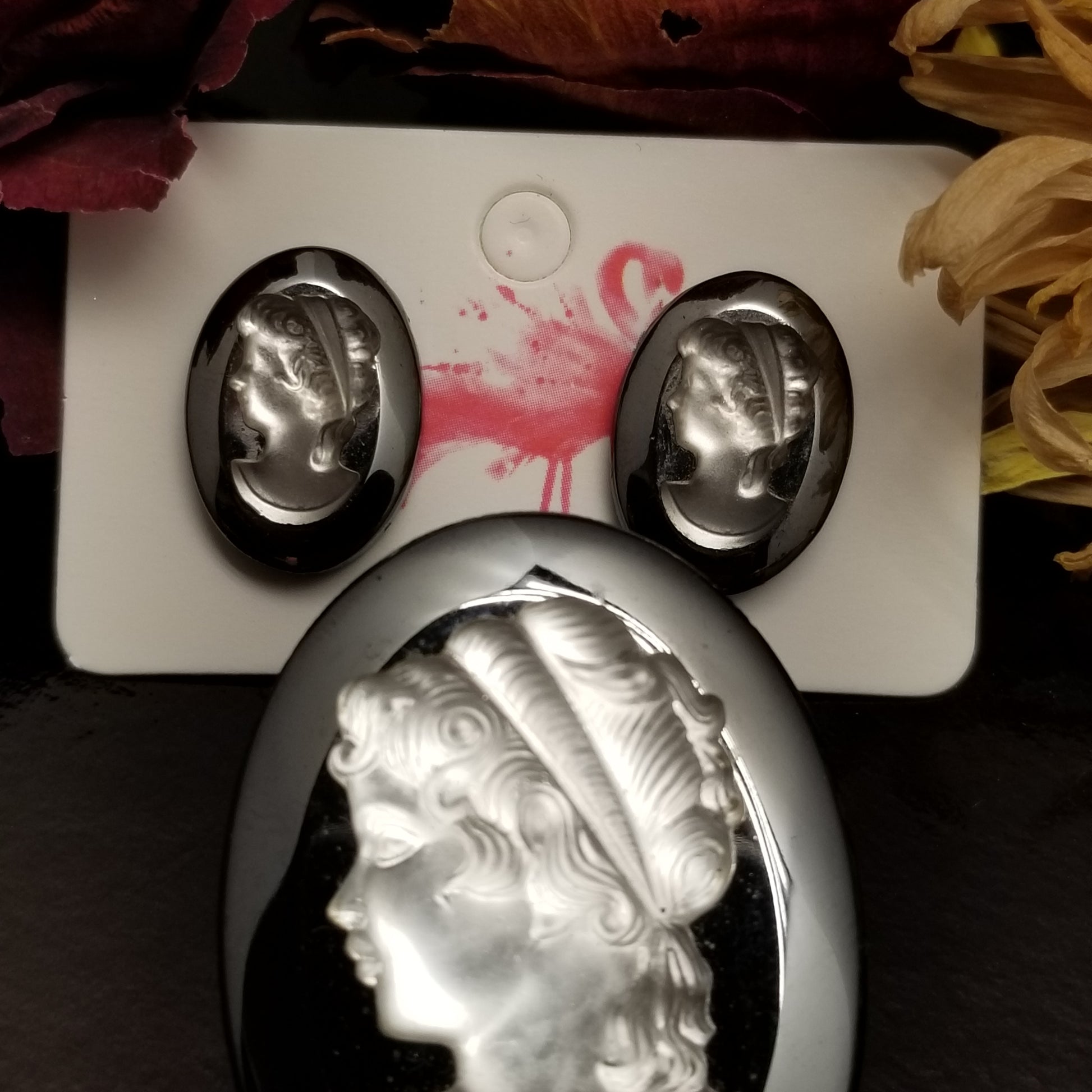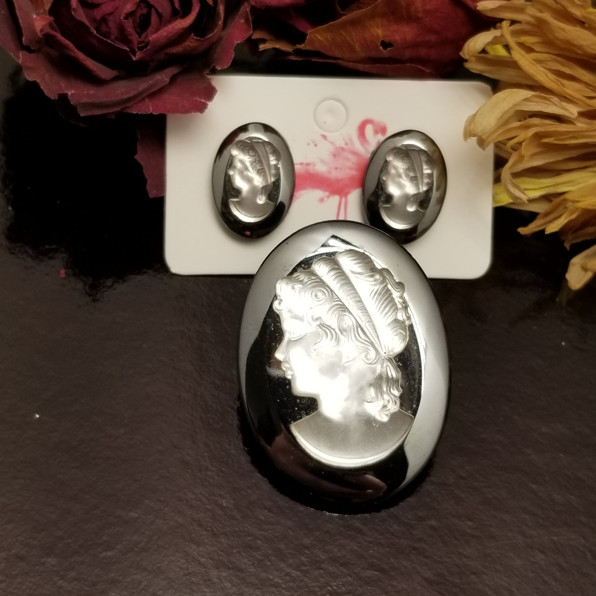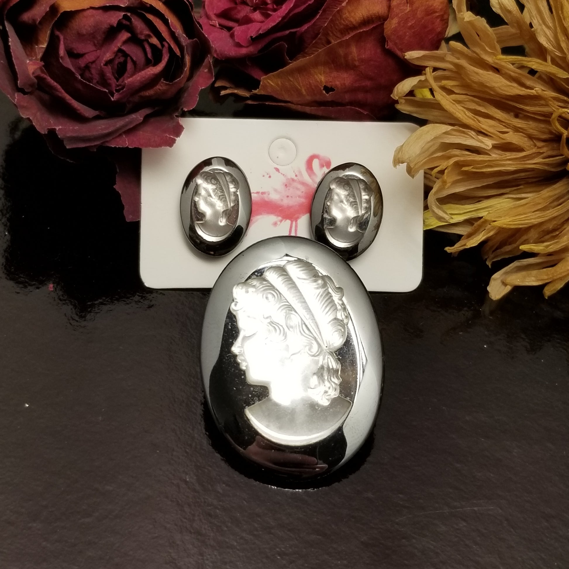 Grey Glass Cameo Earring & Brooch Set