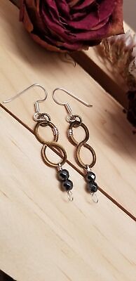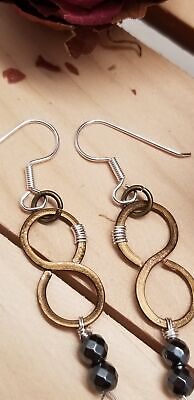 I used copper wire, hand shaped the figure 8, hammered flat and I wrapped silver colored wire and added 5mm hematite. I attached stainless steel ear wire.