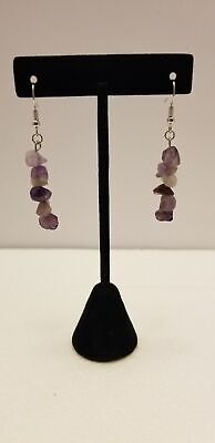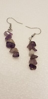 About 1.3" in length, Amethyst chips on silver tone wire. Ear wire is stainless steel.