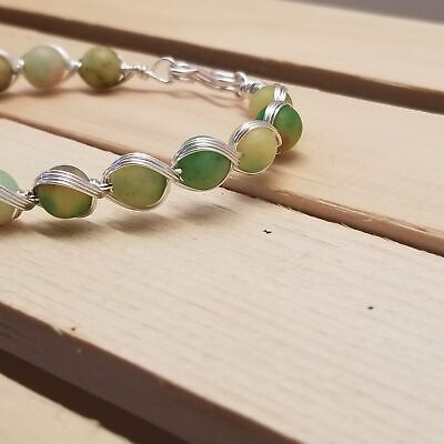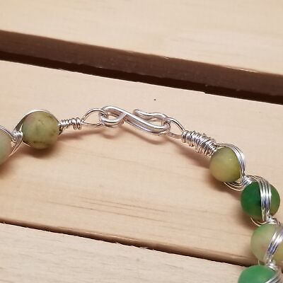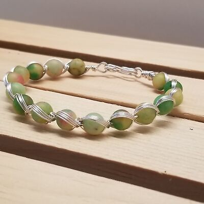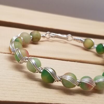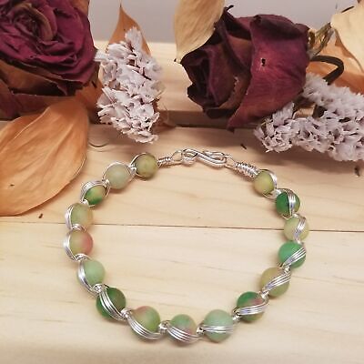 Bracelet is handmade using non-tarnishing silver colored wire. 8mm Glass beads