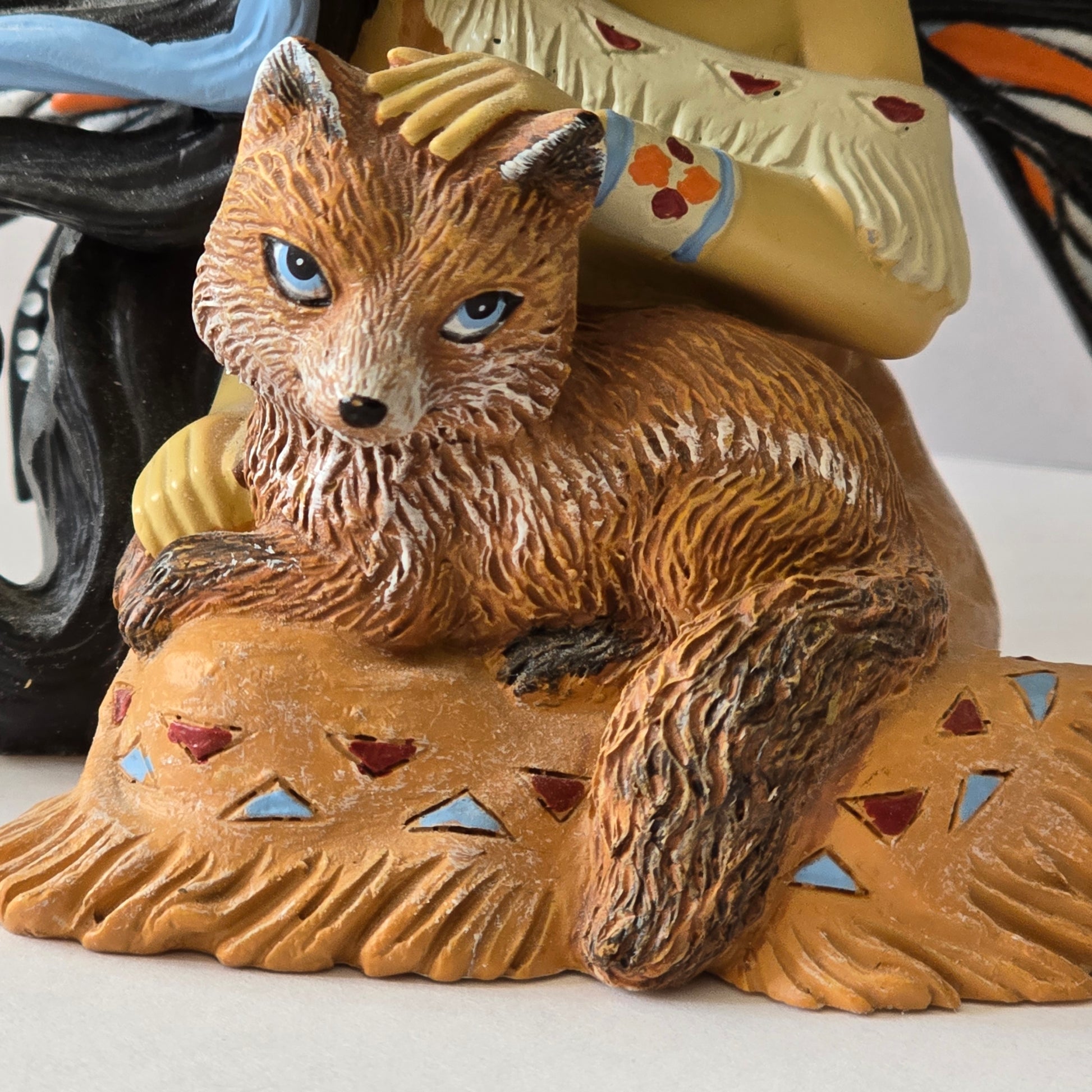 This stunning collectible figurine, “Heartsgate the Spirit of Freedom,” is part of Jasmine Becket-Griffith’s Spirit Maidens Collection from The Hamilton Collection. The piece features a butterfly-winged maiden with flowing black and blue hair, tenderly holding a fox companion. Each figure is individually numbered and limited to 95 casting days.