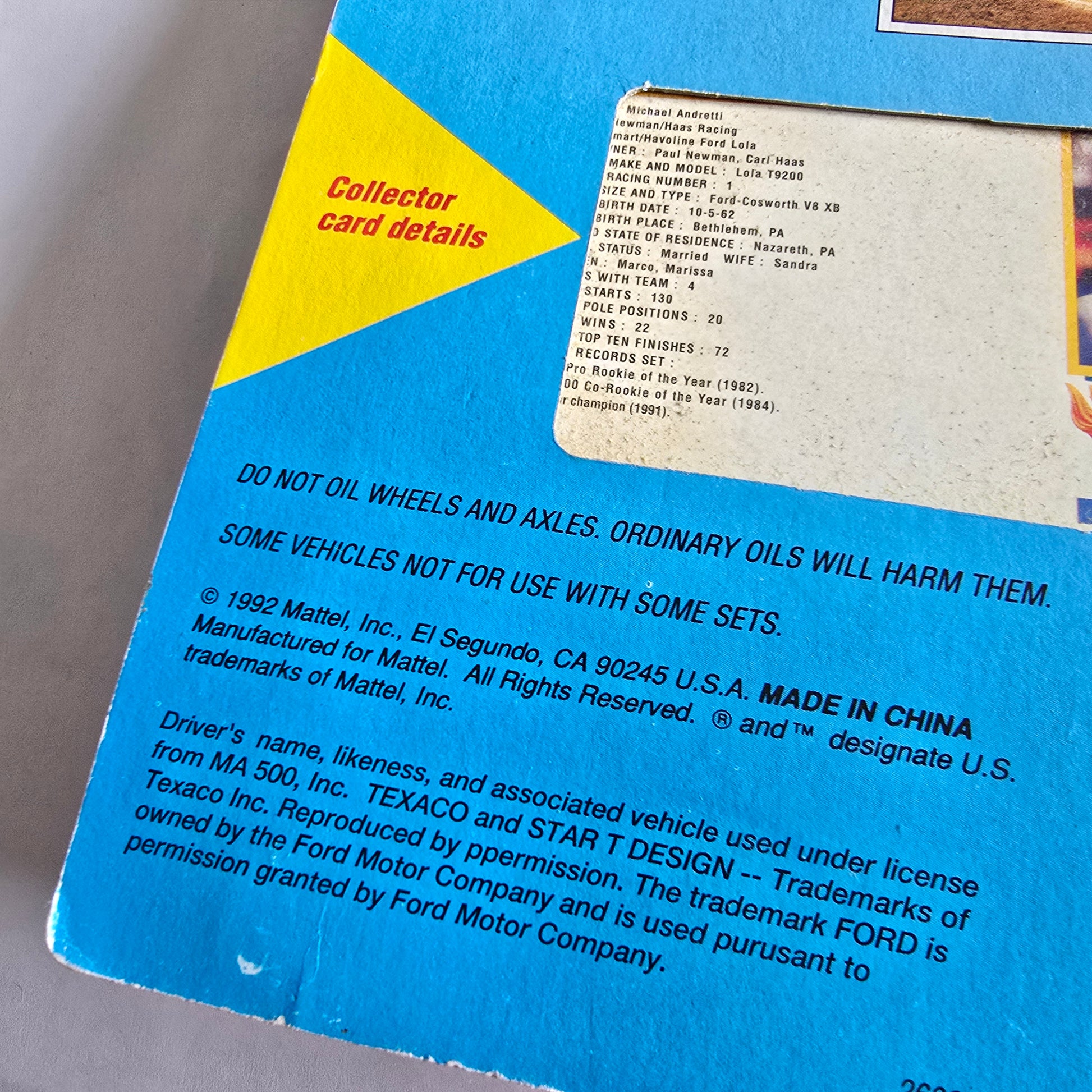 This vintage Hot Wheels Pro Circuit die-cast features Michael Andretti’s Texaco Indy car and includes a collectible driver card. Part of the early 1990s Pro Circuit line, this series highlights authentic open-wheel racers and their real-world counterparts. The item remains factory sealed, but the card shows significant wear, including creasing, edge wear, and a torn section near the top hanger—common for early ’90s packaging. Blister remains intact and displayable. A great addition for Hot Wheels racing collectors or fans of Michael Andretti and open-wheel history.