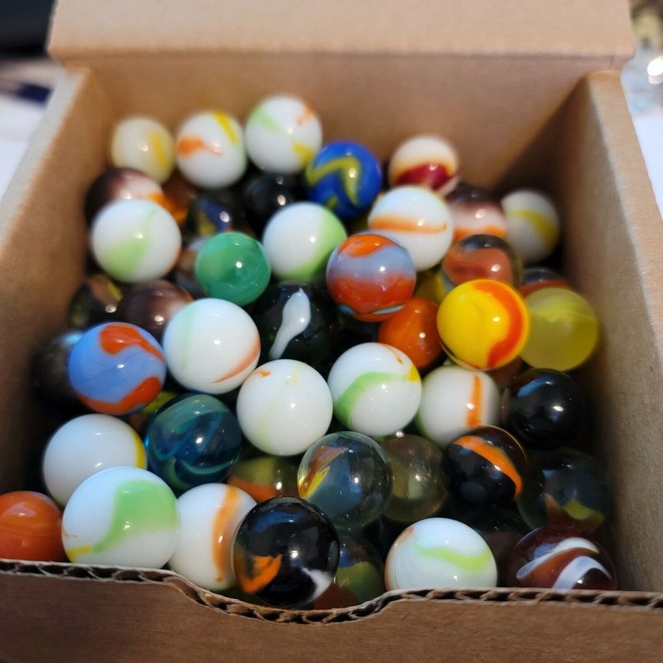 3 lbs of assorted marbles, various types. In preowned condition. May have scratches, chips, cracks due to being preowned. 4"x4" box, with 3lbs worth of marbles.
