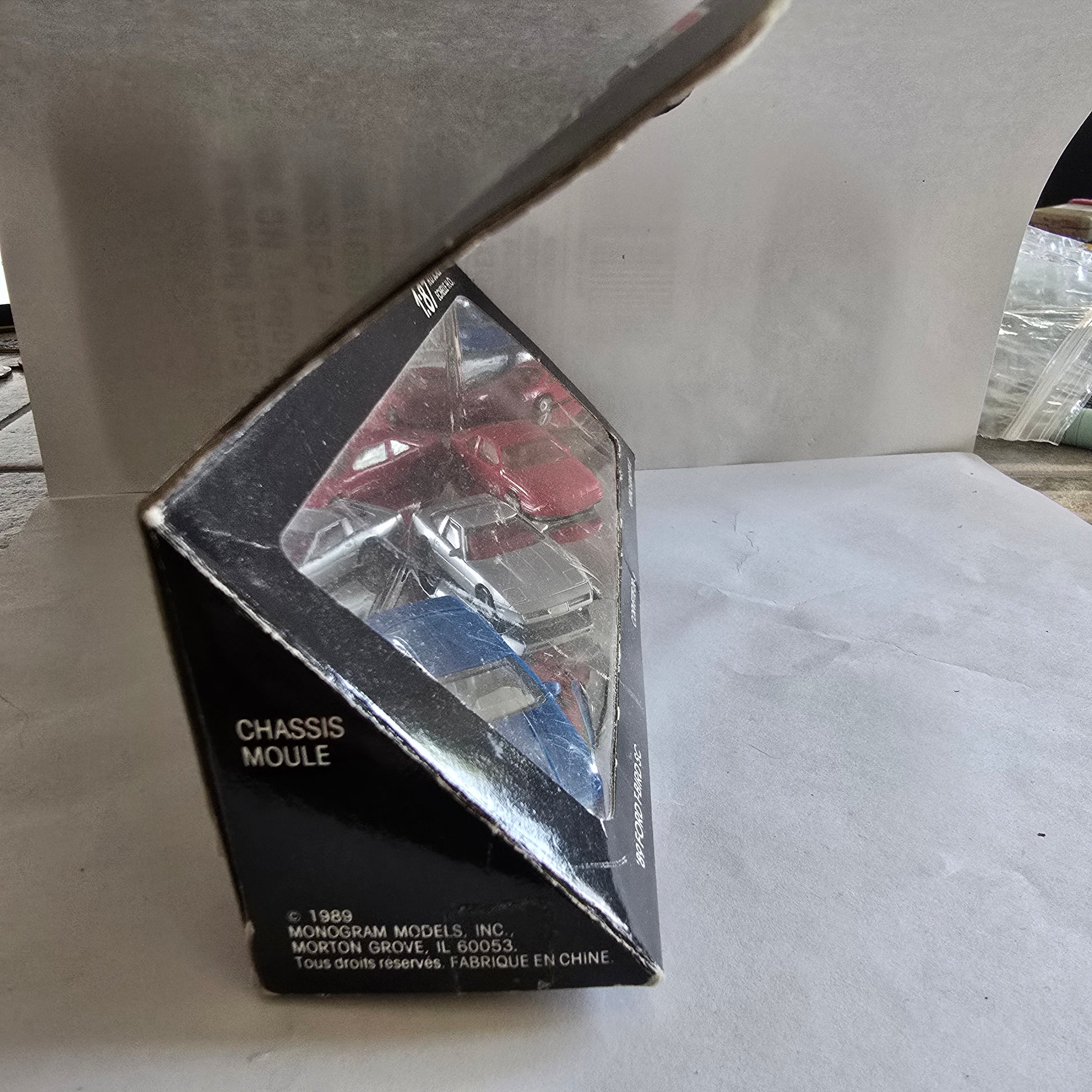 Vintage Monogram Mini Exacts American High Tech Tri-Pack, 1:87 HO scale die-cast replicas. Set includes the ’89 Ford T-Bird SC, Corvette ZR-1, and Pontiac Grand Prix SE. Cars appear unused inside the original packaging. Box shows visible wear, bending, and window scuffing from age and storage, but remains intact. Highly detailed miniatures ideal for collectors of HO scale vehicles or classic American performance cars. Back of package includes full collector trading card details for each model.