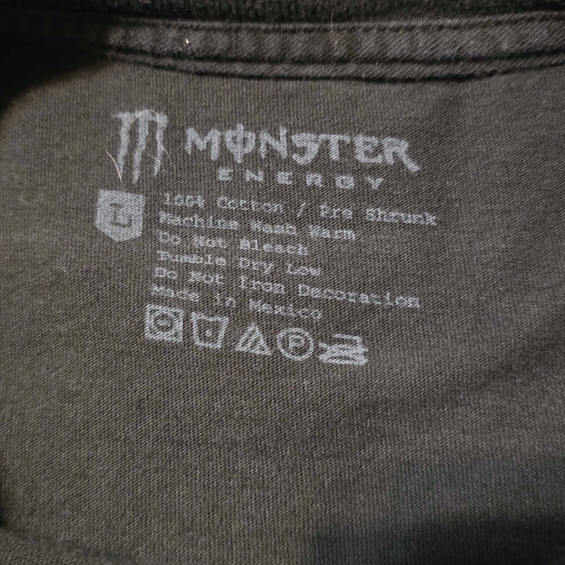 Official Monster Energy black T-shirt featuring the iconic neon green claw logo over a subtle tonal striped background. Bold, recognizable branding with a clean, minimalist back.