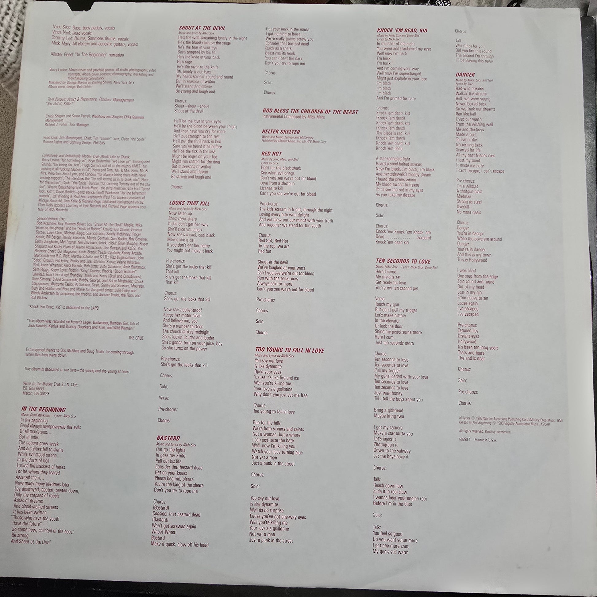 Mötley Crüe – Shout at the Devil (1983 US Elektra LP) Original Inner Sleeve