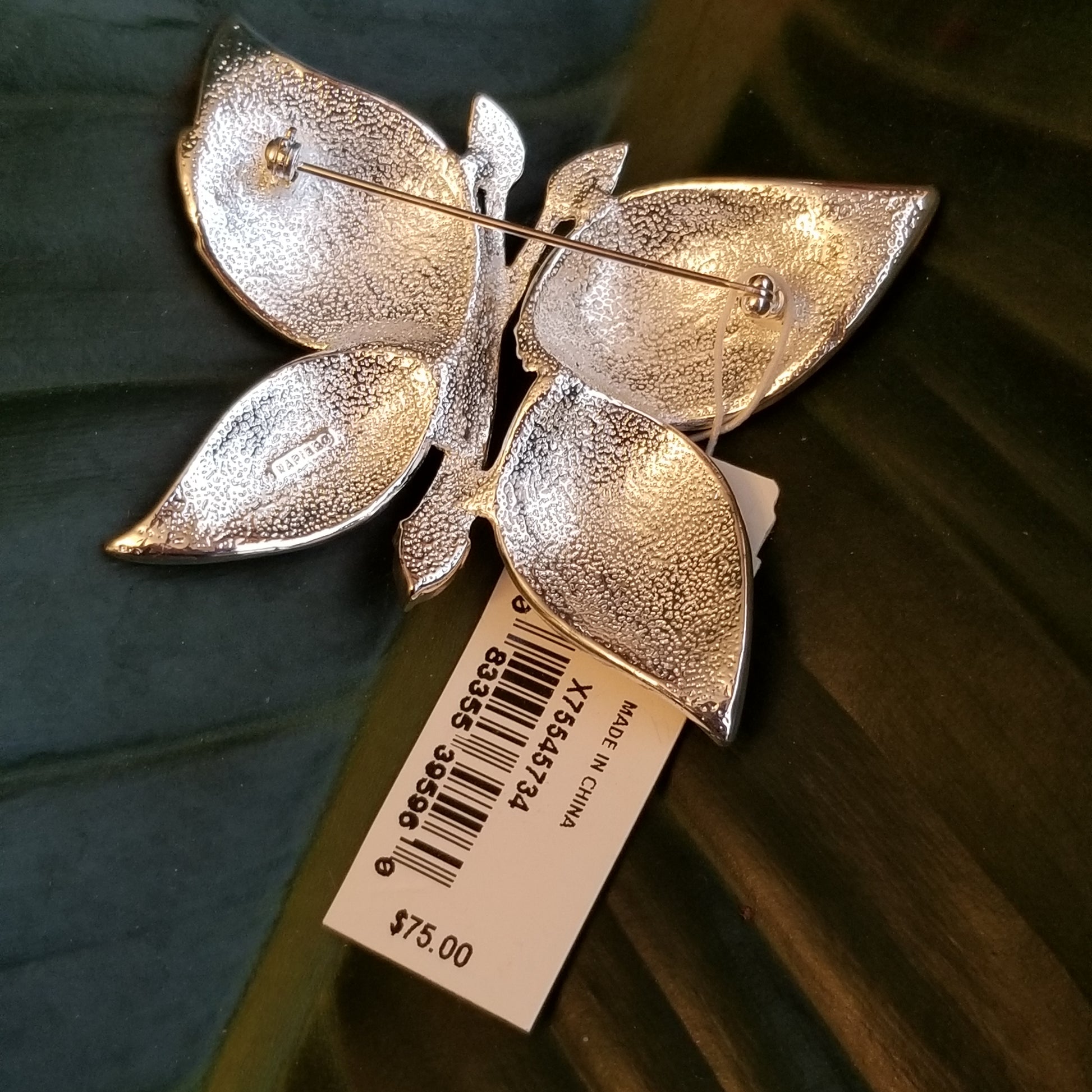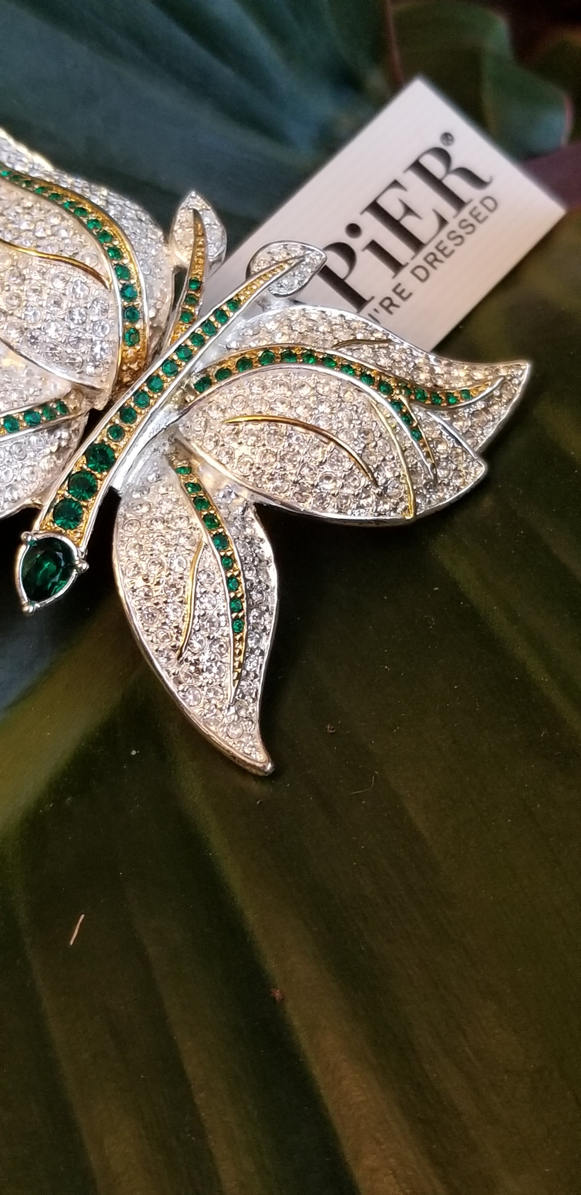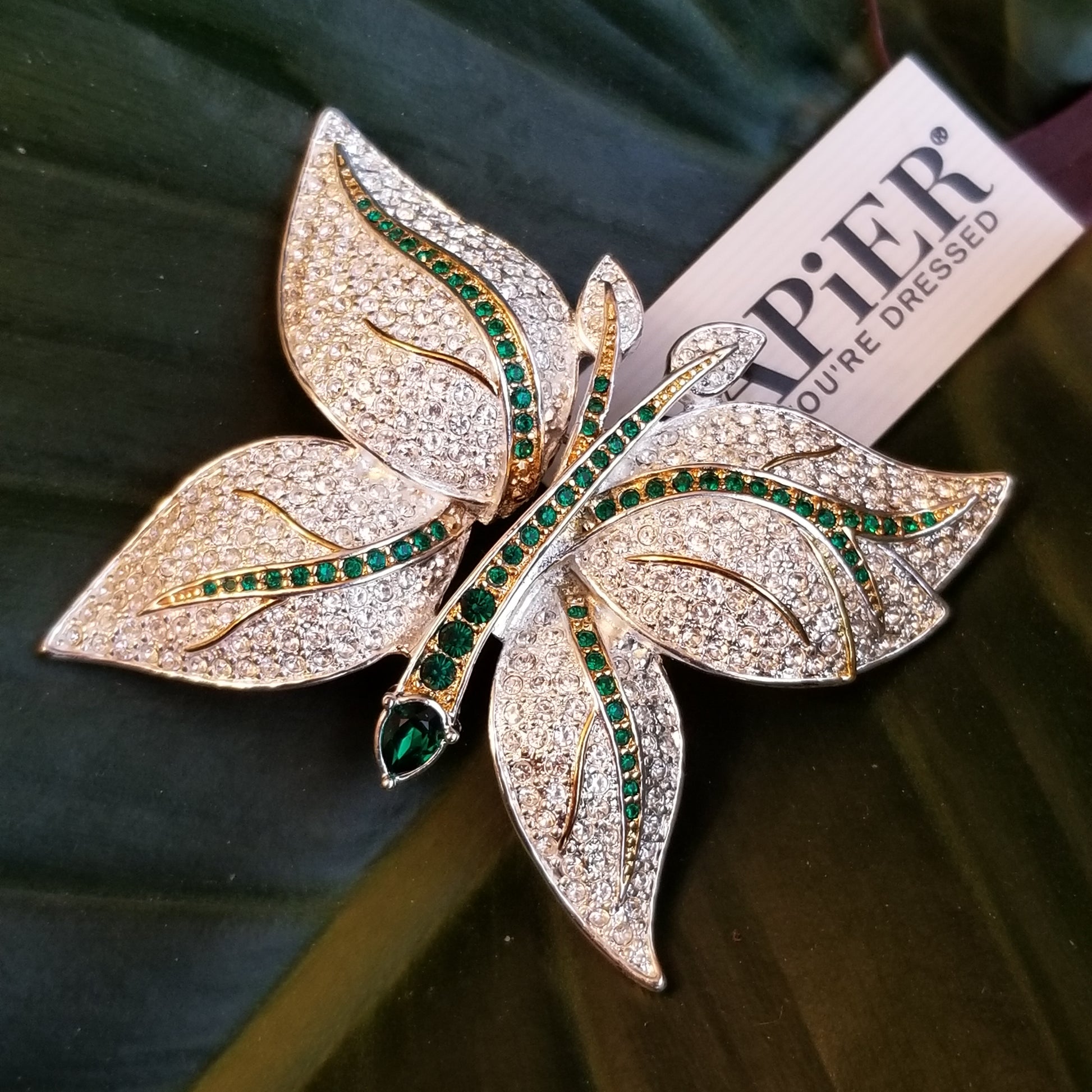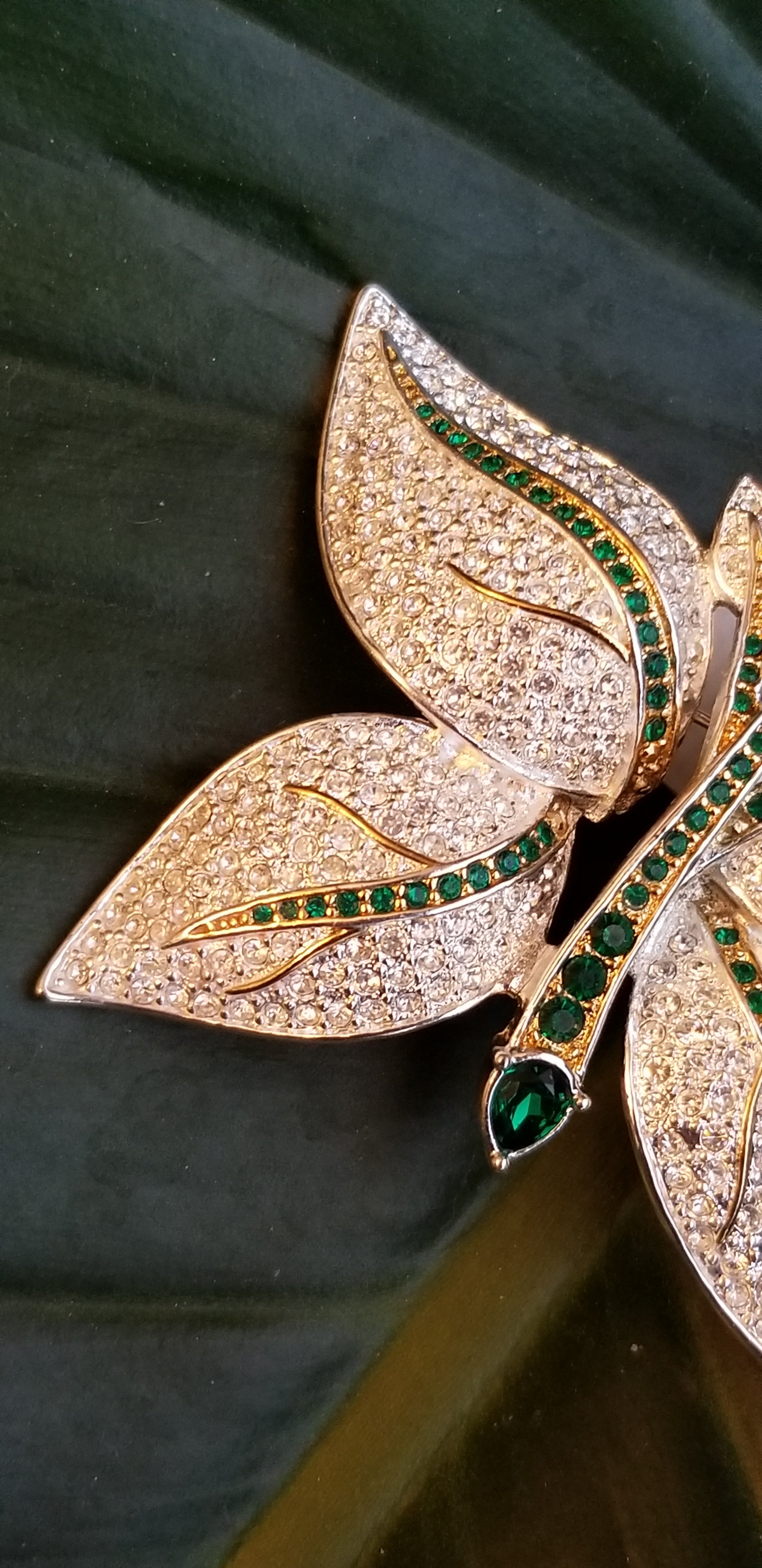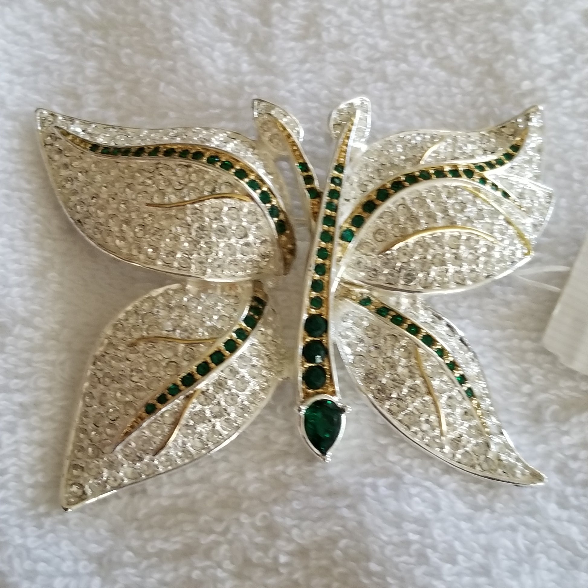 Beautiful silver plate rhinestone butterfly Accented with green and gold colors