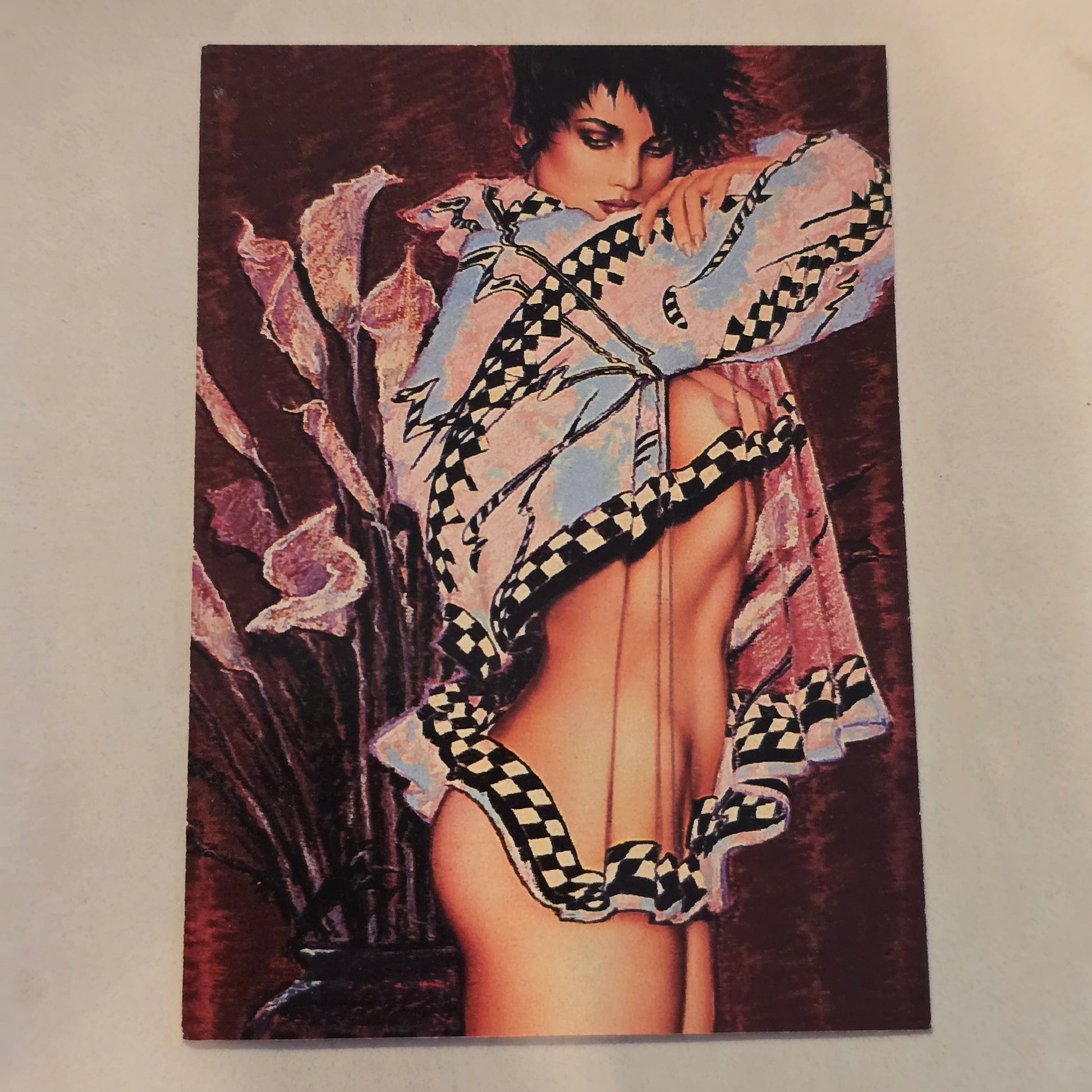 This card showcases Olivia’s signature use of gouache and pastel on board, capturing the sensual elegance and bold composition that defined her mid-1980s work. Heat Wave is a visually striking piece from a highly sought-after era of Olivia’s career and remains a favorite among collectors of vintage pin-up art.