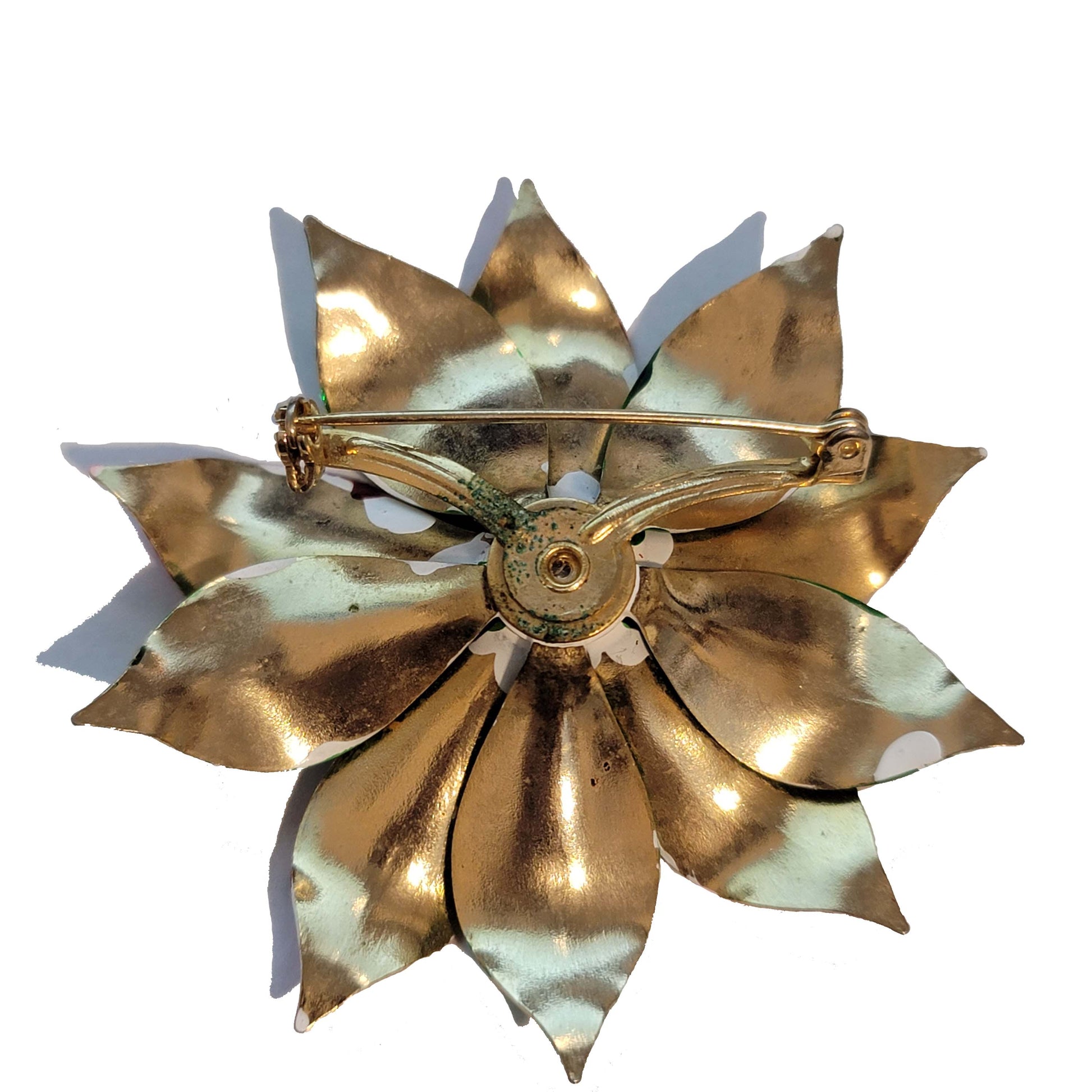 In good preowned wearable condition. has a AB bead in the center of the poinsettia. has some signs of wear.
