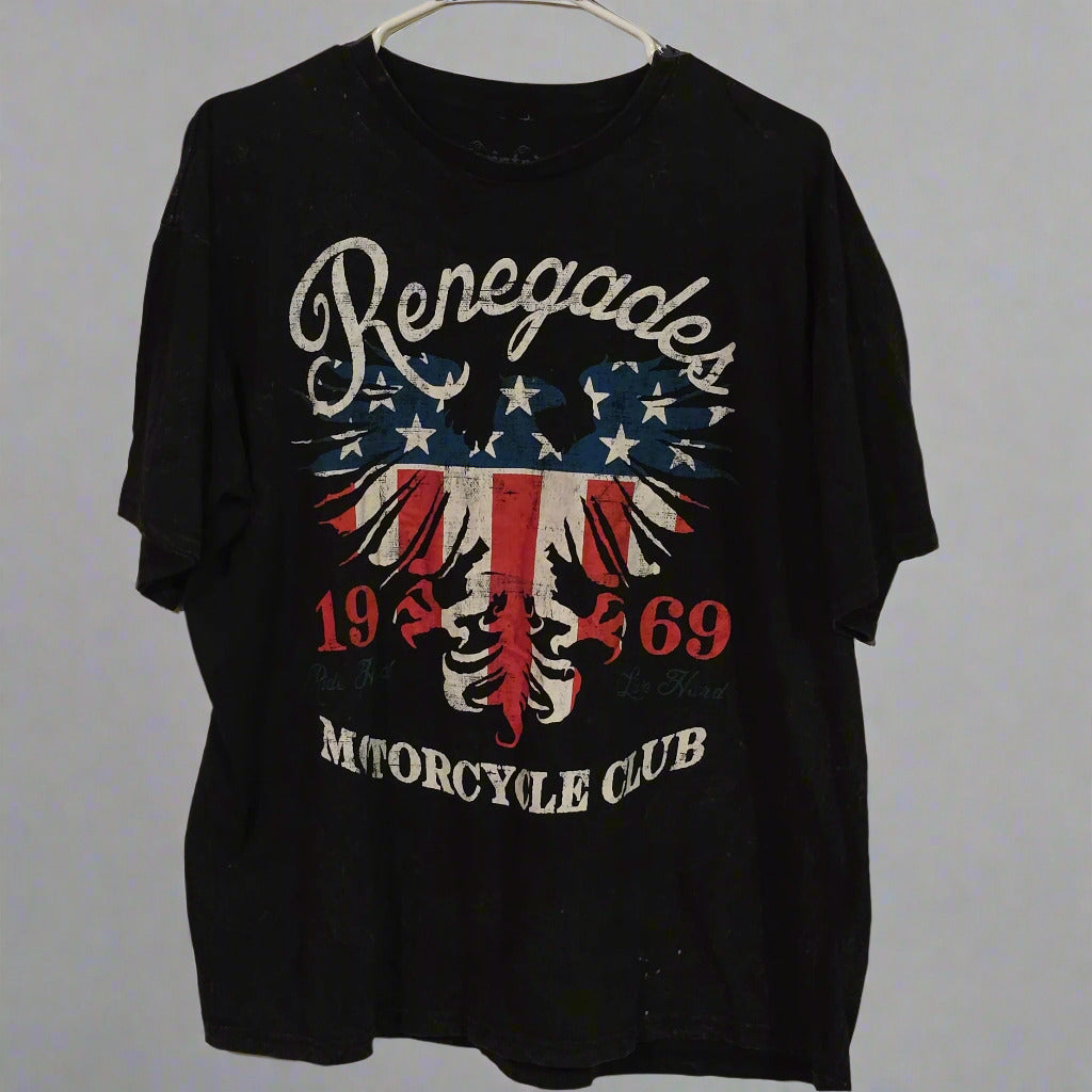 This bold black graphic tee features a vintage-inspired “Renegades Motorcycle Club” design with a distressed eagle graphic in red, white, and blue. The shirt includes the year 1969 across the front, adding to its retro biker style. Made from soft cotton, it’s comfortable and perfect for casual or streetwear looks.