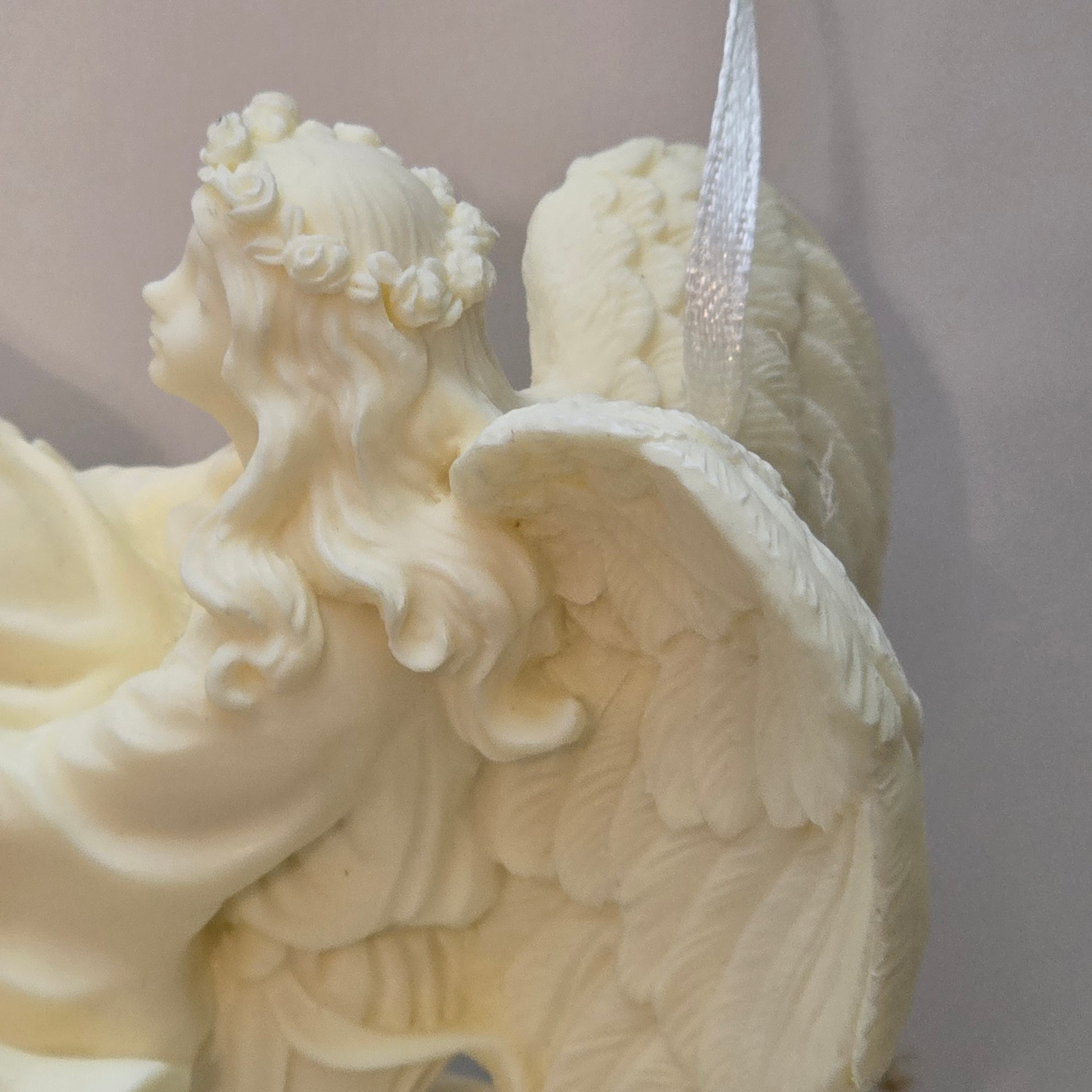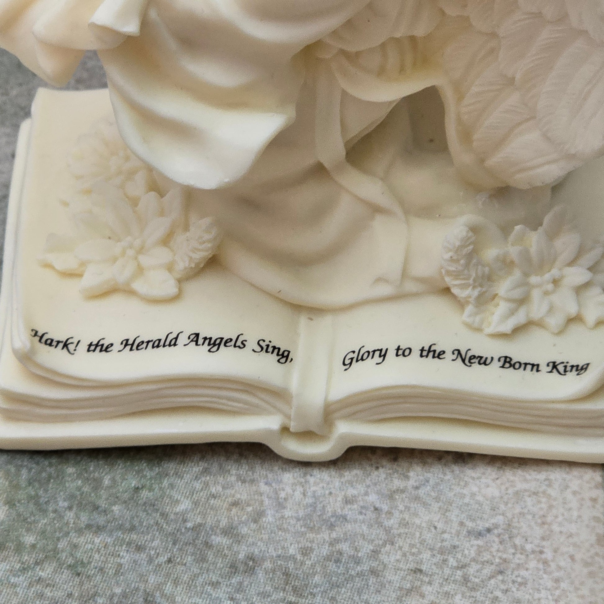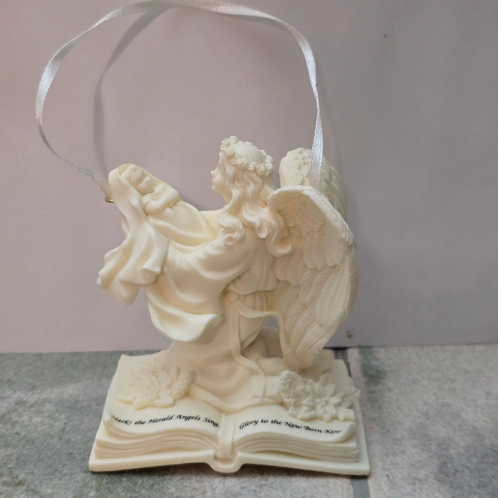Roman Inc. Angel with Baby Jesus Ornament Figurine 2001 – Christmas Nativity – Hark the Herald Angels SingThis lovely ornament by Roman Inc. (2001) depicts a serene angel cradling the Baby Jesus above an open book base inscribed with the classic carol “Hark! the Herald Angels Sing, Glory to the New Born King.” Crafted in ivory-tone resin with delicate detail, this inspirational piece can be displayed as a figurine or hung as an ornament with the attached ribbon.
