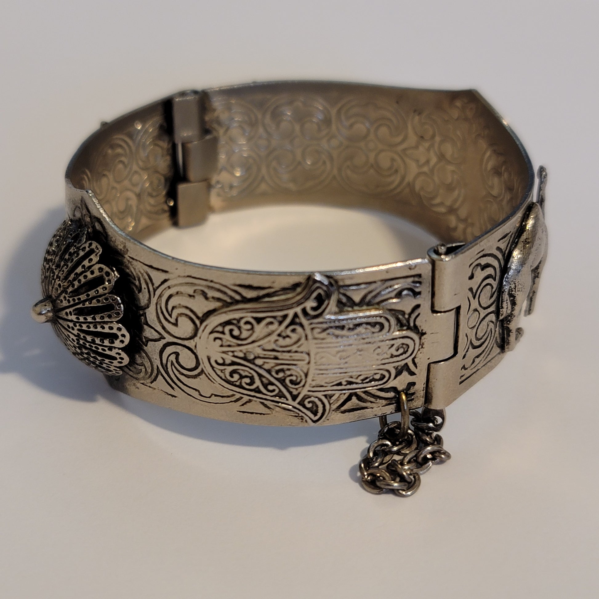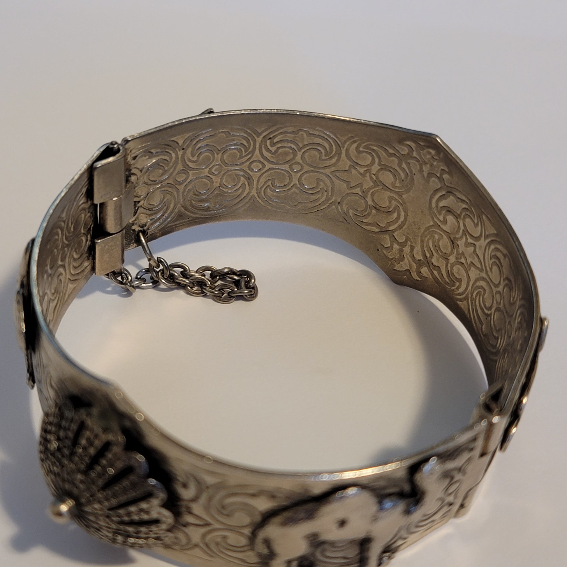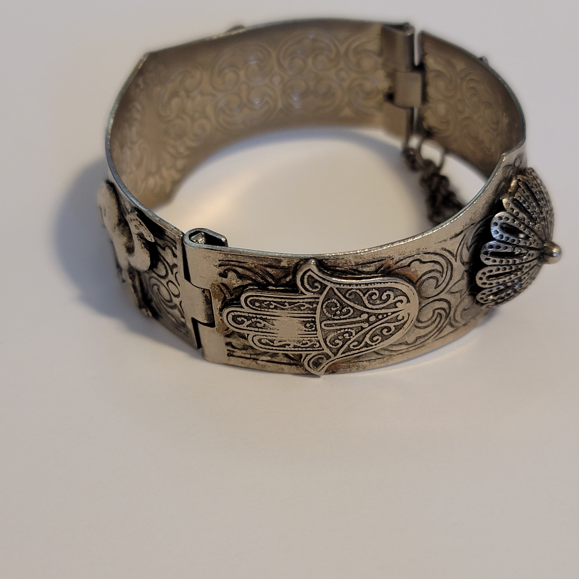 In good preowned wearable condition. Hinged, has a pin to lock the bracelet from opening.