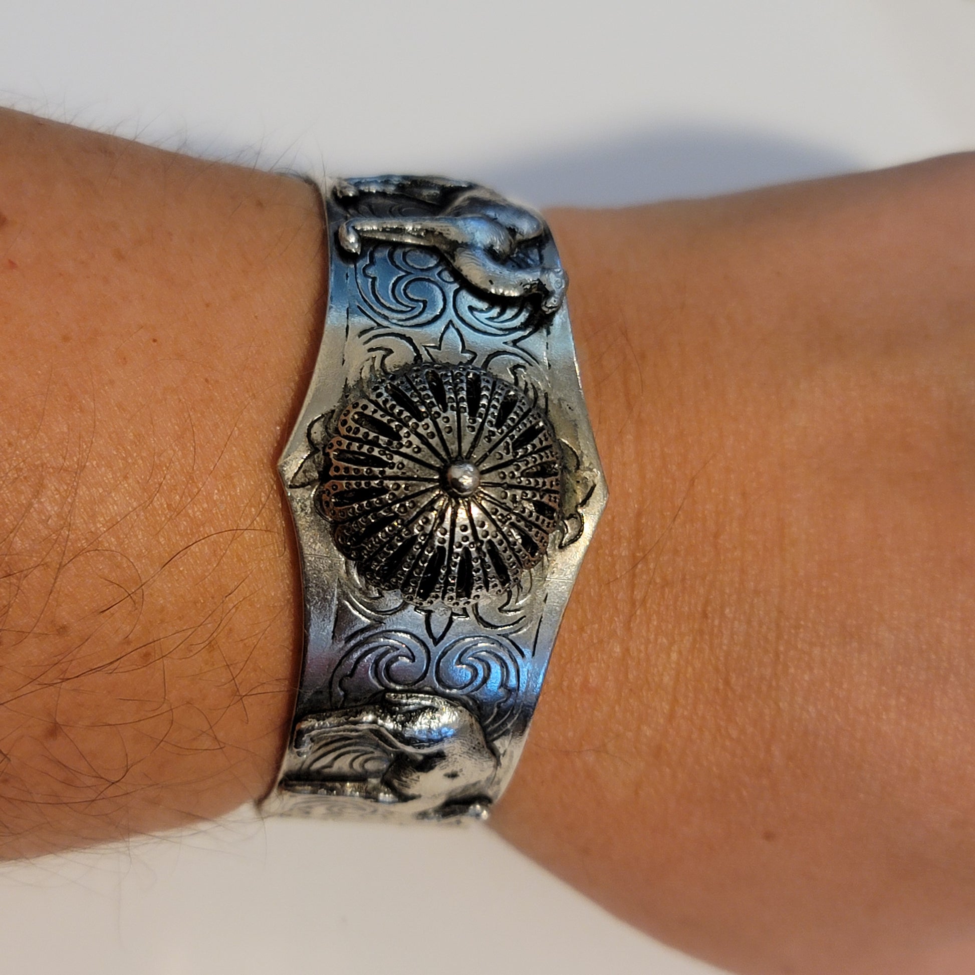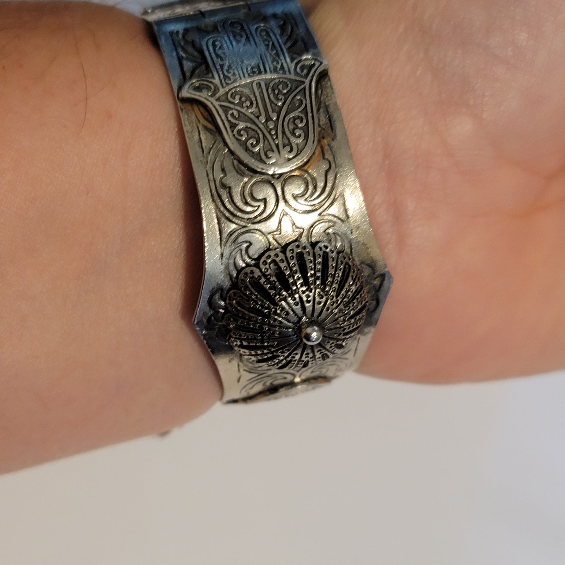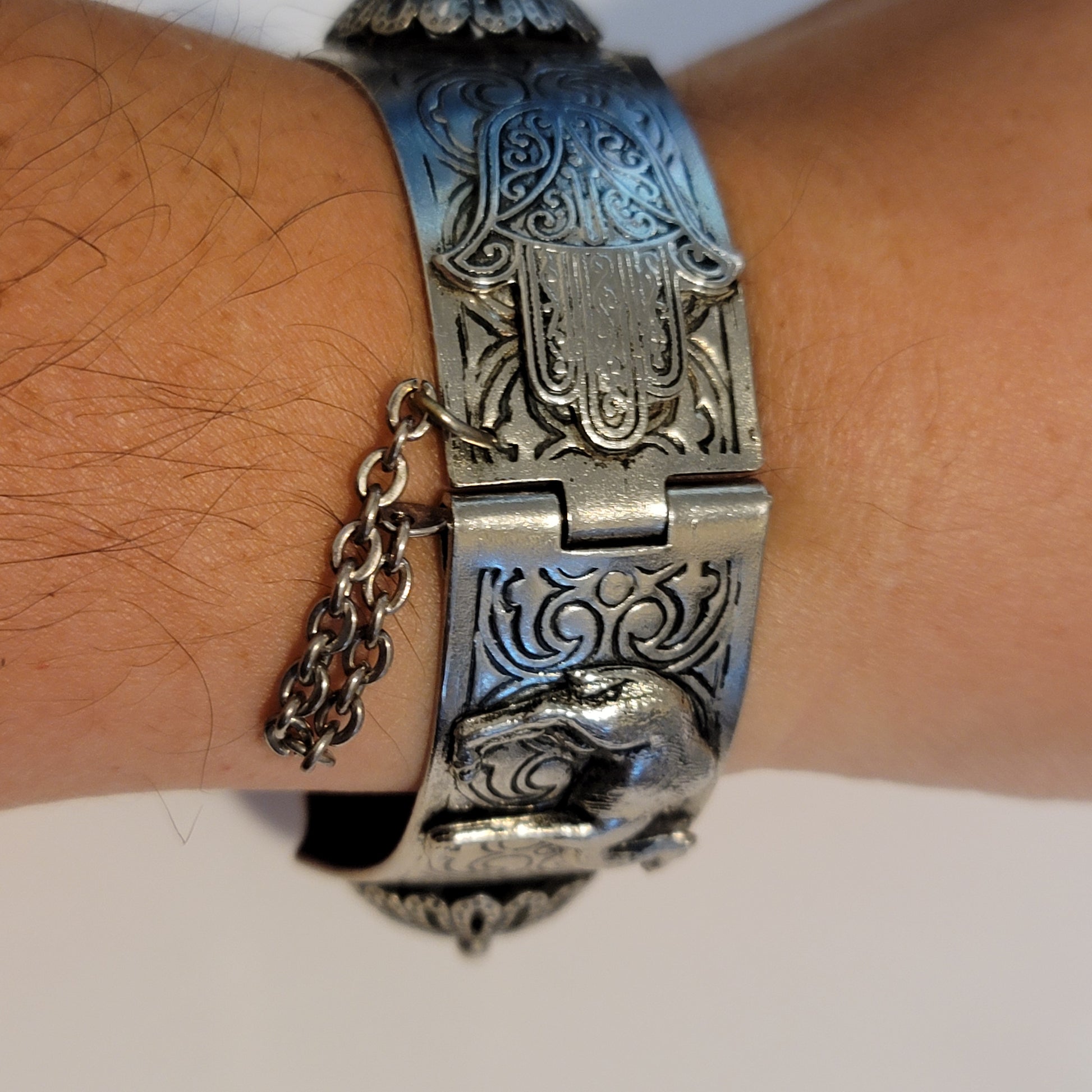 In good preowned wearable condition. Hinged, has a pin to lock the bracelet from opening.
