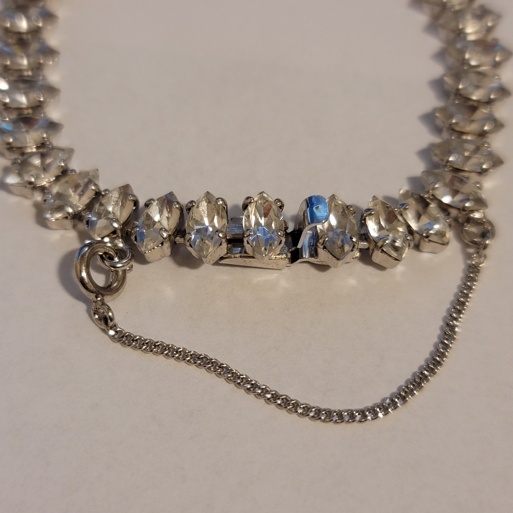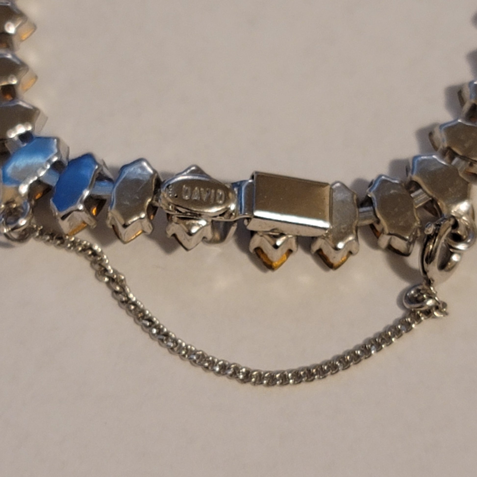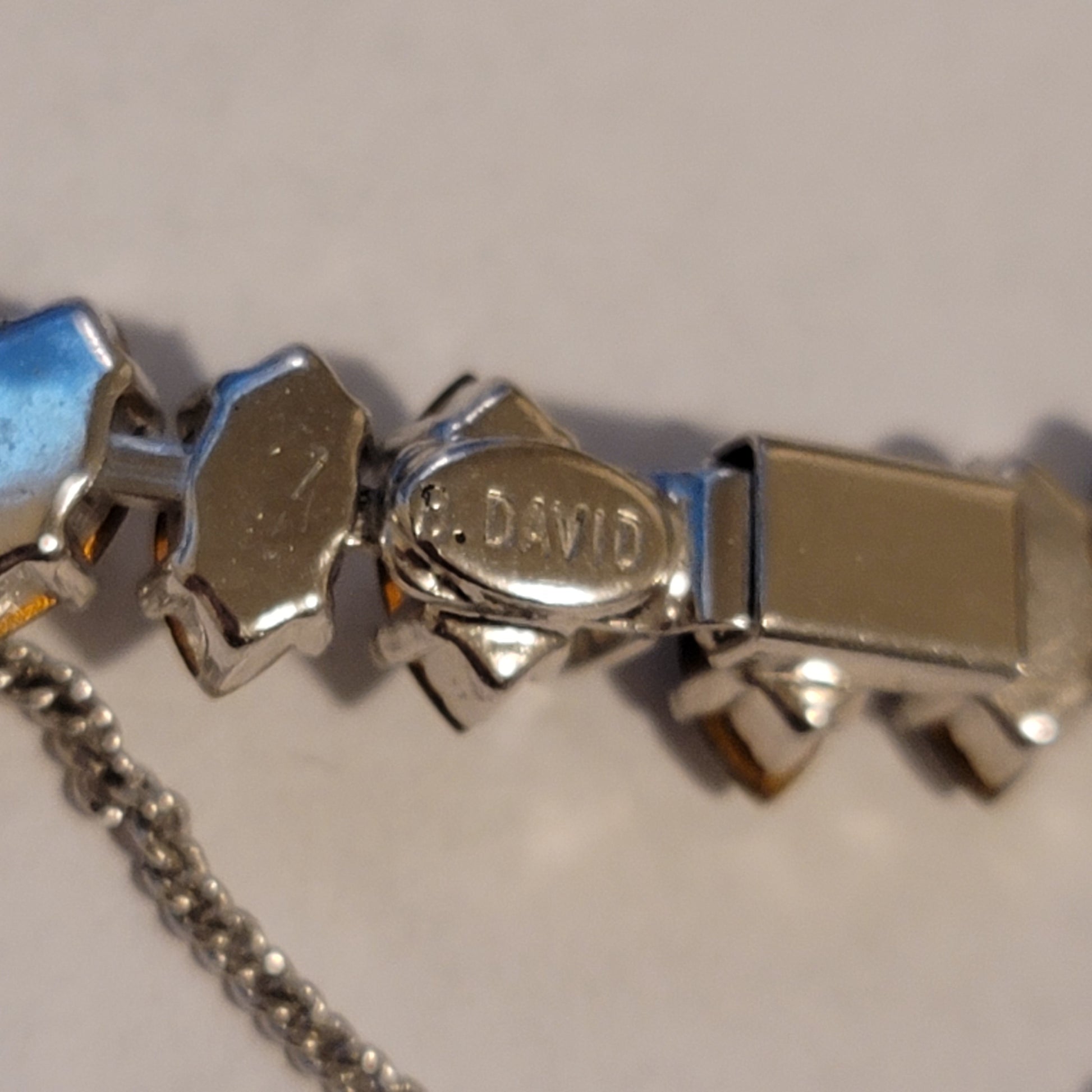 foil back rhinestones. B. David was know for its high quality costume jewelry. Each rhinestone is in a pronged setting. Has the security chain