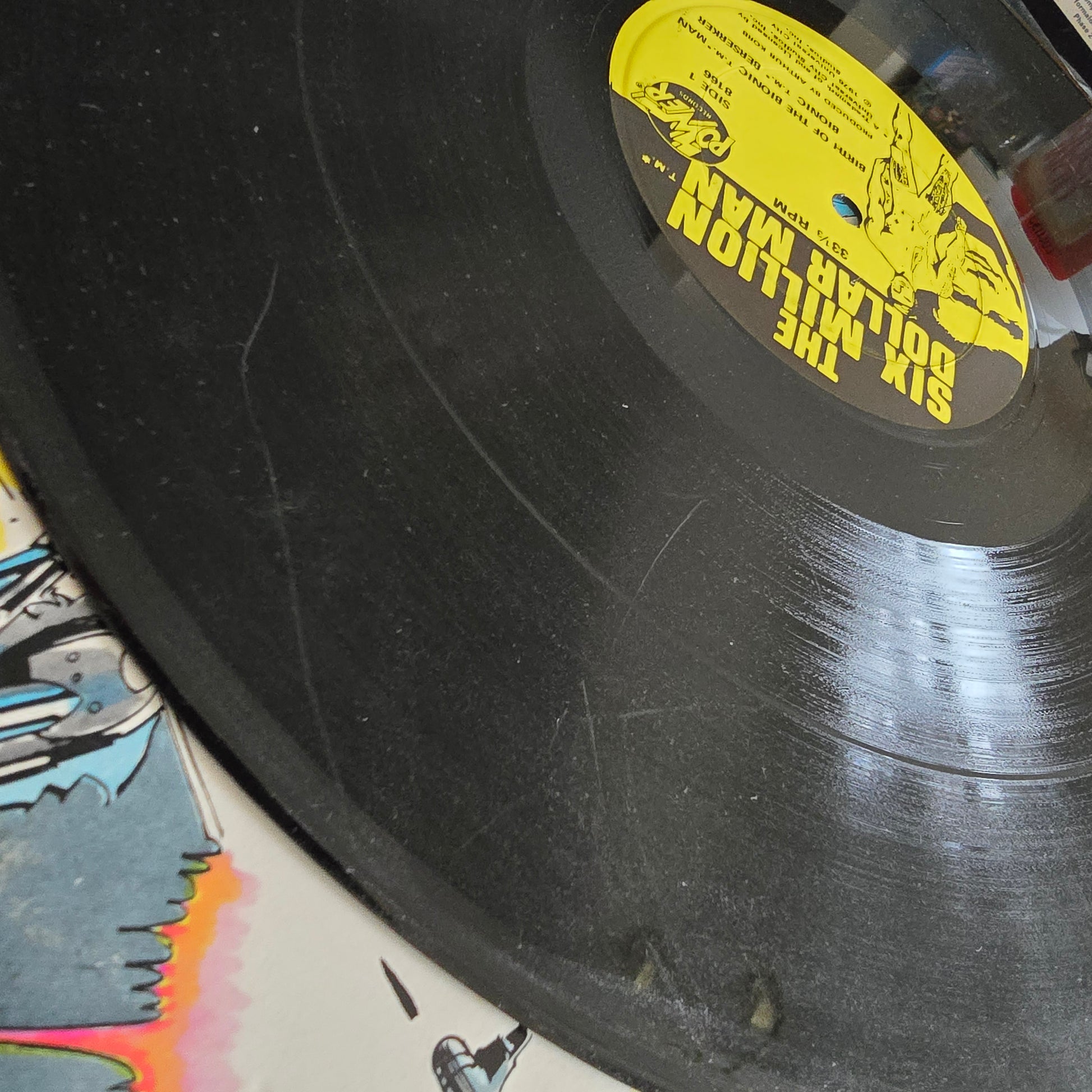 Ships securely with record removed from sleeve.Original 1975 Power Records first pressing of The Six Million Dollar Man, featuring four action-packed story episodes from the classic TV series.