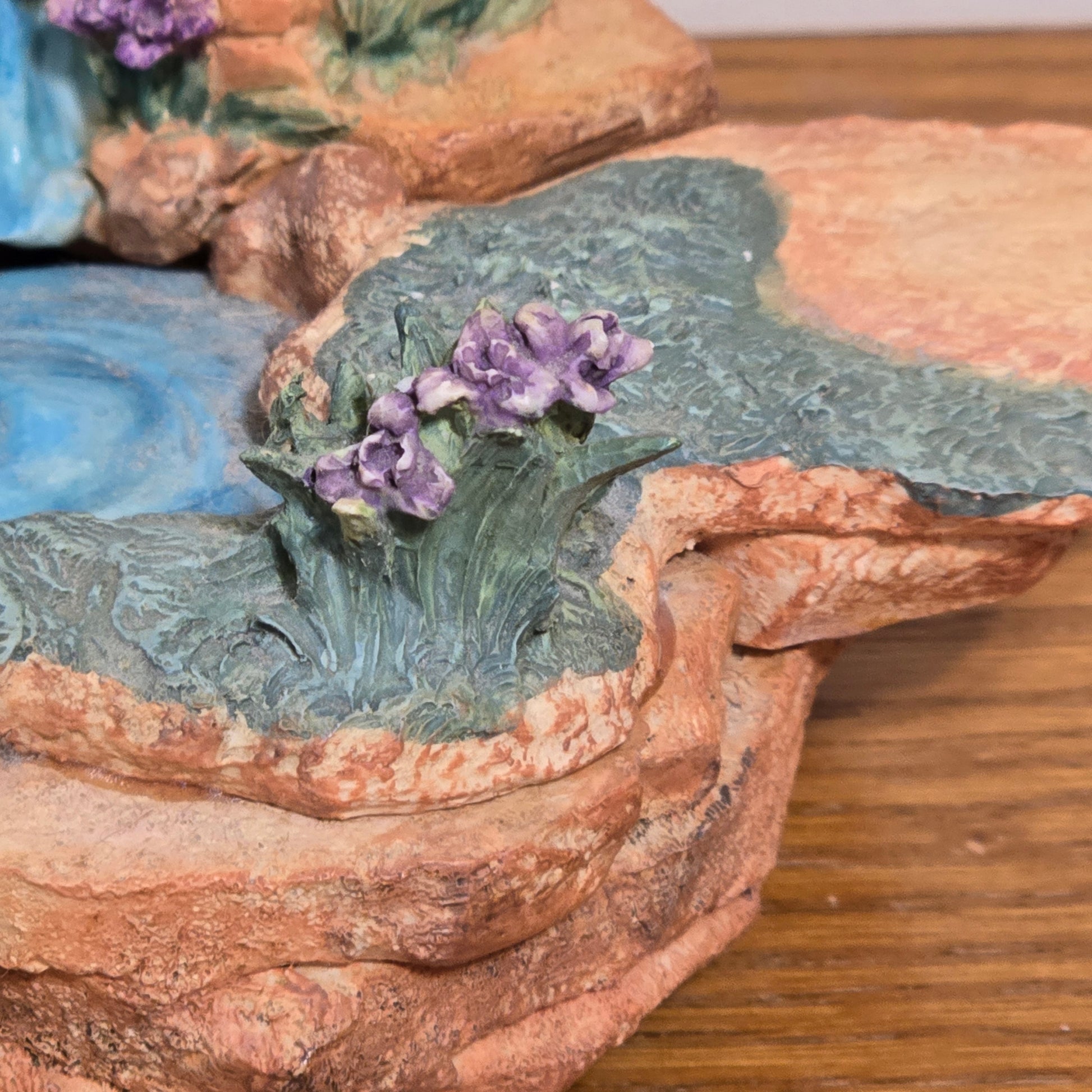 Beautiful Friends of the Feather collectible figurine by Enesco, designed by Karen Hahn in 1998 (Model #477664). This lovely piece depicts a cascading waterfall scene surrounded by flowers and stone-like ledges, with a young girl holding a gray bunny by the water’s edge. The textured detail and soft Southwestern color palette reflect the warmth and spirit of the Friends of the Feather series.