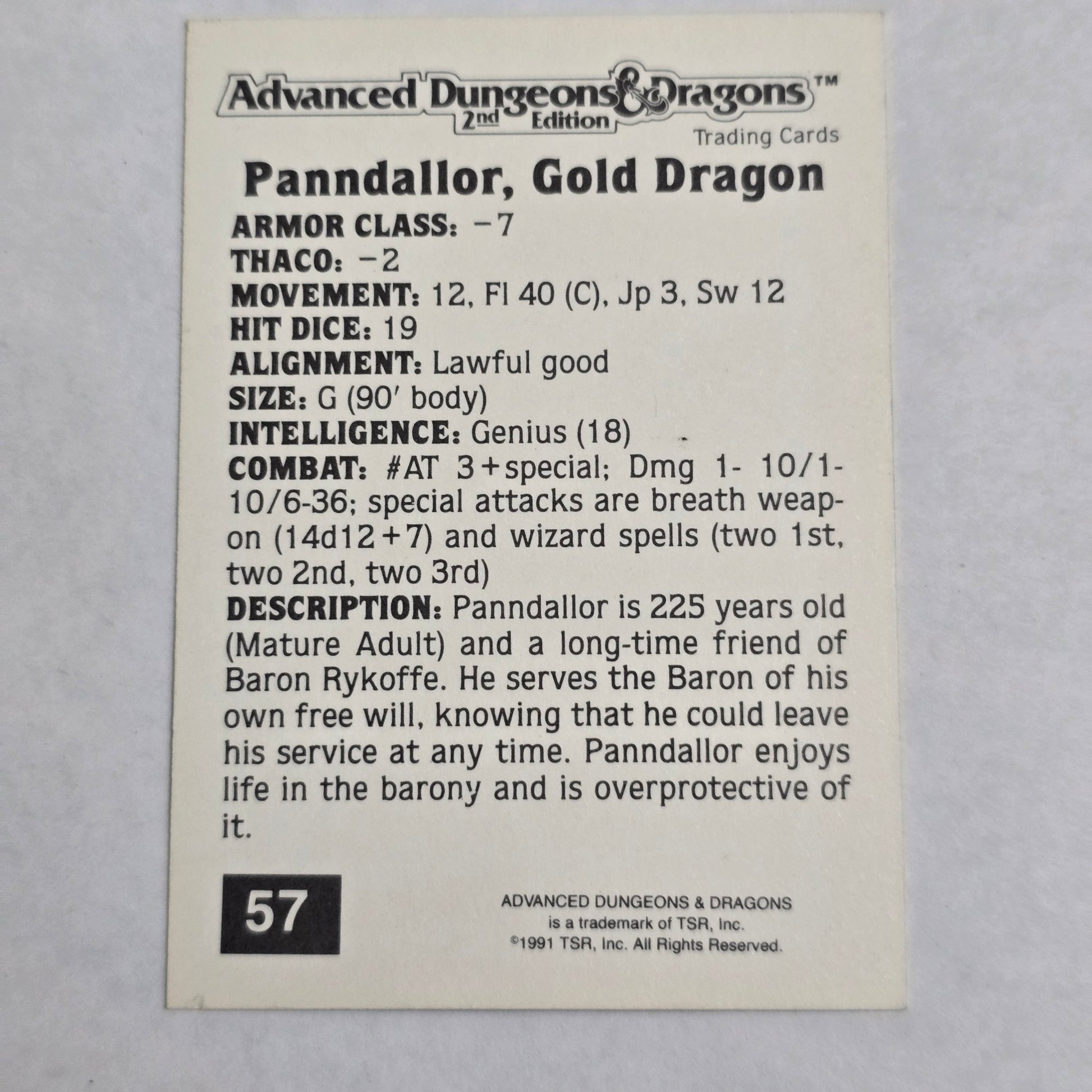 Official Advanced Dungeons & Dragons 2nd Edition trading card featuring Panndallor, Gold Dragon, card #57.