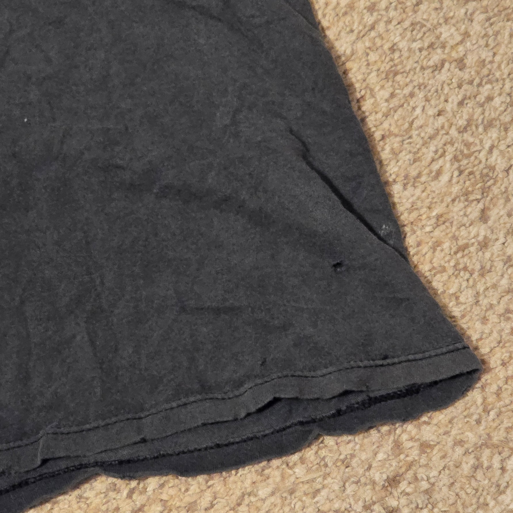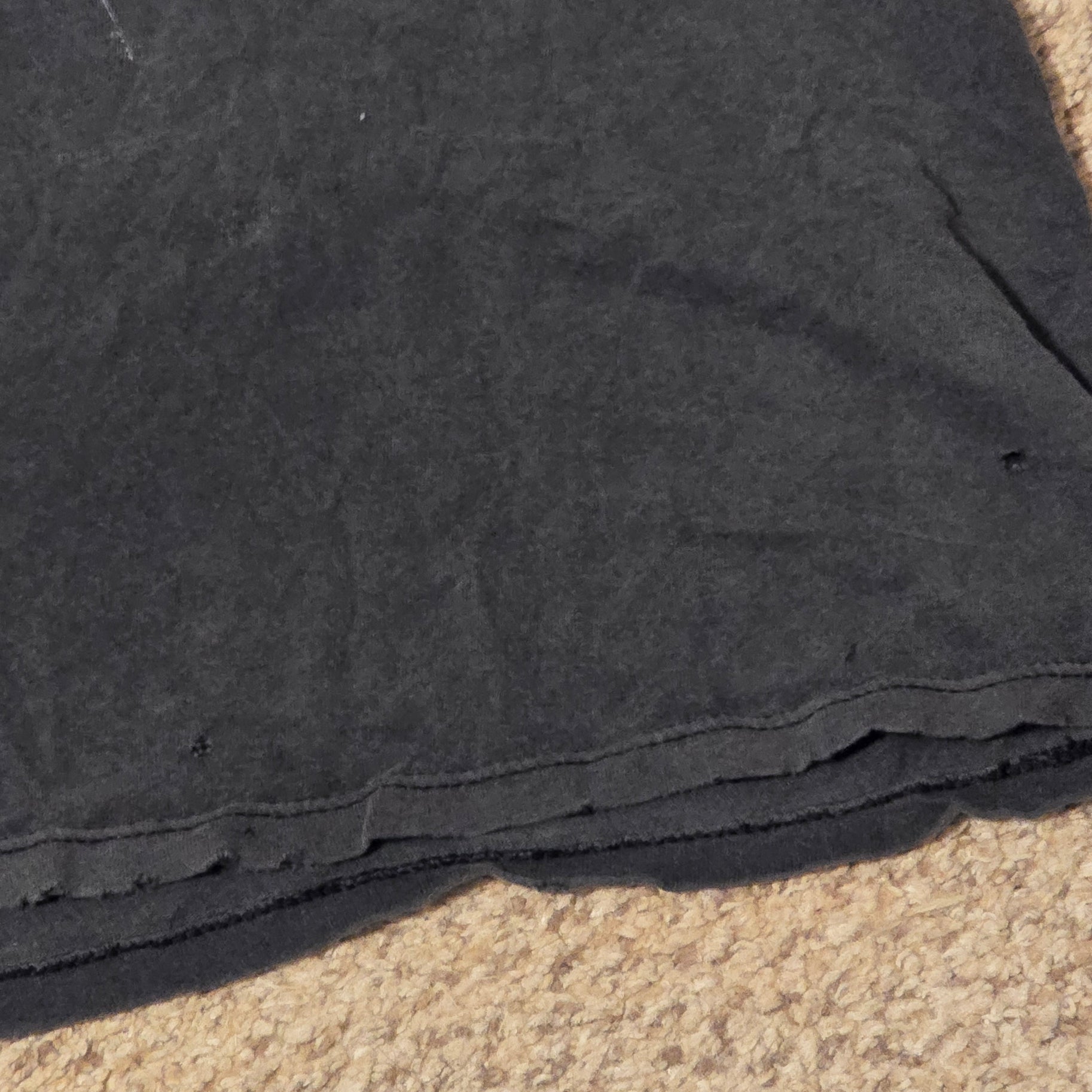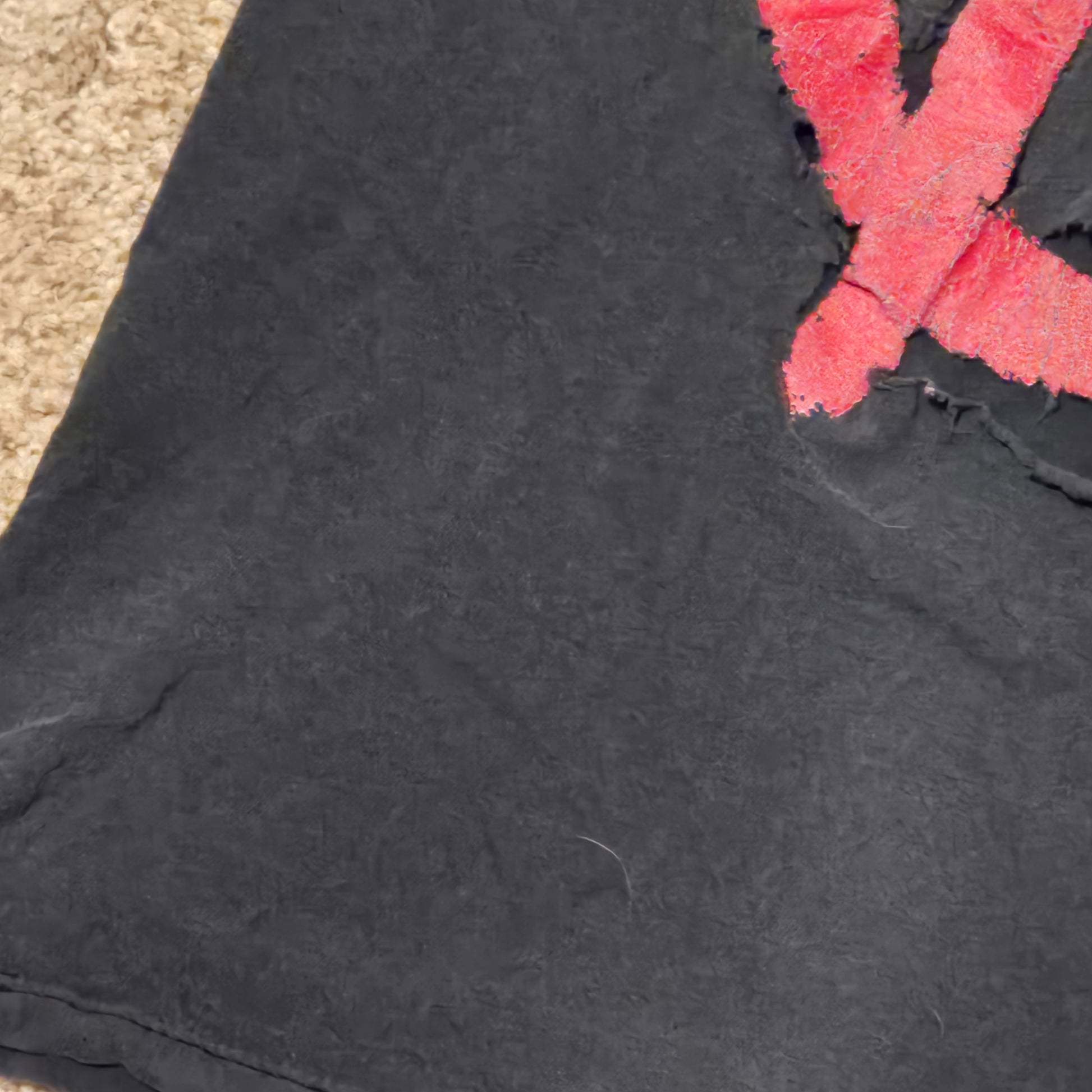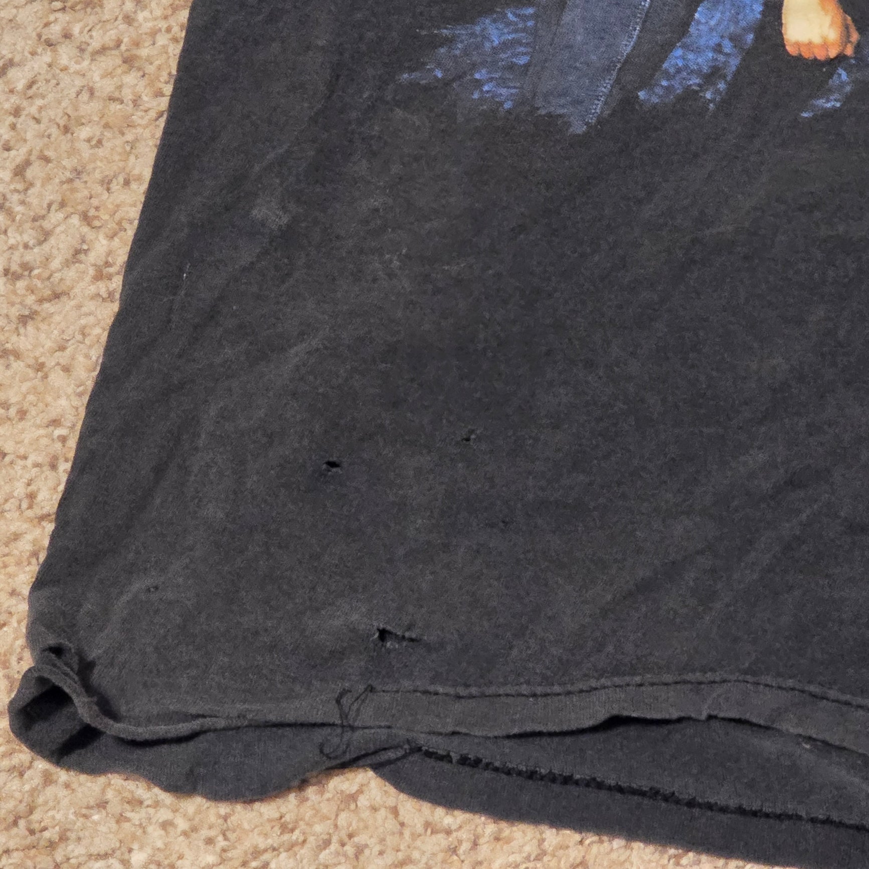 Condition: Heavy distressing — holes, frayed edges, cutoff sleeves, and cracking throughout graphic. Fabric remains soft and wearable; a true relic for collectors.