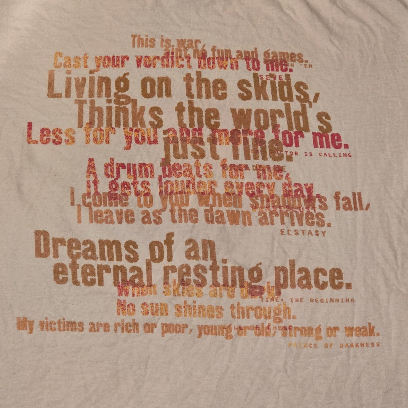 Authentic vintage 1994 Megadeth Risk T-shirt featuring the rare sphynx cat graphic on the front and printed lyrics on the back. This original Tultex tag tee is a must-have for true metal fans and collectors of 1990s band merch.