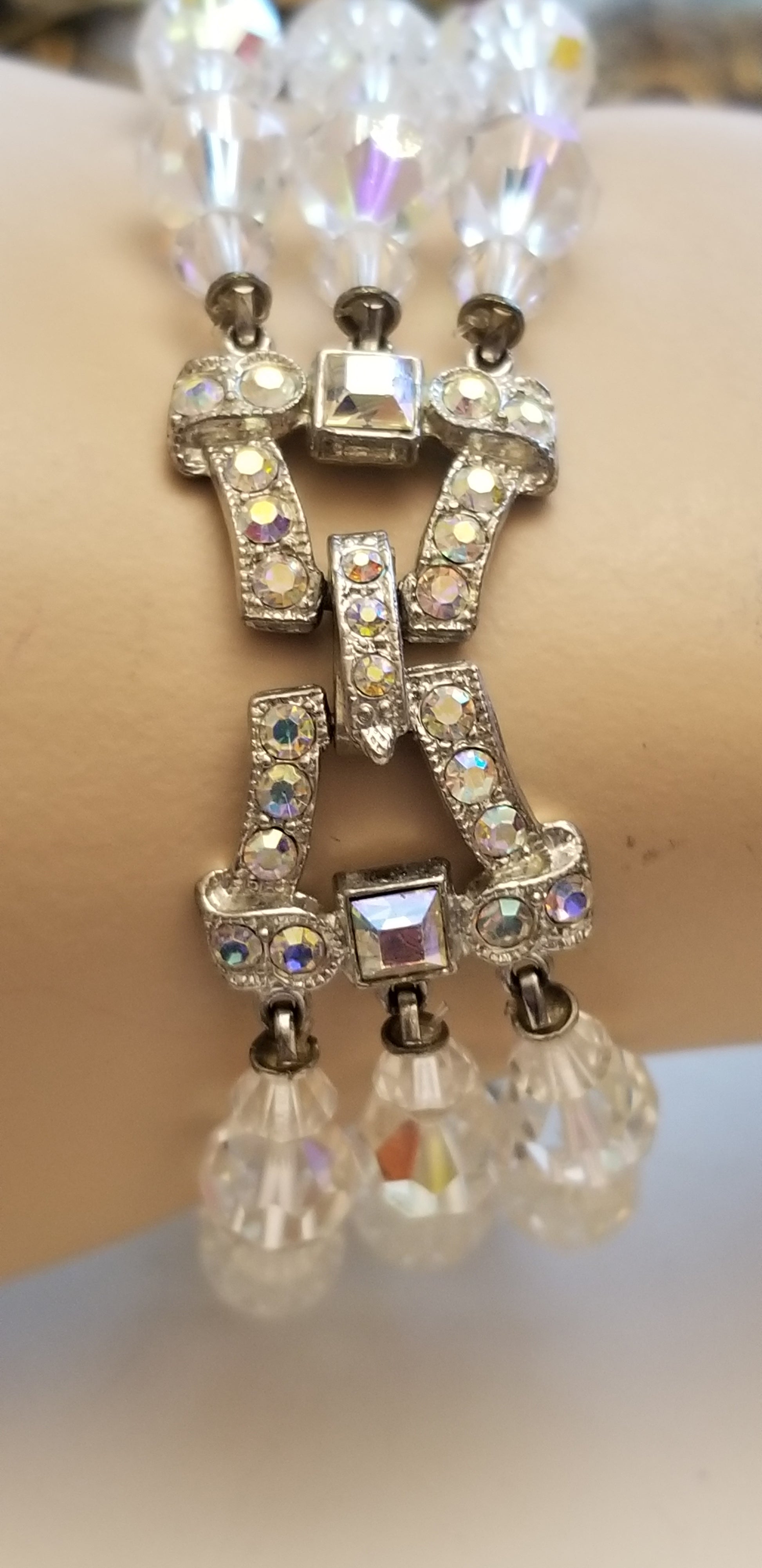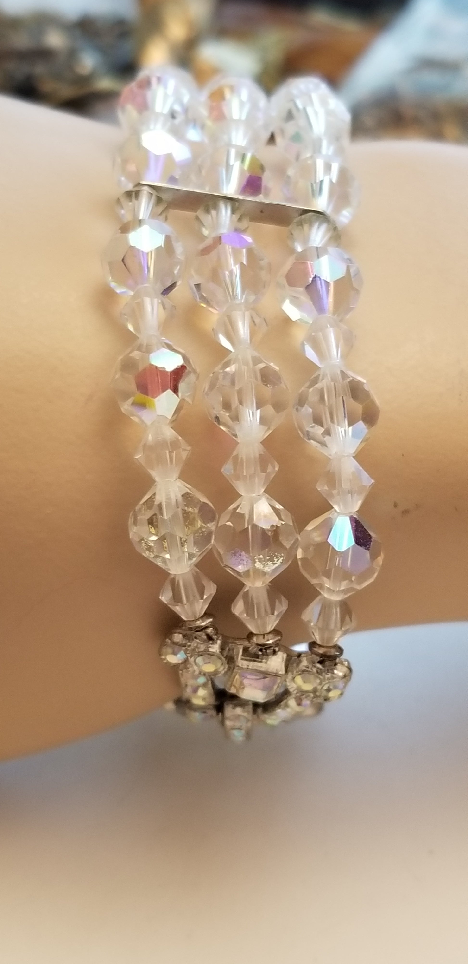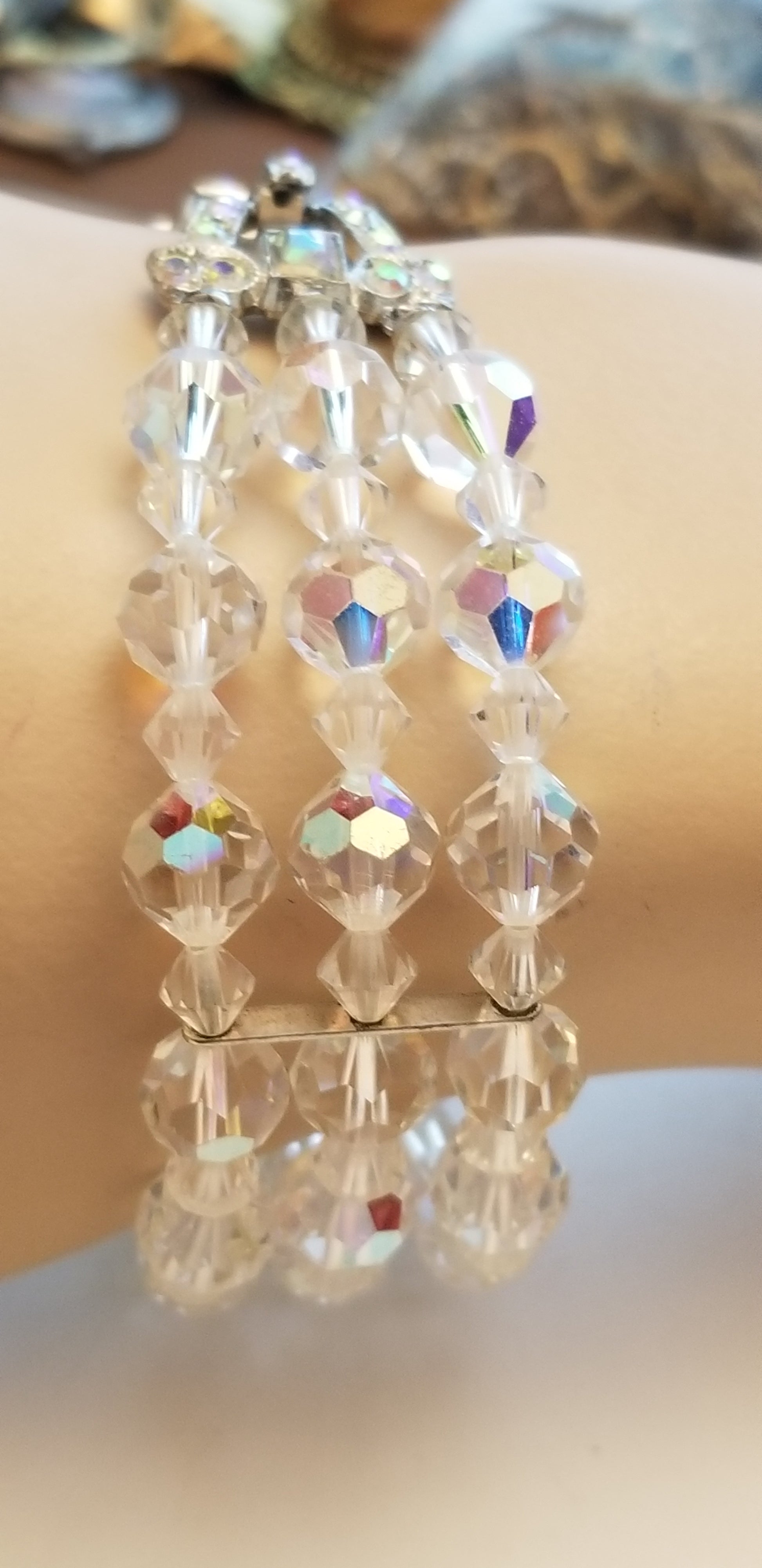 3 strands of AB beads, silver tone with Aurora Borealis beads and rhinestones. In beautiful condition.