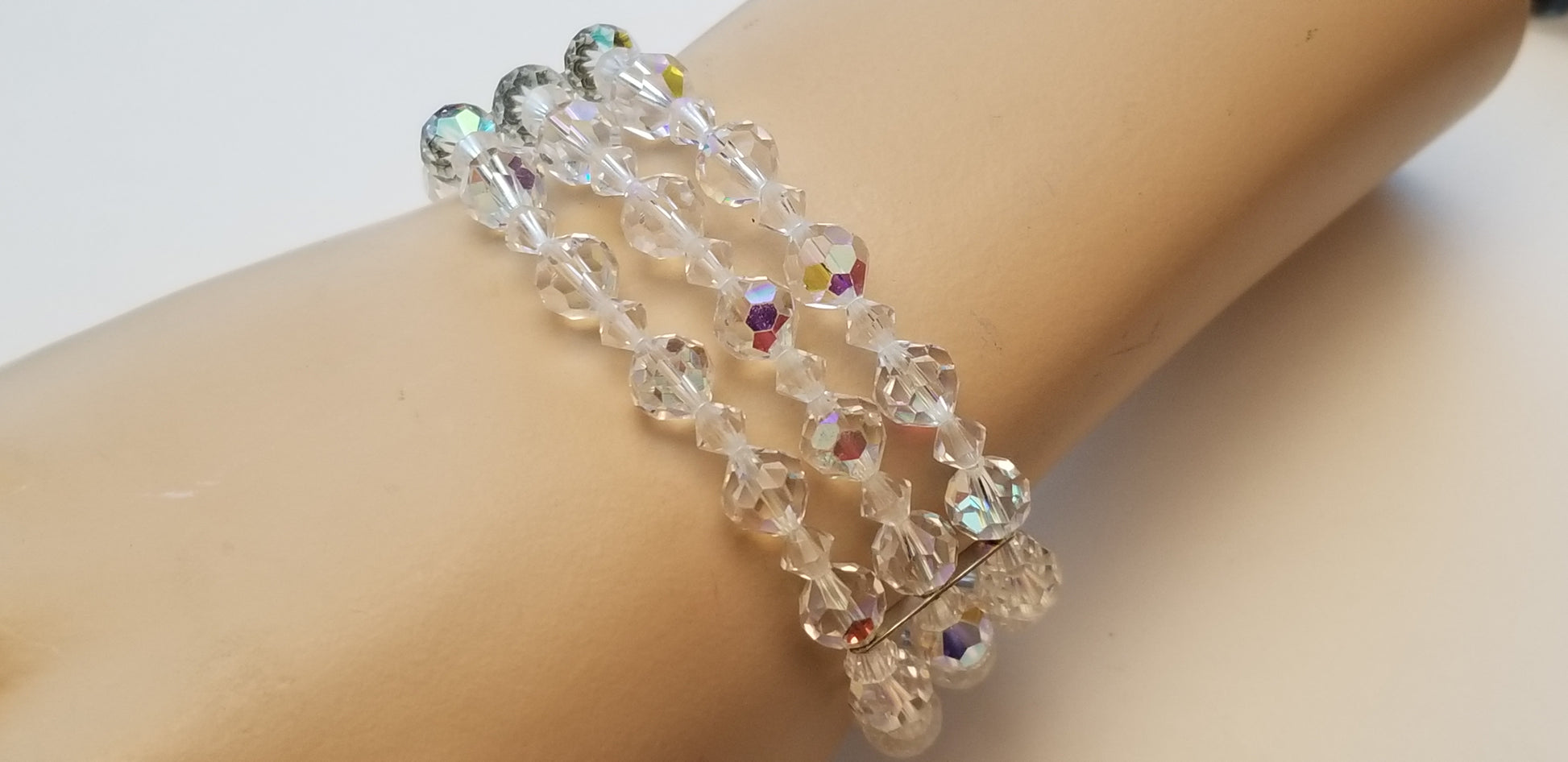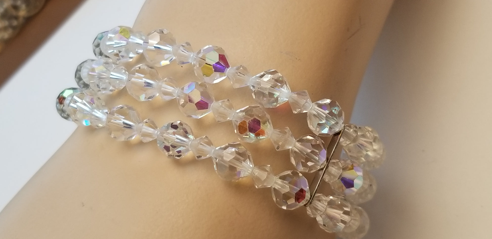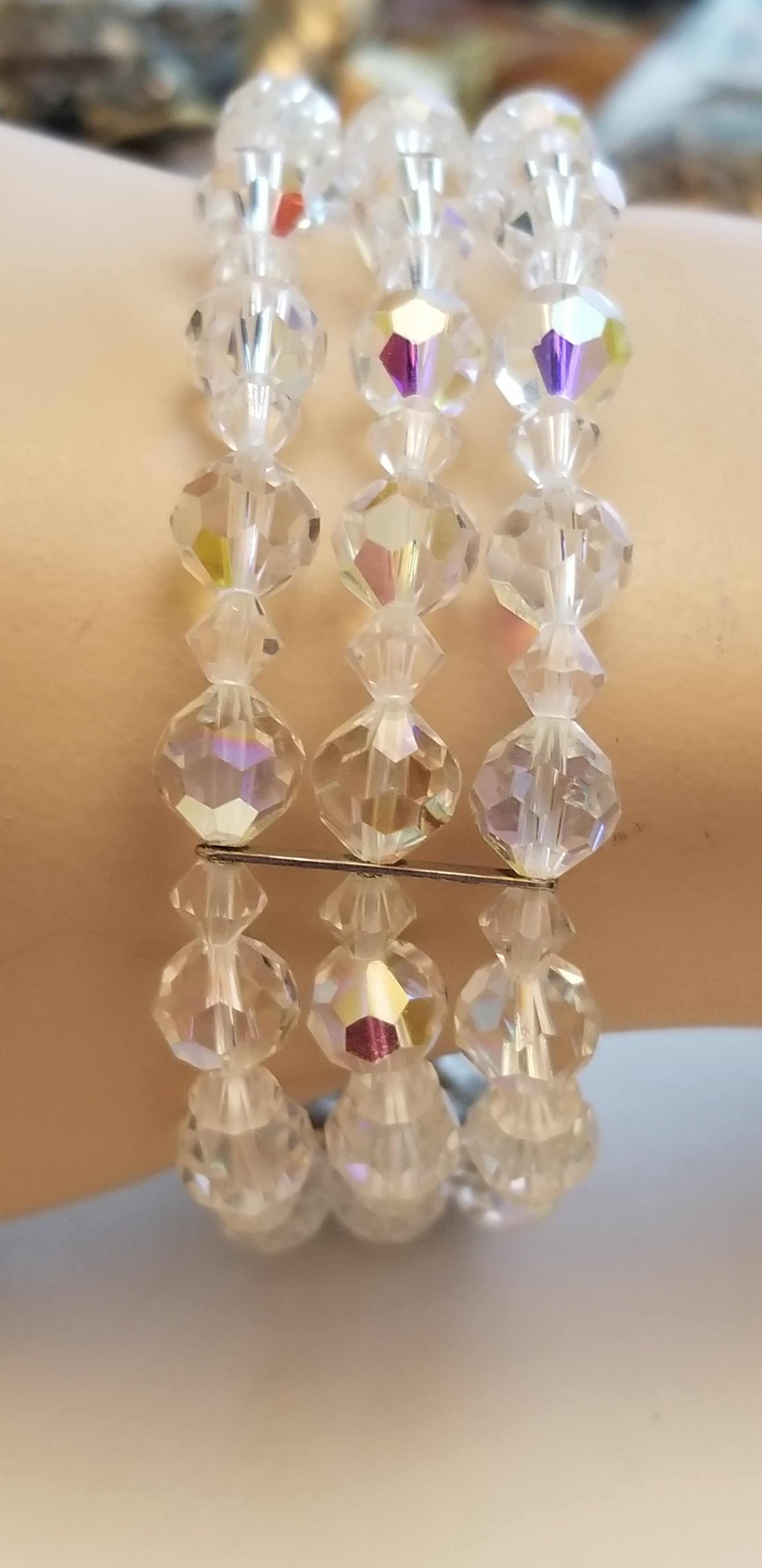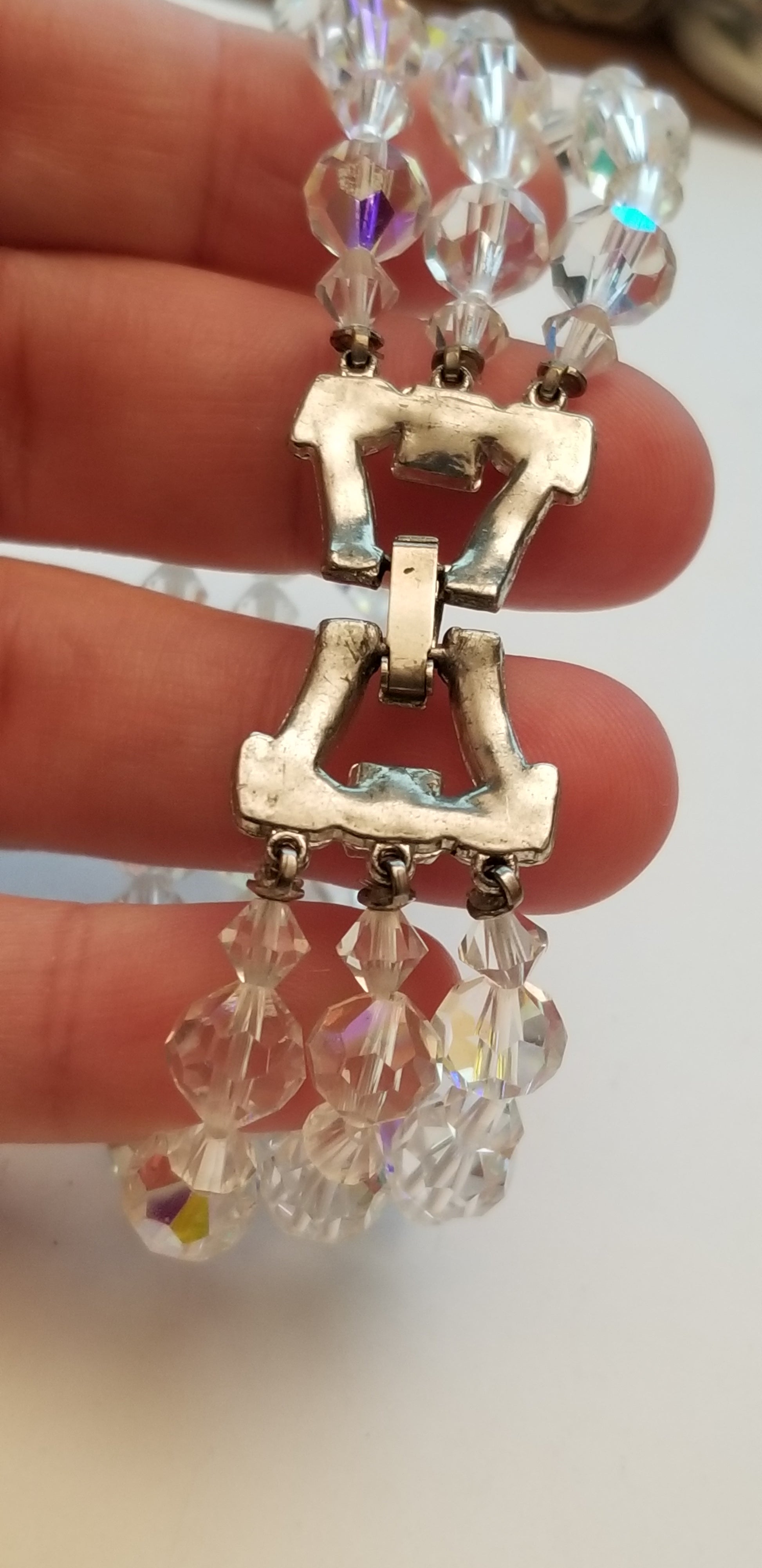 3 strands of AB beads, silver tone with Aurora Borealis beads and rhinestones. In beautiful condition.