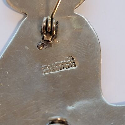 Latch on the back is missing the part that closes to secure the pin in place. Other then that the brooch is in good condition.