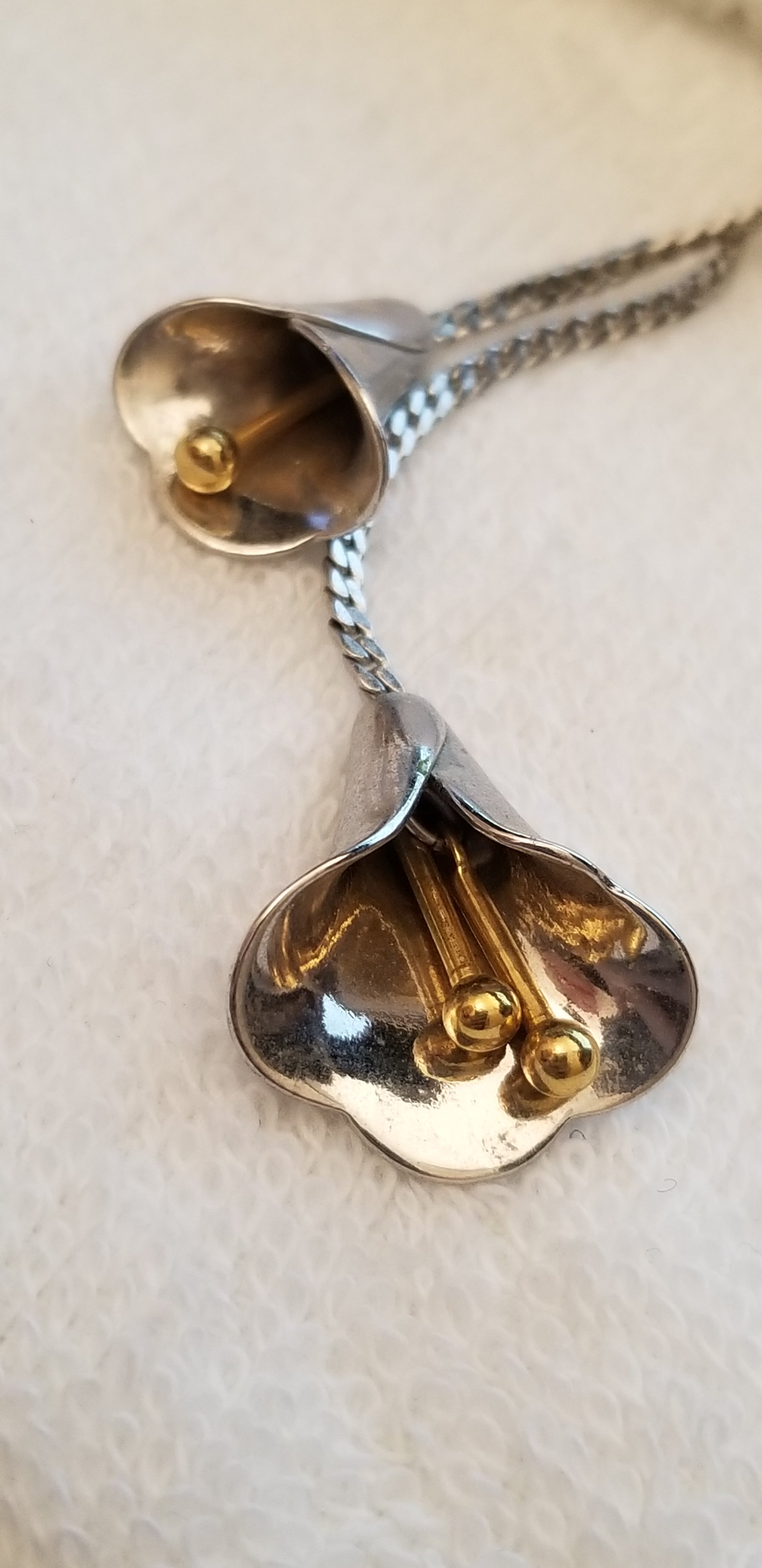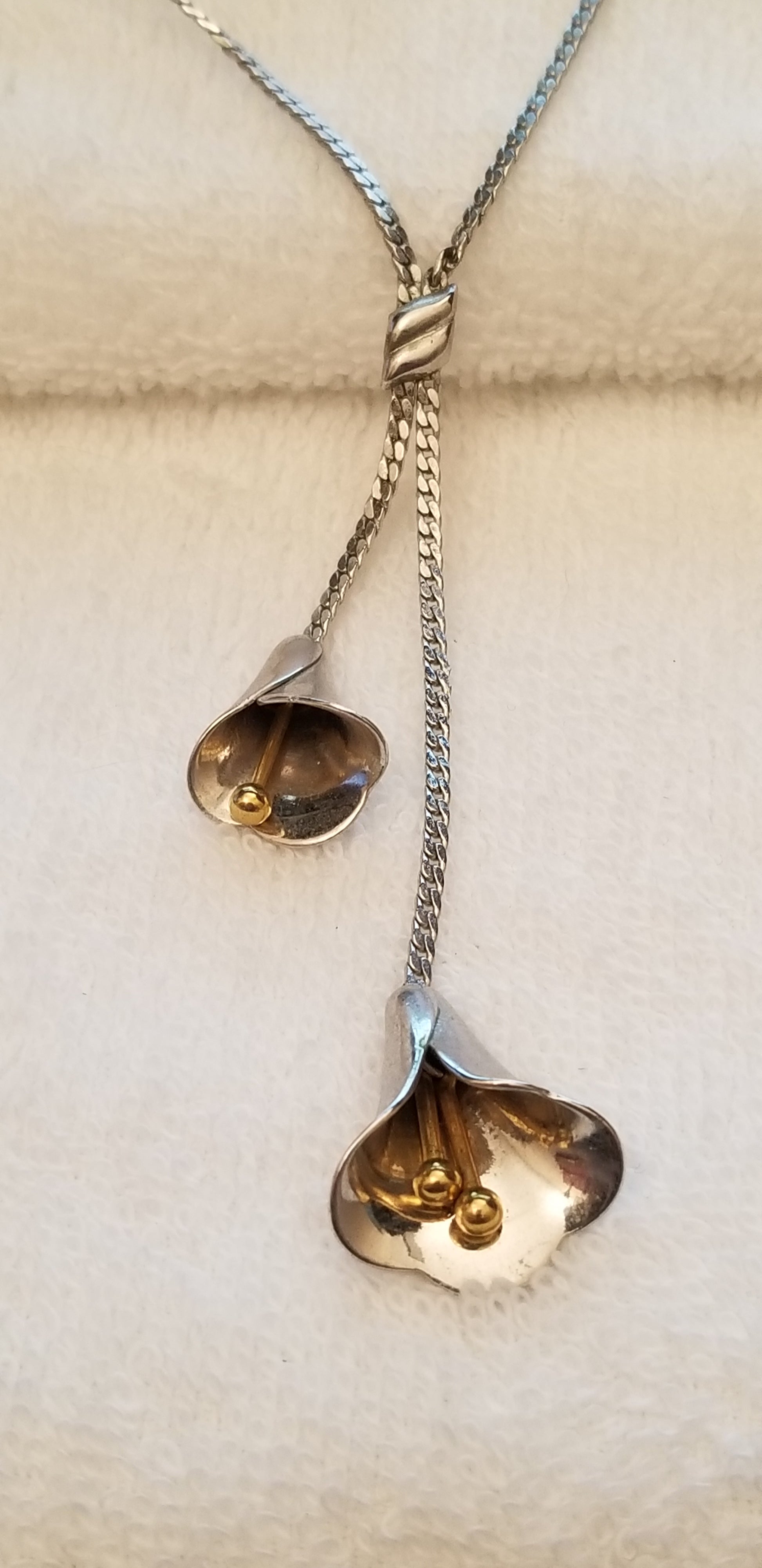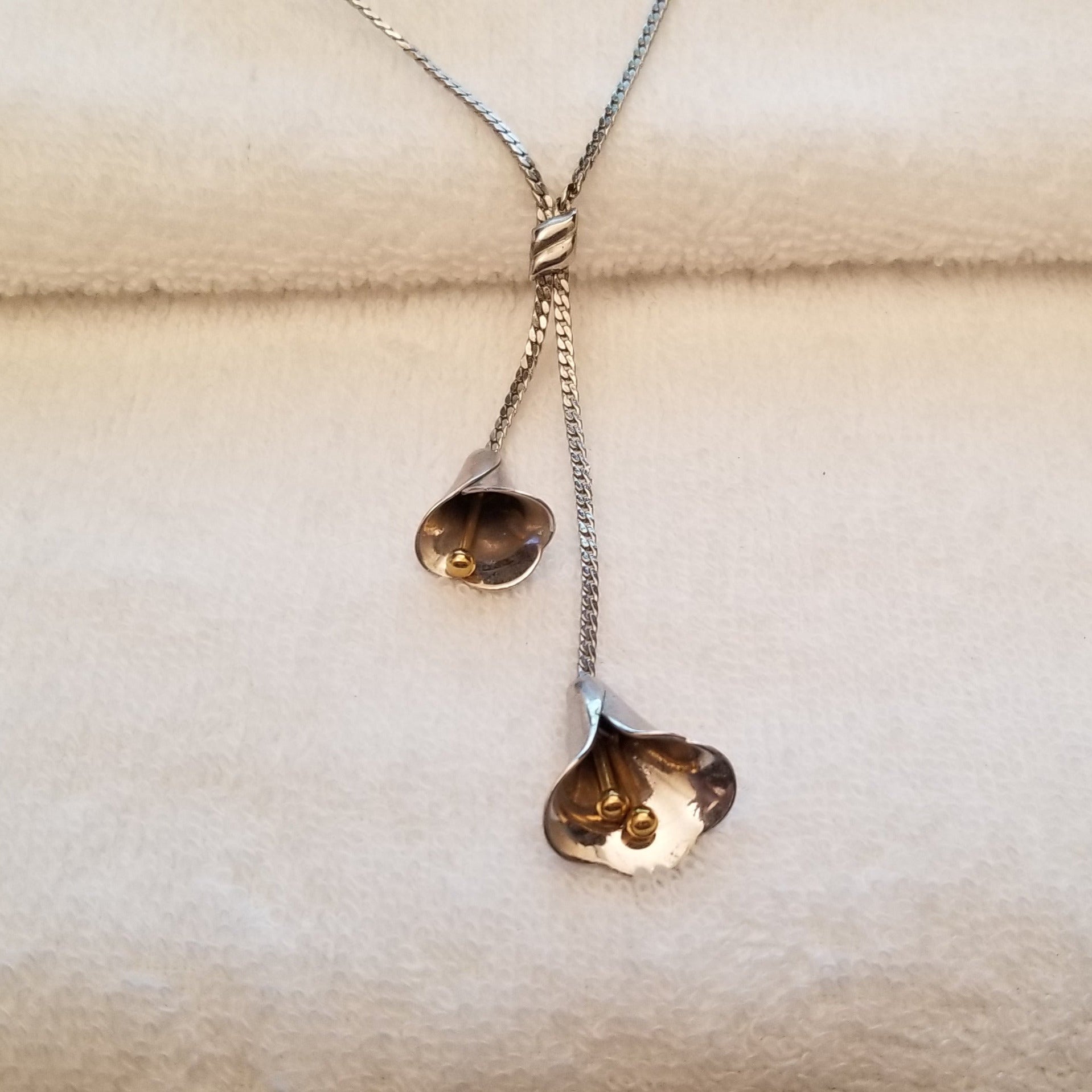 Vintage Avon Lily Lariat Necklace - Silver Calla Lilies & Gold Stamens