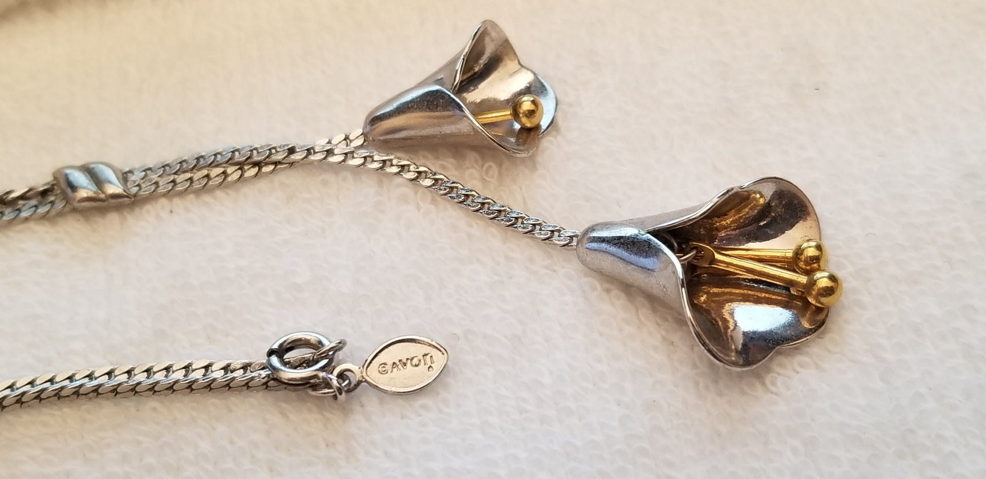 This elegant lariat necklace is signed Avon, and is from the 1978 catalog. It is called the Lily Lariat and features two shiny silver-tone calla lilies with dangling gold stamens -- it has a pretty, stylized Art Nouveau revival look. The flat silver-tone chain measures 22 inches long and the flowers hang down 3 inches below that.