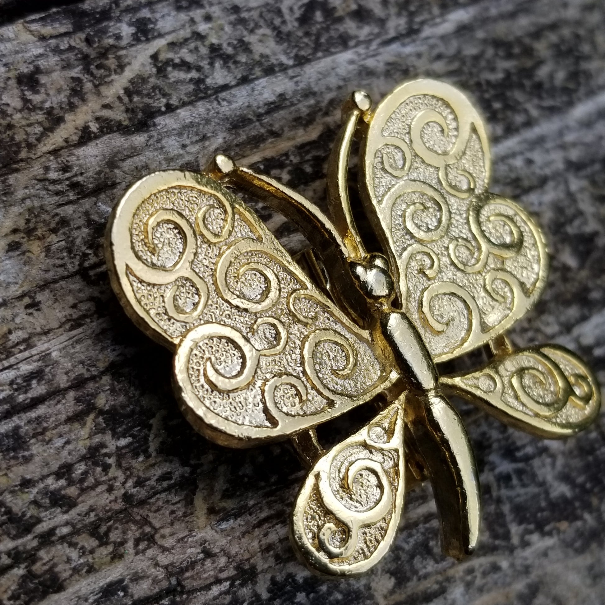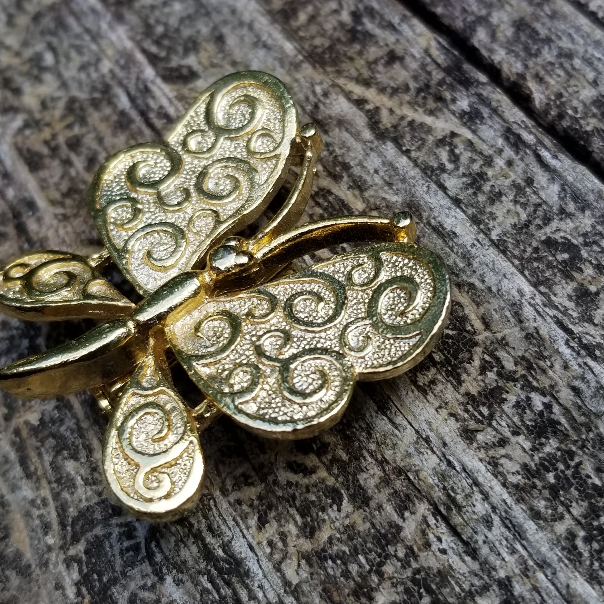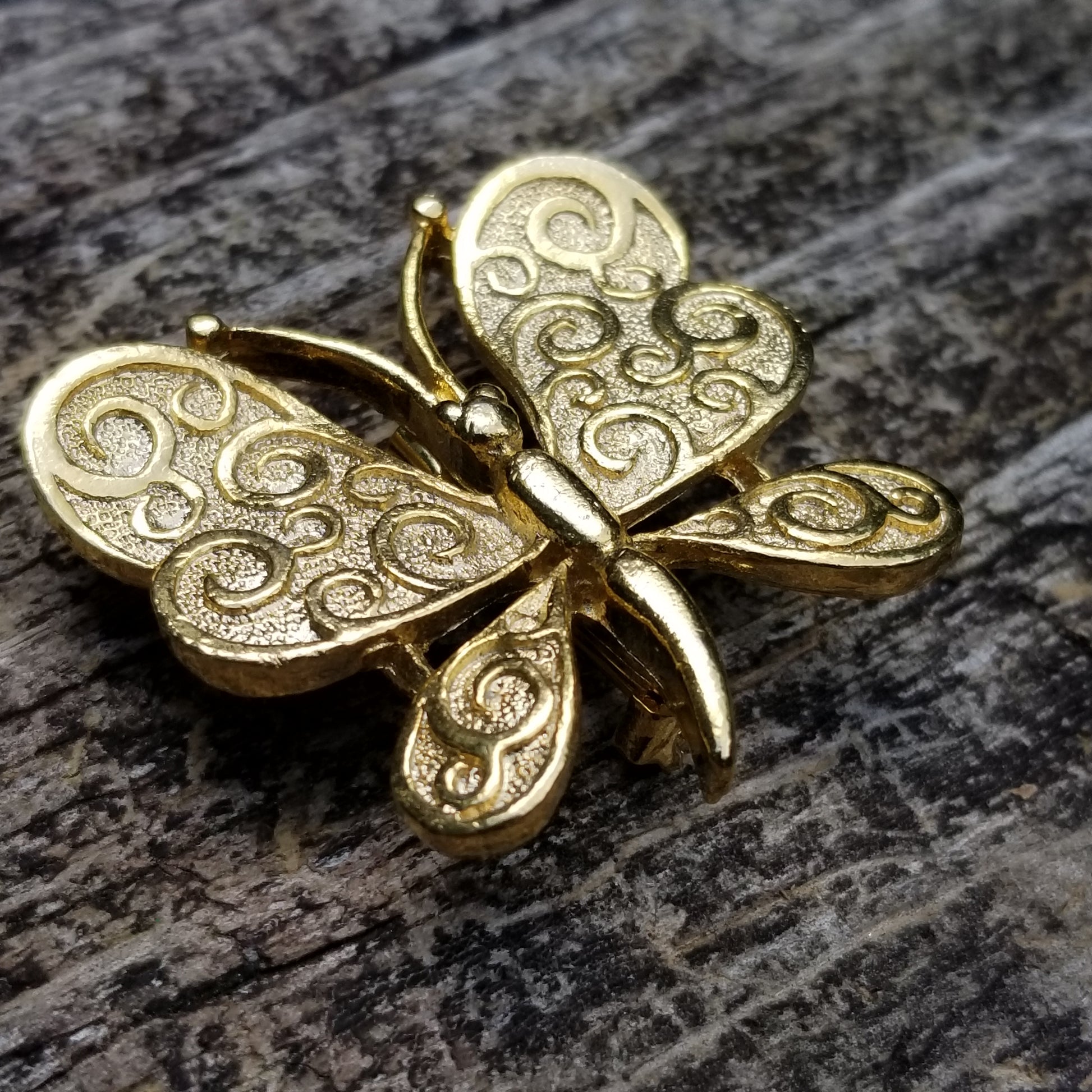 You'll get a beautiful vintage vibe with this butterfly-shaped pin! This gorgeous, gold-tone accessory is perfect for adding subtle flair to your outfit. An amazing statement piece that'll definitely make someone take a second look! 🦋